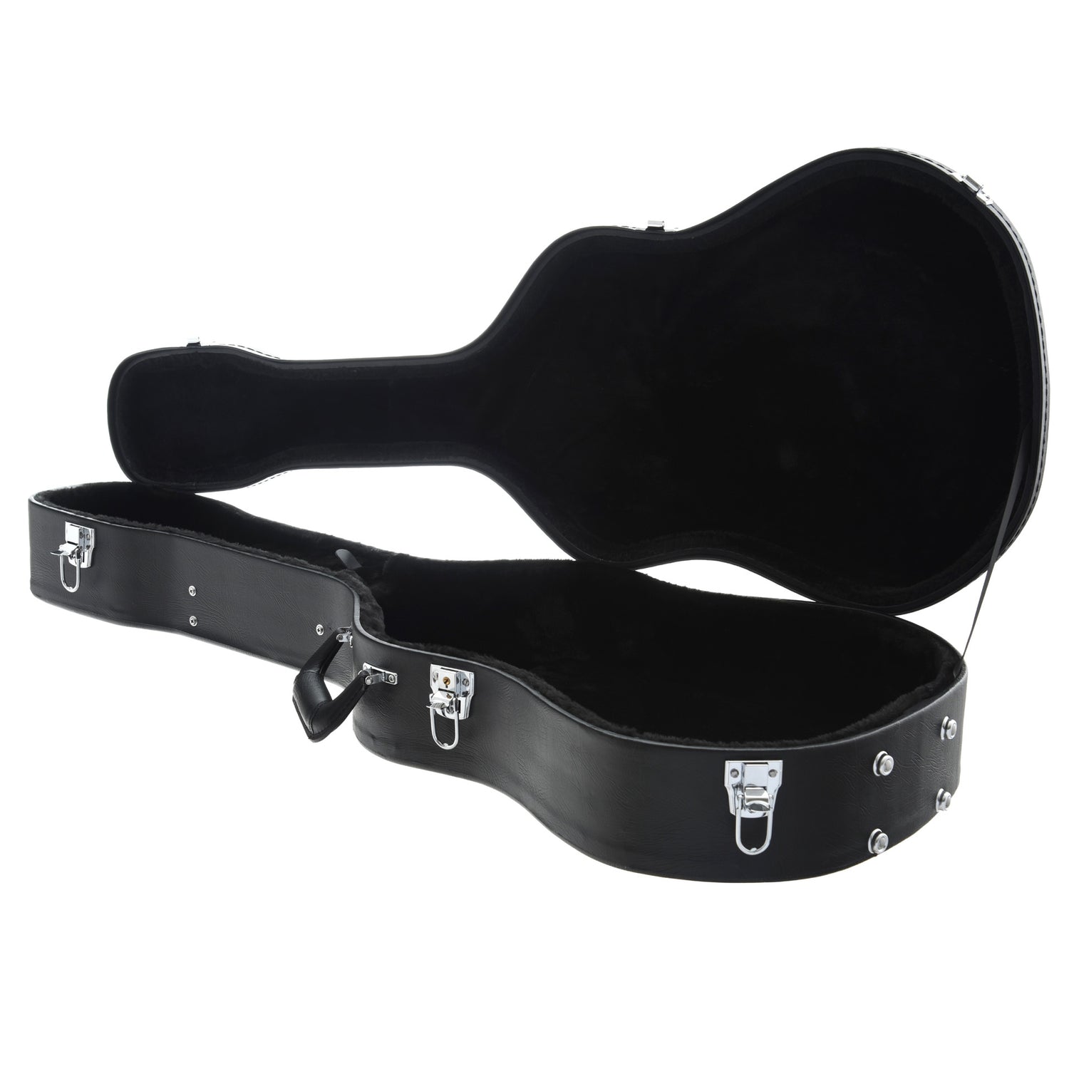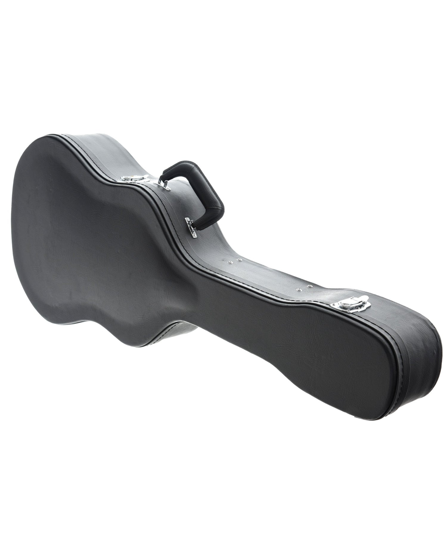 Designed for squareneck resonator guitars, this 5-ply shaped wooden shell case features an arched top, black leather-look exterior, black plush padded interior, accessory box, nickel plated hardware, and sturdy leather covered handle.