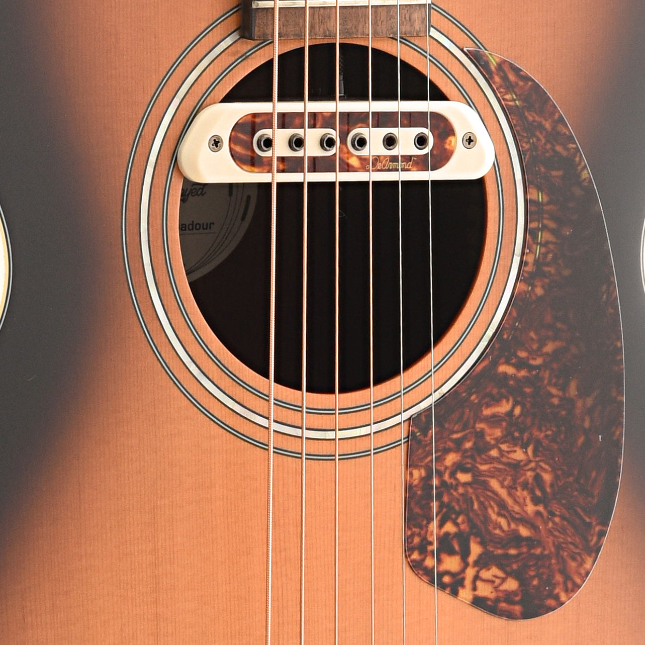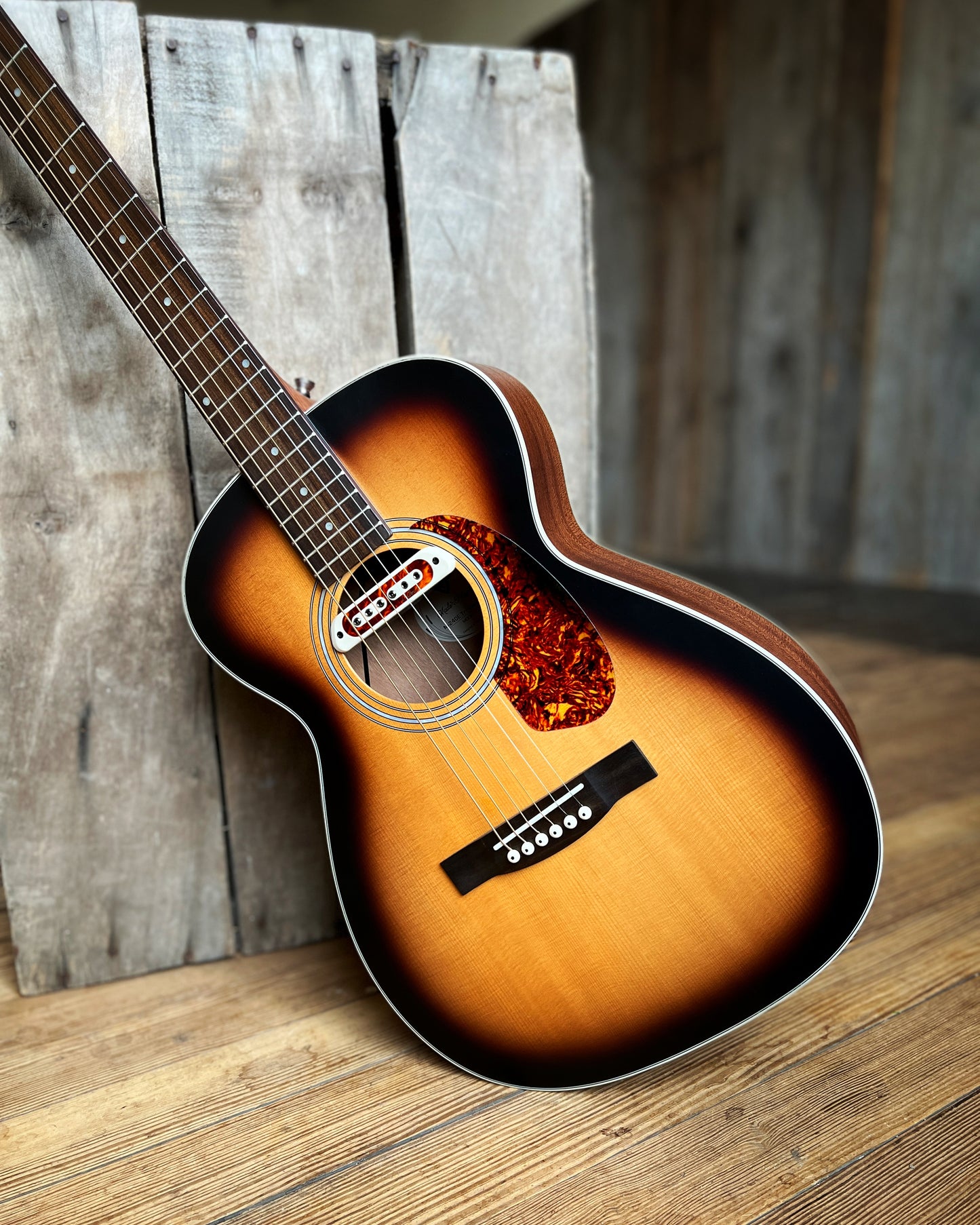 Built with solid spruce top, mahogany sides, and arched mahogany back, the sunburst M-240E Troubadour has a comfortable body and distinctive voice. Guild signature arched back design allows for great volume and projection, long sustain, and a lush, full sound. Comes equipped with DeArmond Tone Boss soundhole pickup.