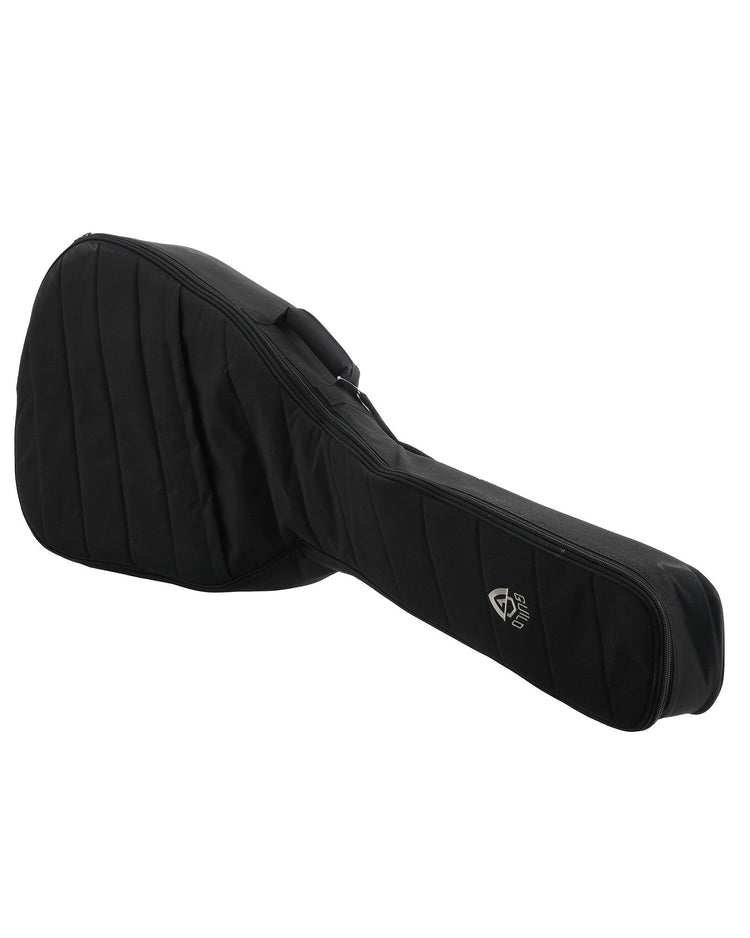 Fits Guild Acoustic Bass. Durable black nylon zippered bag with dense padding and neck rest, zippered exterior accessory pocket, embroidered Guild Logo. Soft interior lining (with heavier duty material for abrasion protection at peghead and bridge). Padded handle, backpack straps.