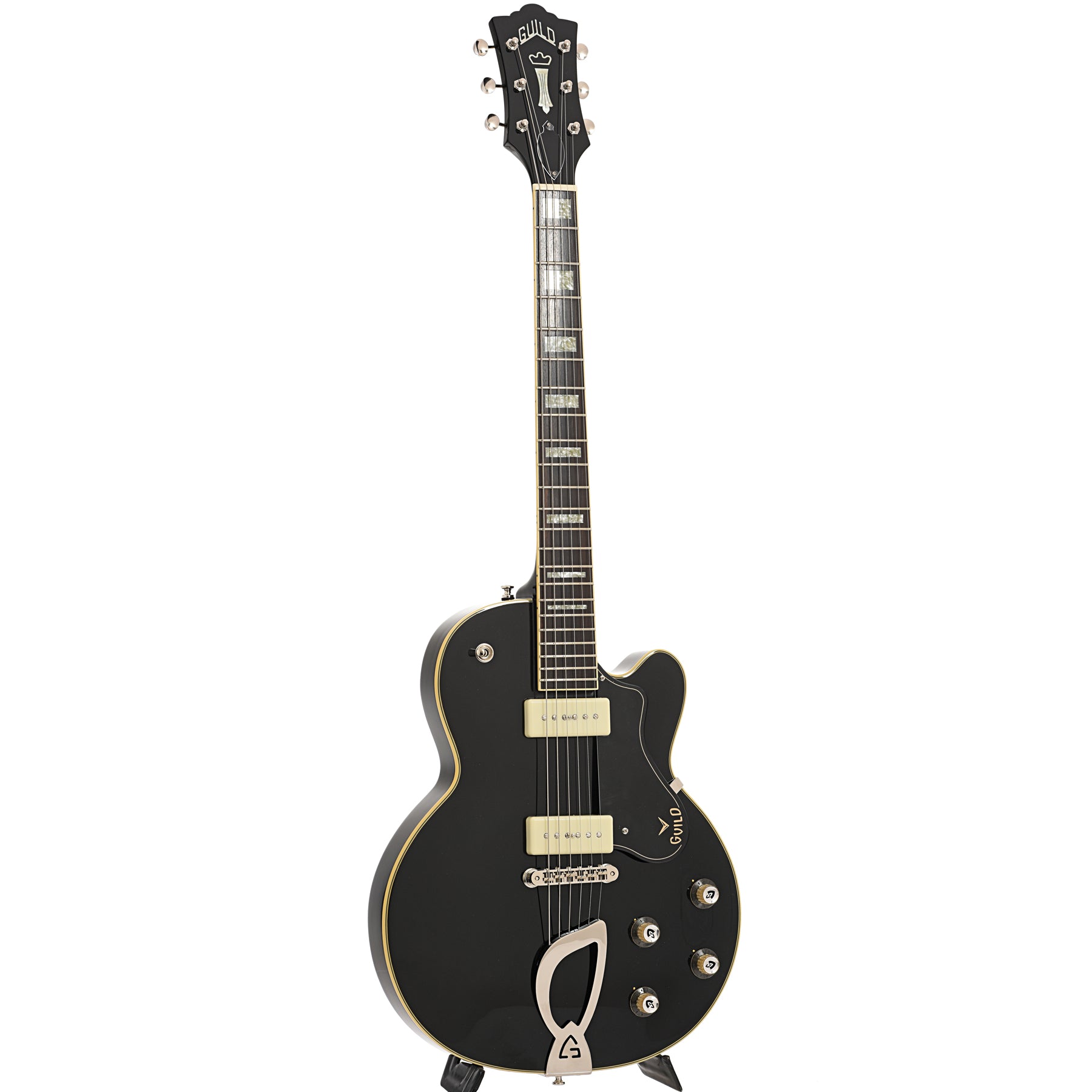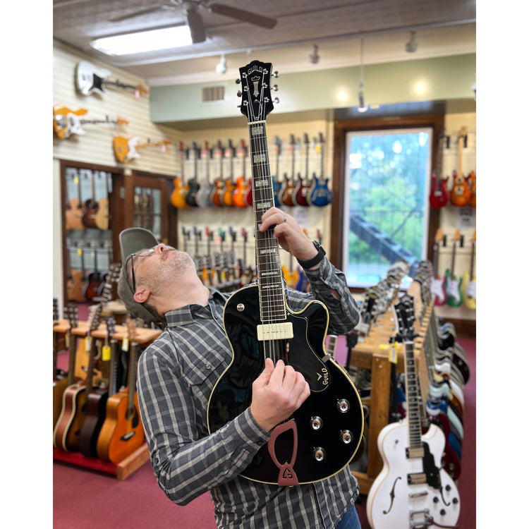 Back for a limited time in black. The compact and lightweight Guild M-75 Aristocrat pays homage to Guild's early 1950s model, with a gracefully sculpted single-cutaway hollow body specifically designed to produce the resonance of a larger instrument. Other premium features include a pair of great-sounding Franz P90 Soapbar pickups and nickel hardware.