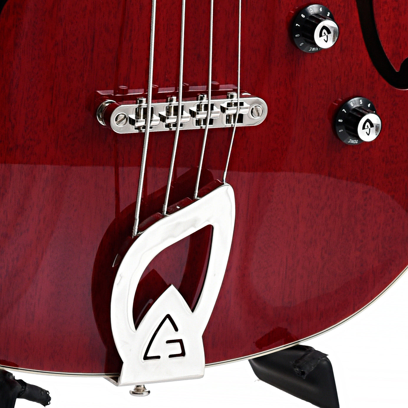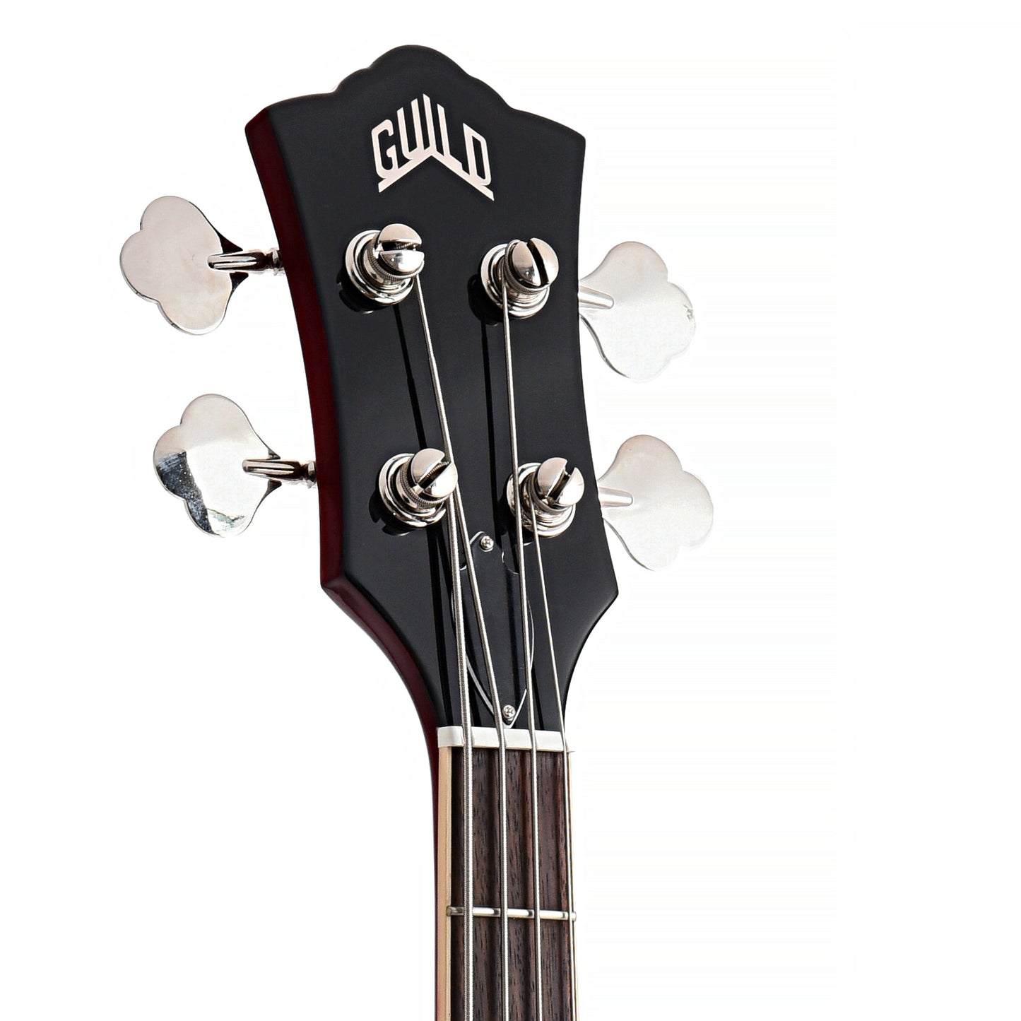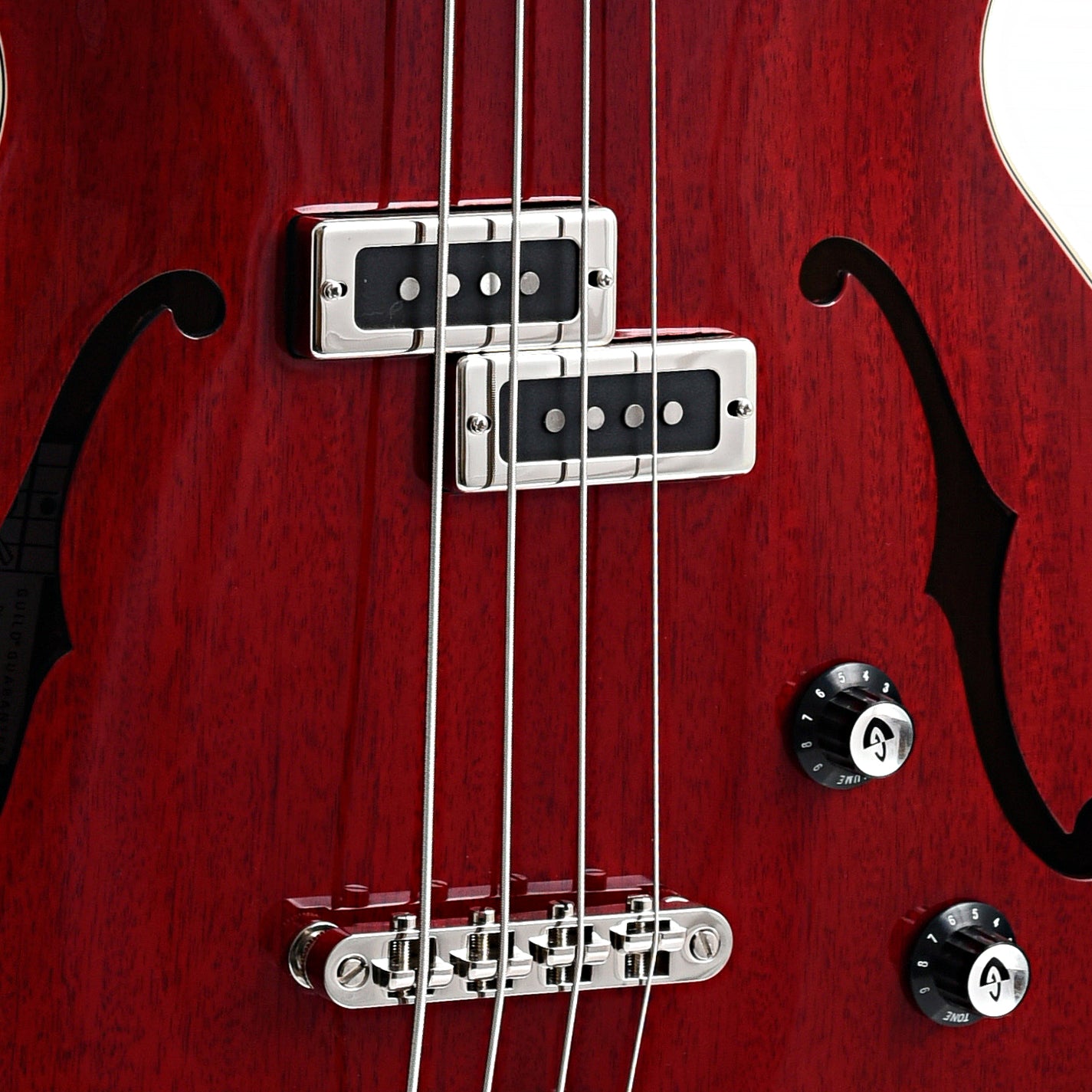 Slim semi-hollow double-cutaway mahogany body with tune-o-matic bridge, and Guild BC-1 BiCoil pickups. 30-3/4" scale. Volume knob doubles as a push-pull vintage switch, choose modern cutting bass tone or vintage wooly round tone. Harp tailpiece for retro Guild look.