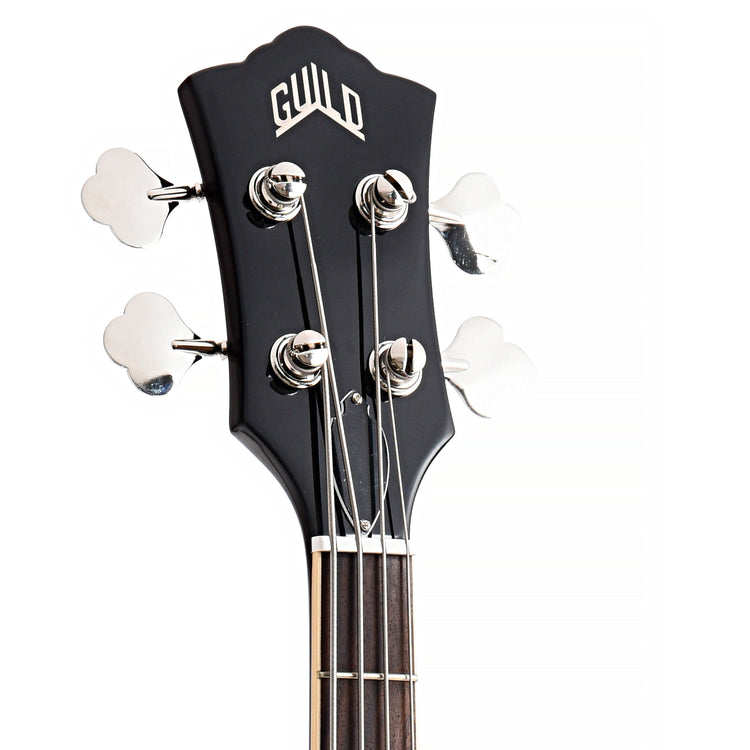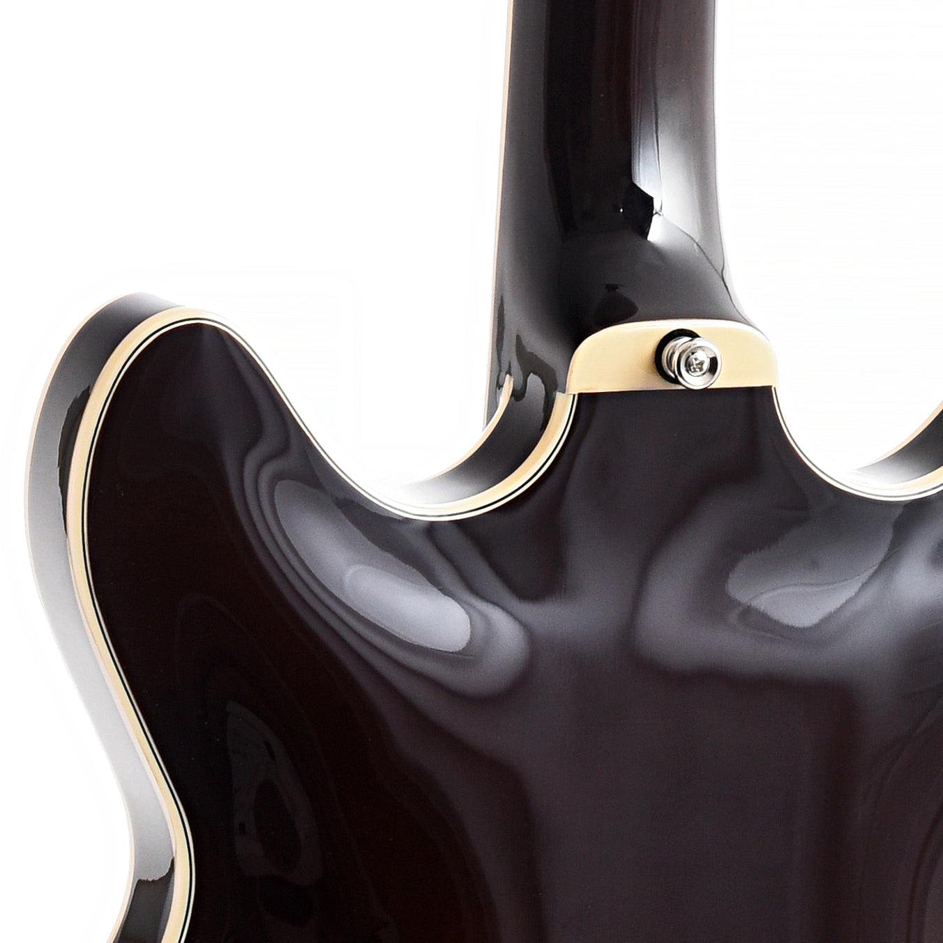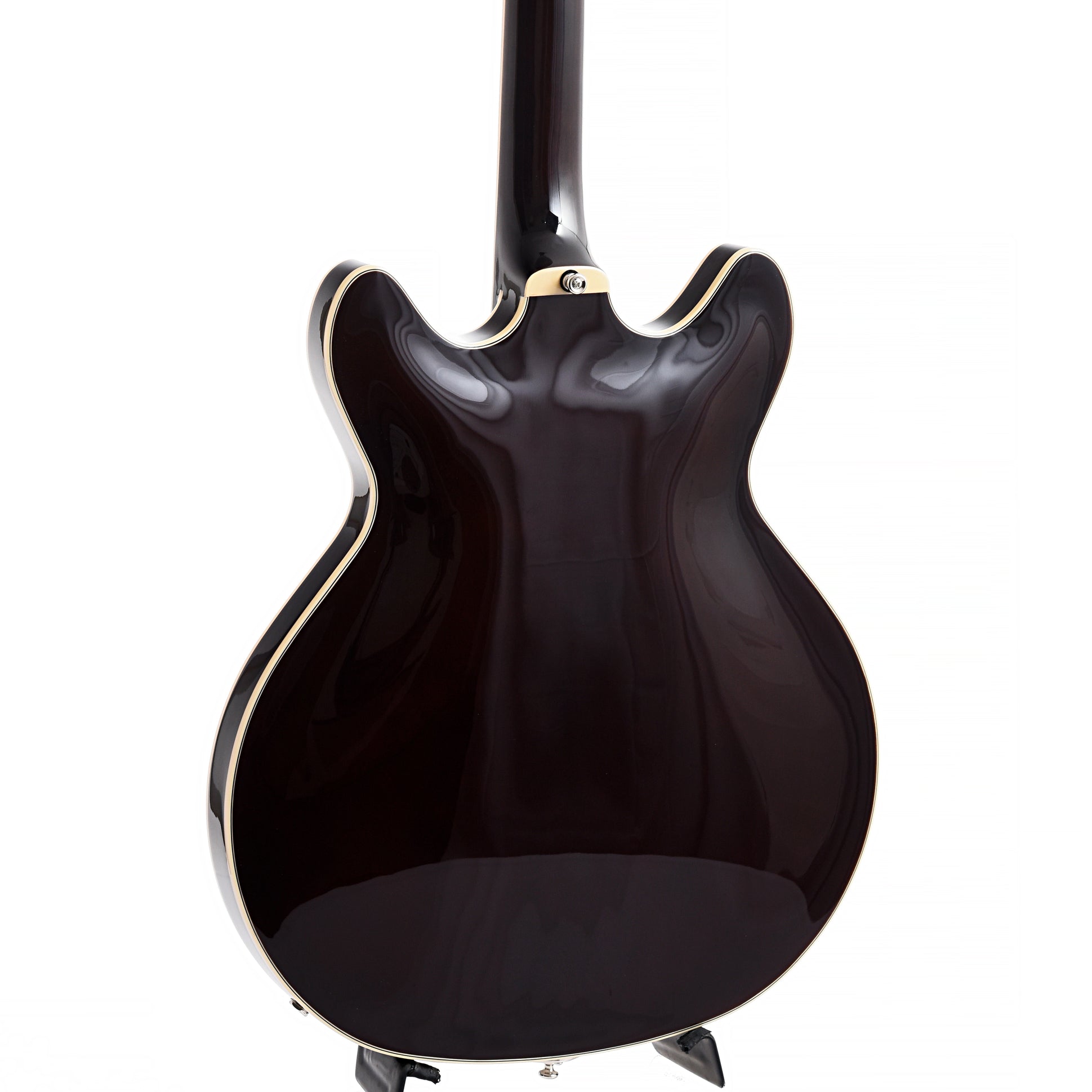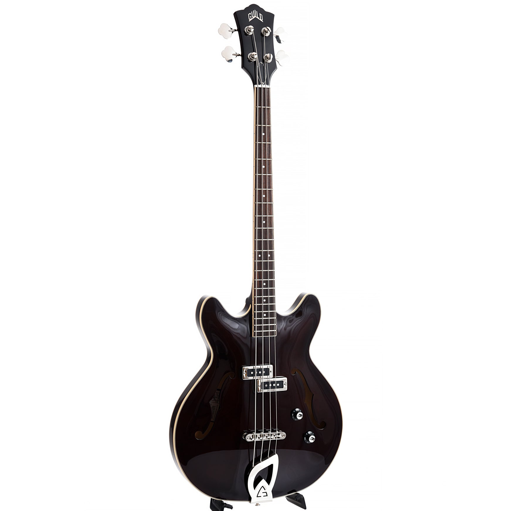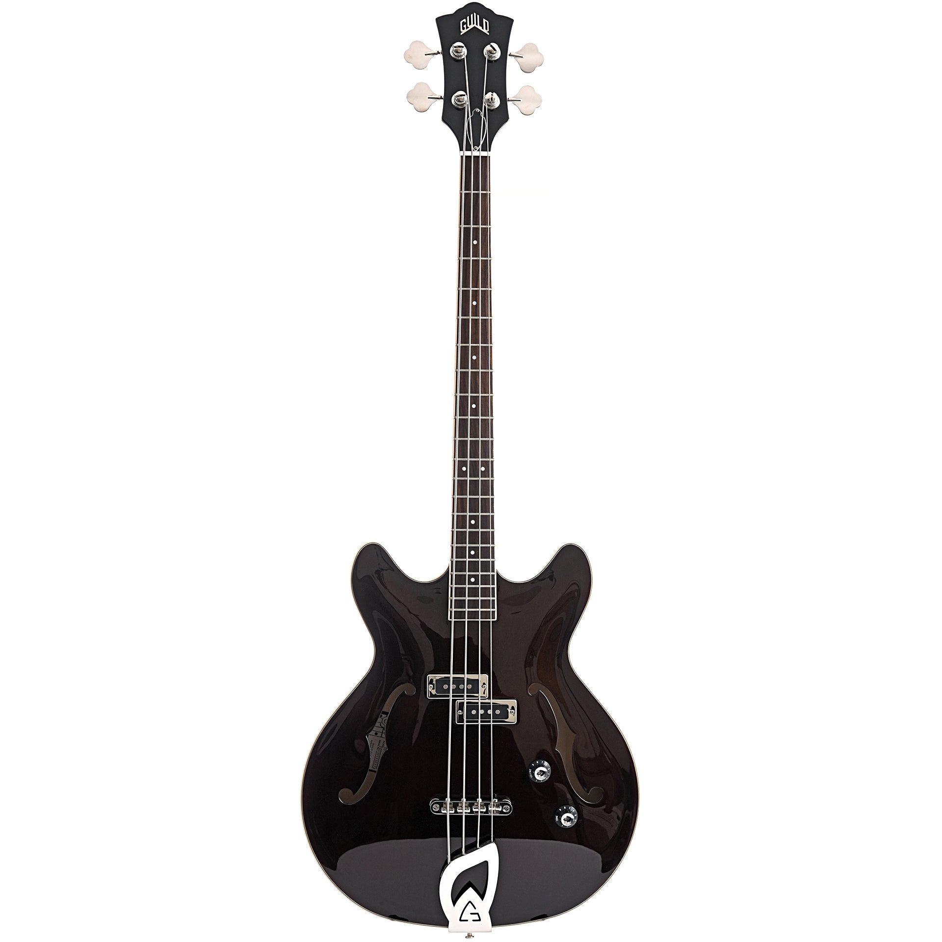 Slim semi-hollow double-cutaway body is all mahogany with a Vintage Walnut finish. 30-3/4" scale. Tune-o-matic bridge, Guild BC-1 BiCoil pickups and a volume knob that doubles as a push-pull vintage switch. Choose a modern cutting bass tone or vintage wooly round tone. 30-3/4"scale. Harp tailpiece for retro Guild look.