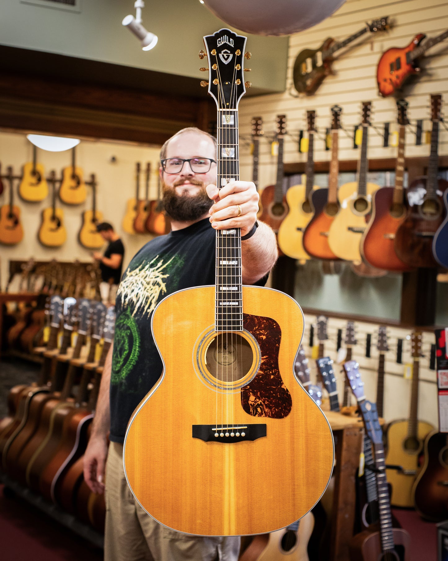 Iconic Guild jumbo with a big sound that cuts. The Guild F-55E features include a solid Sitka spruce top, flamed maple back & sides and an LR Baggs Anthem pickup system.