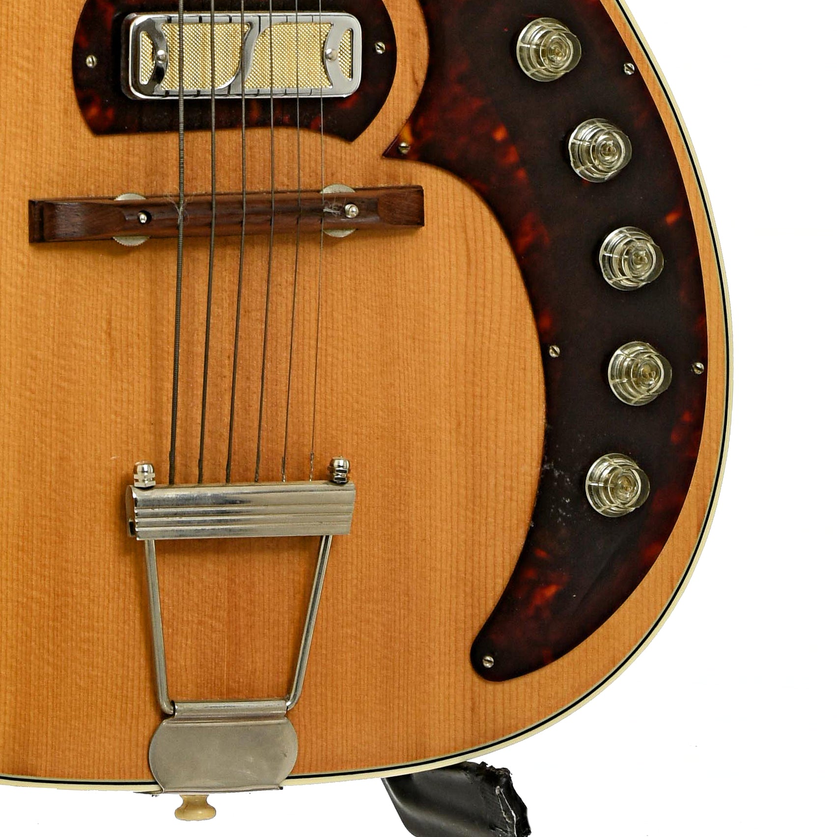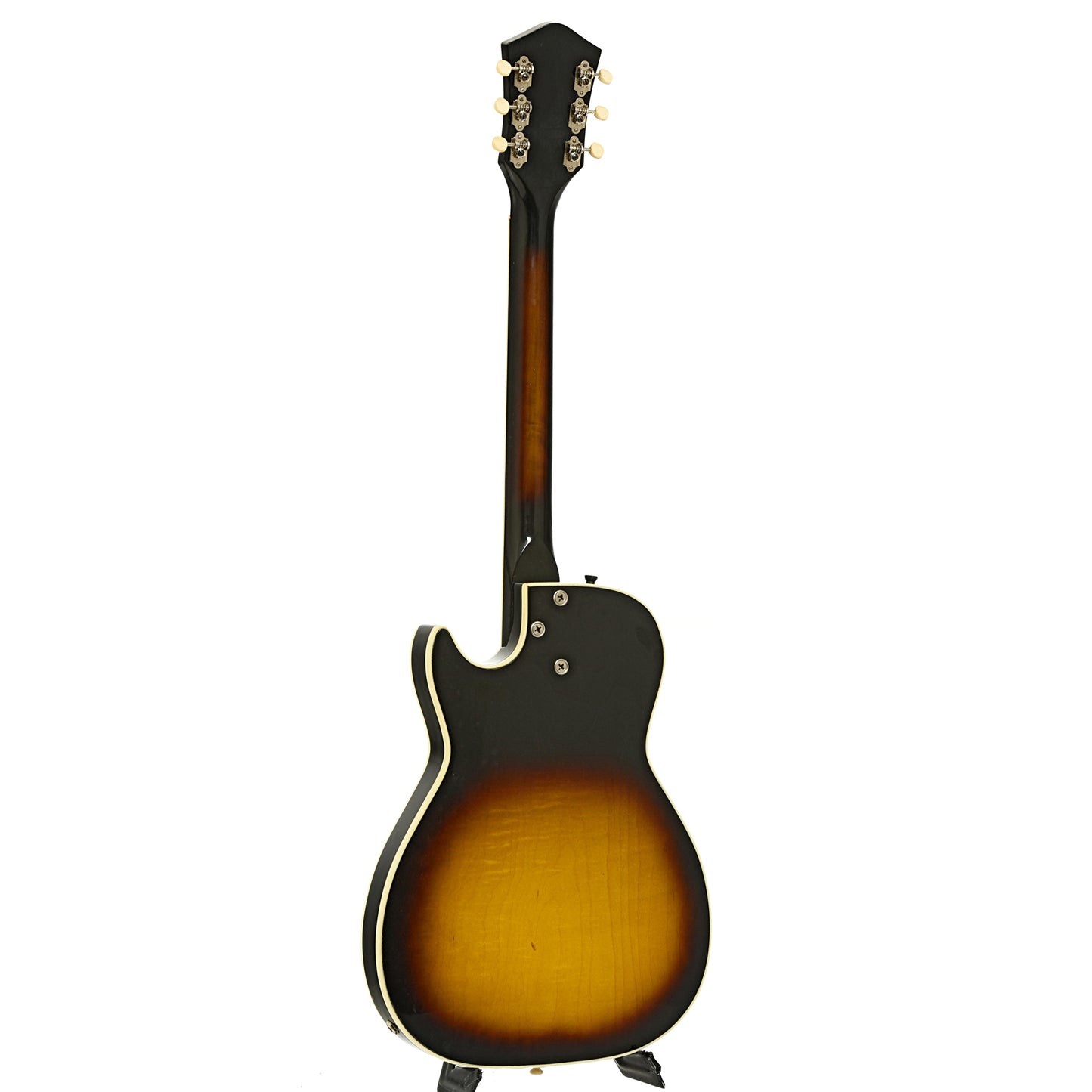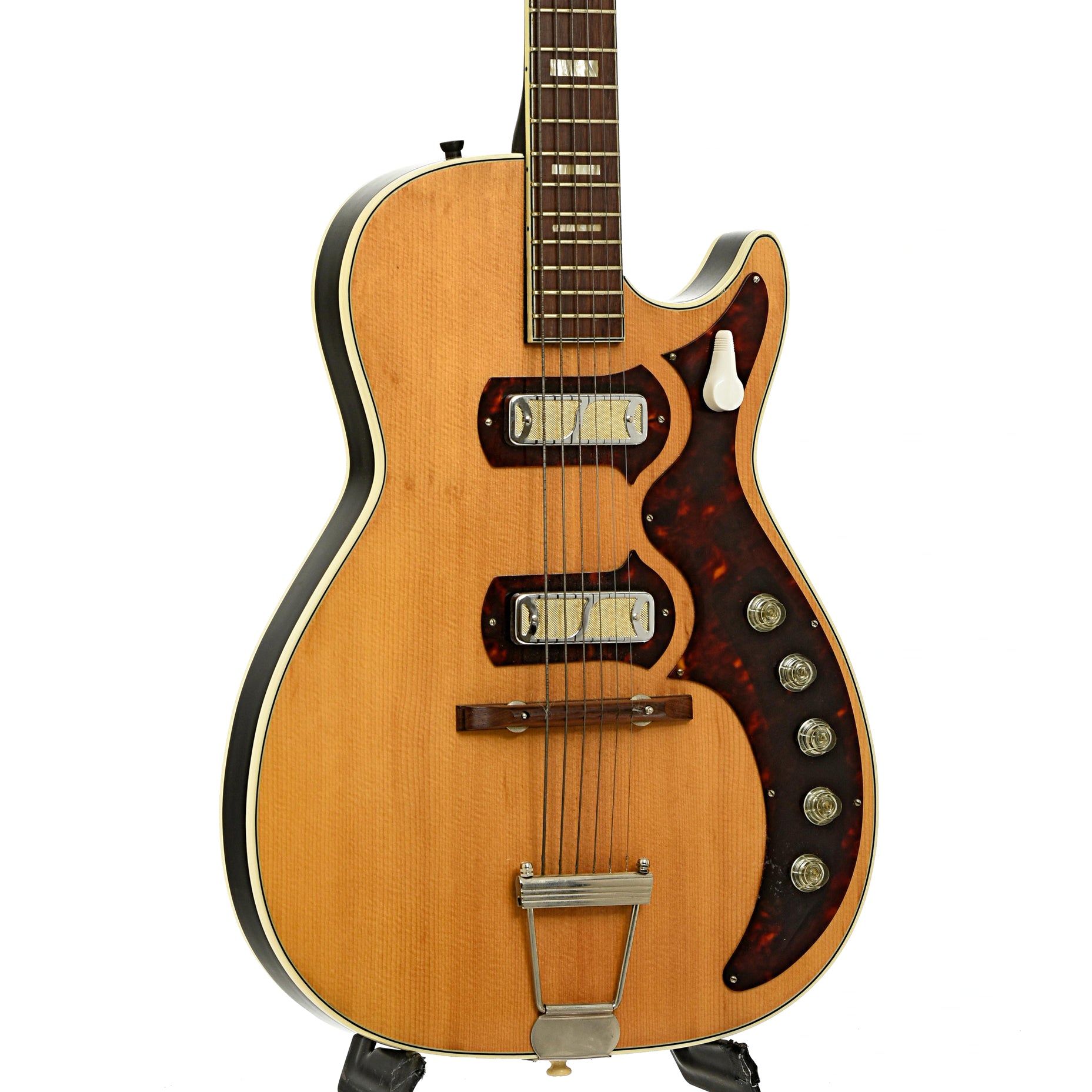 As played by Dan Auerbach, this Stratotone Jupiter will rocket you into the ranks of grooviness with its chambered maple body, Brazilian rosewood fingerboard and bridge, dual single coil pickups, lots of knobs, and lots of volume and tone! Original 2-tone chipboard case. Made in USA.
