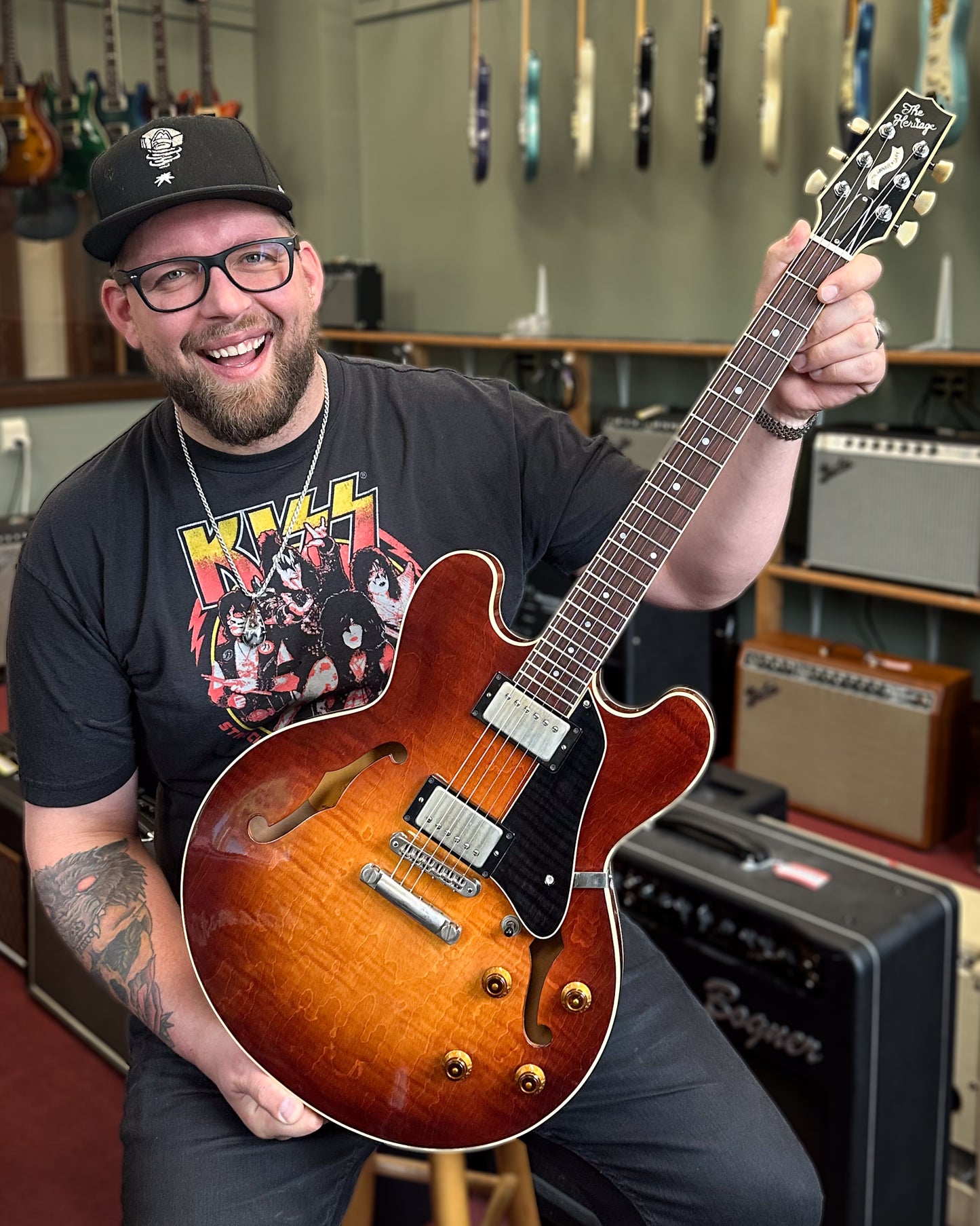 One classy semi-hollowbody, this Heritage 20th Anniversary features include a pretty tobacco sunburst finish on a bound maple body, a mahogany set neck, a TOM-style bridge and bound rosewood fingerboard. Equipped with Seth Lover humbucking pickups (signed "Seymour"). Big tone, easy playing! Original hard shell case. Built in Kalamazoo, USA. On consignment.