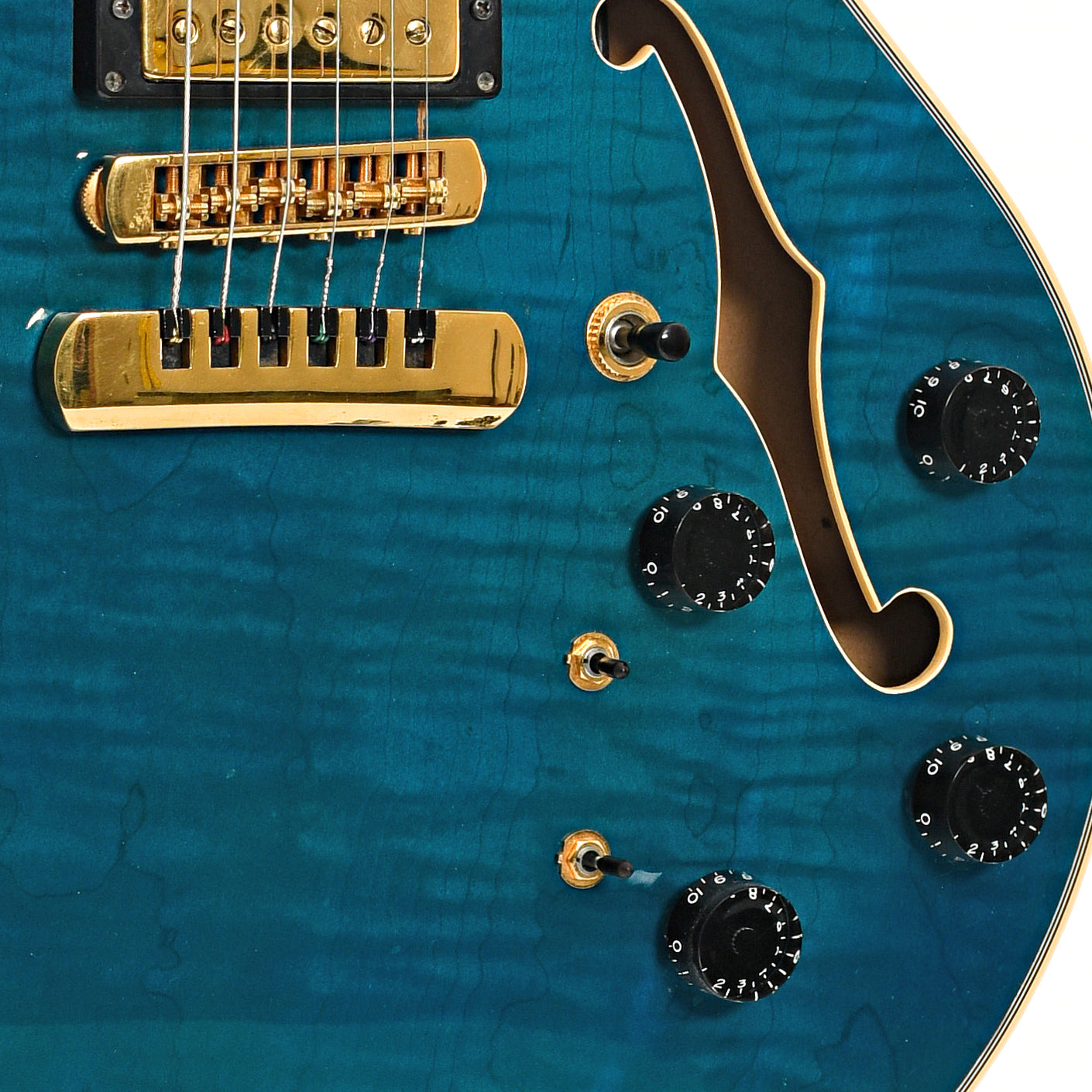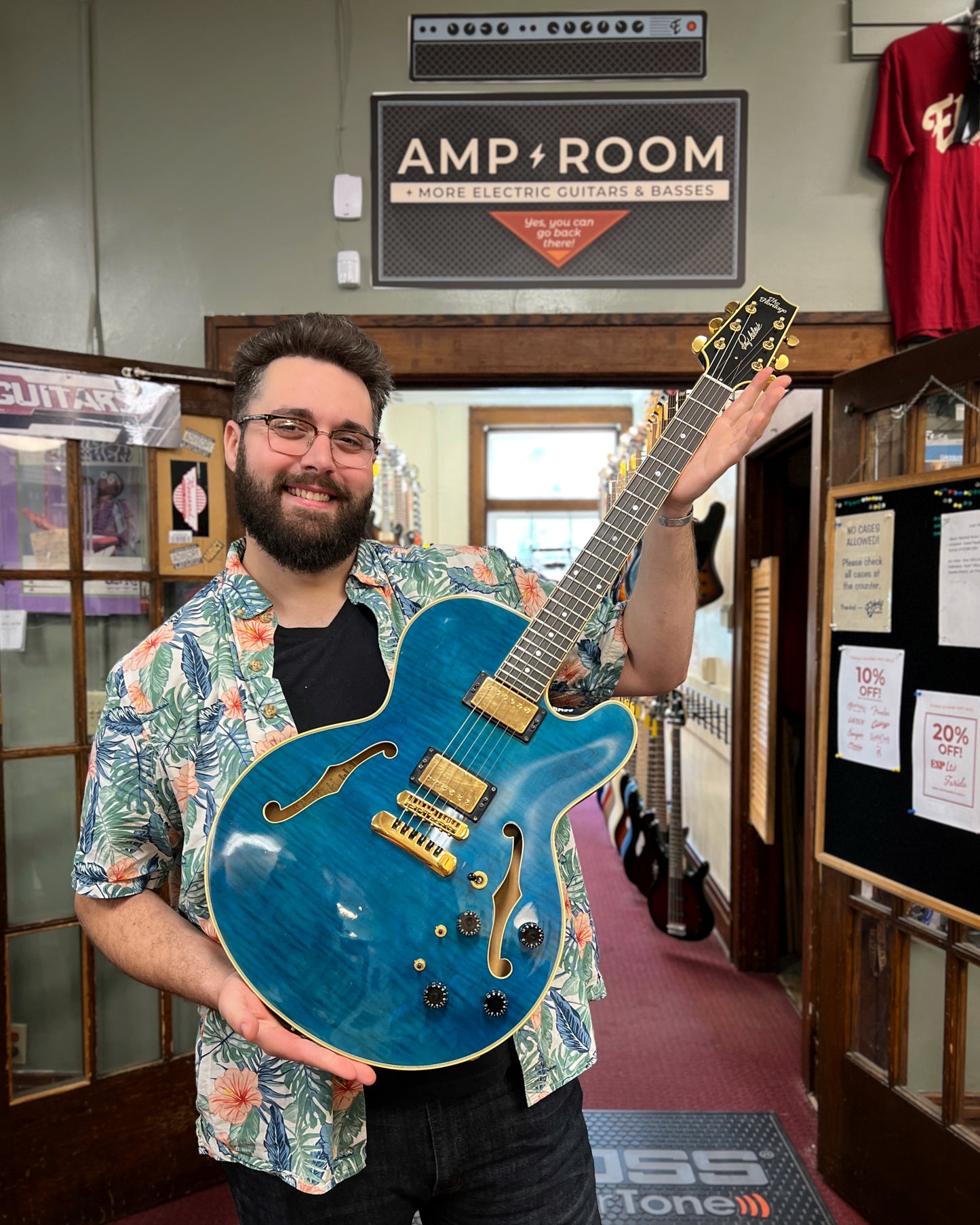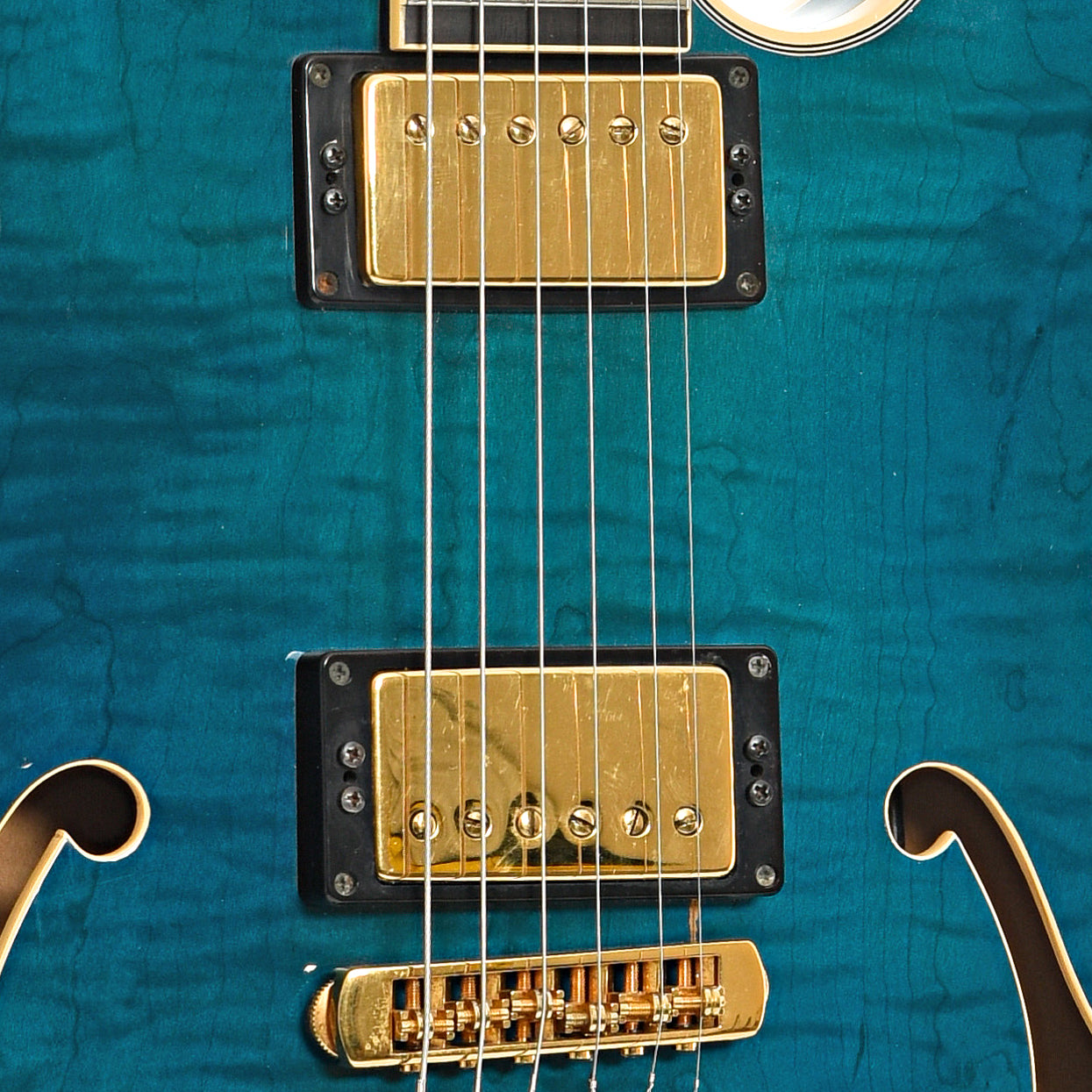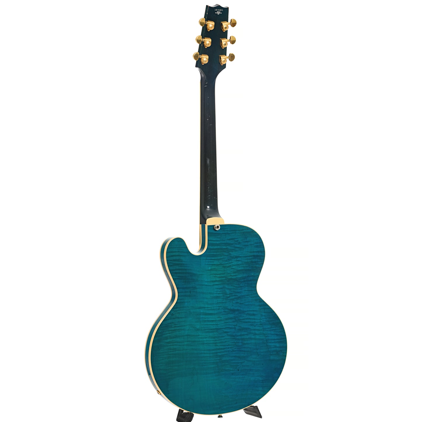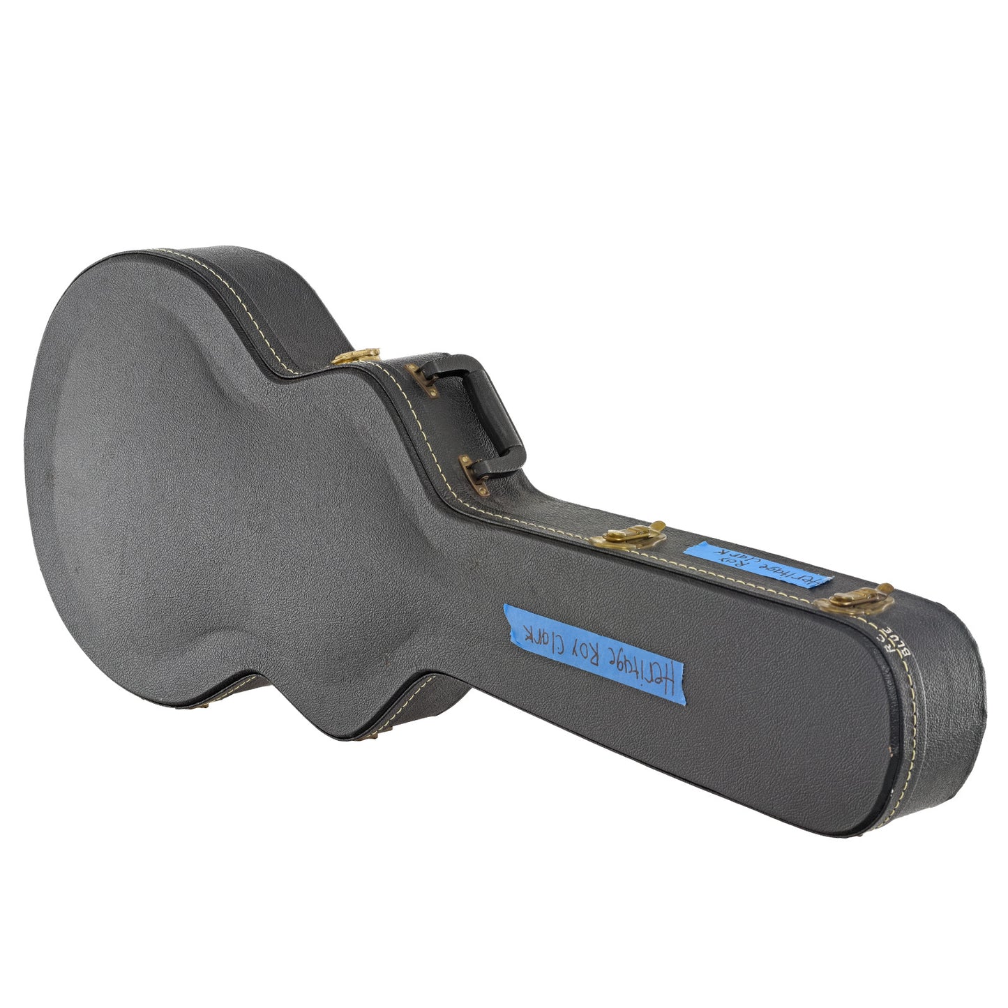 This Roy Clark Signature features a beautiful trans aqua finish on a bound flame maple body. Includes a venetian cutaway, bound f-holes, and ebony fingerboard. Equipped with dual Schaller humbucking pickups with coil-tap controls, with plenty of gold hardware. Original hard shell case. Made in USA.
