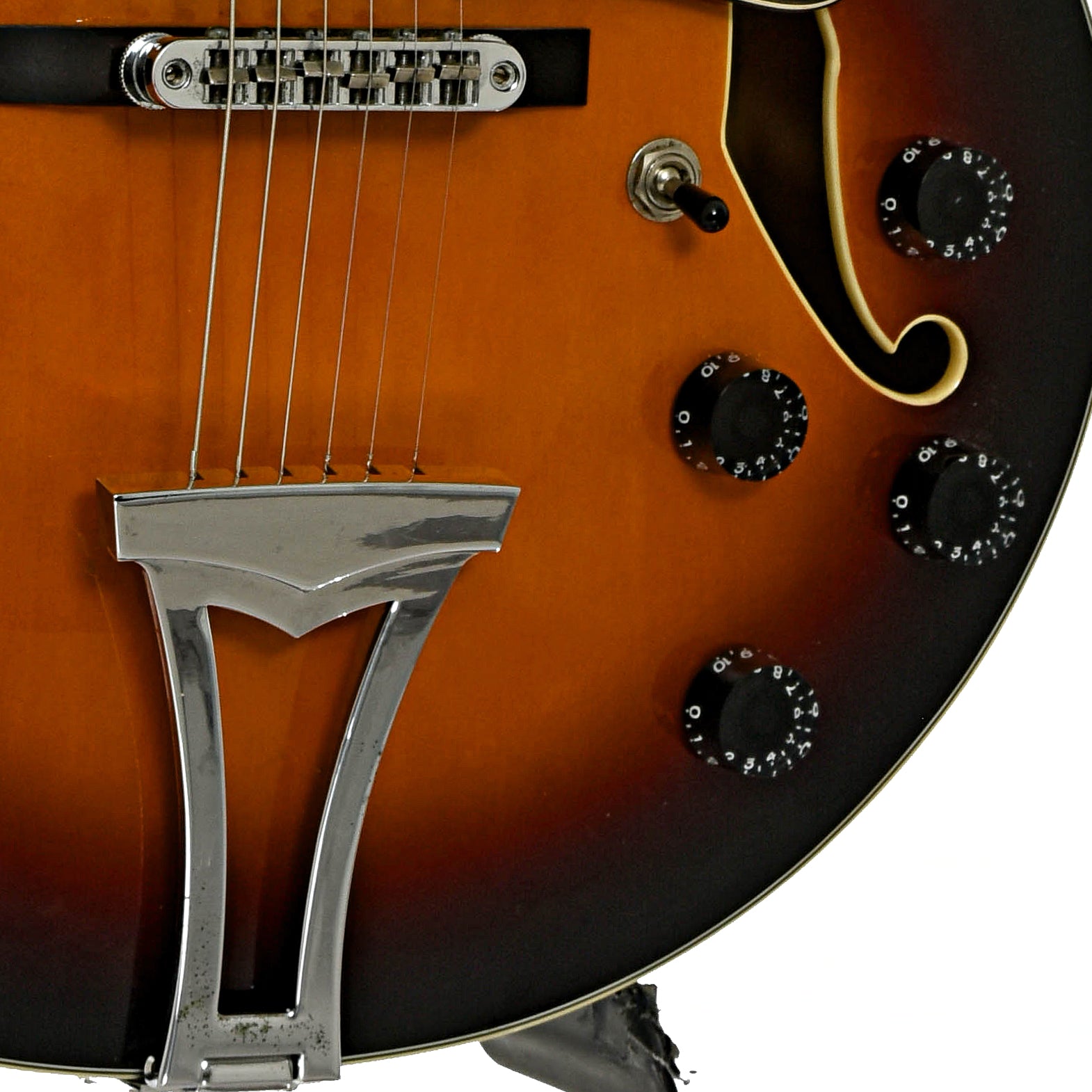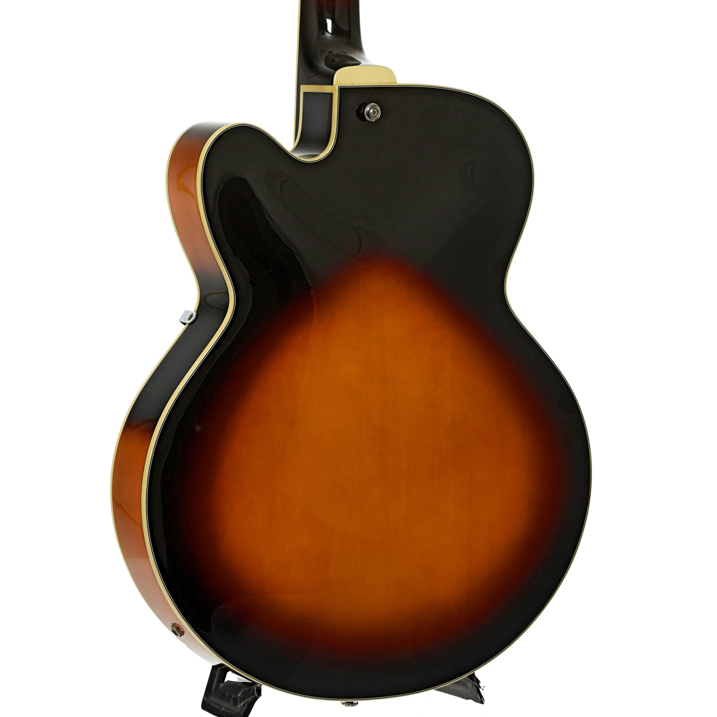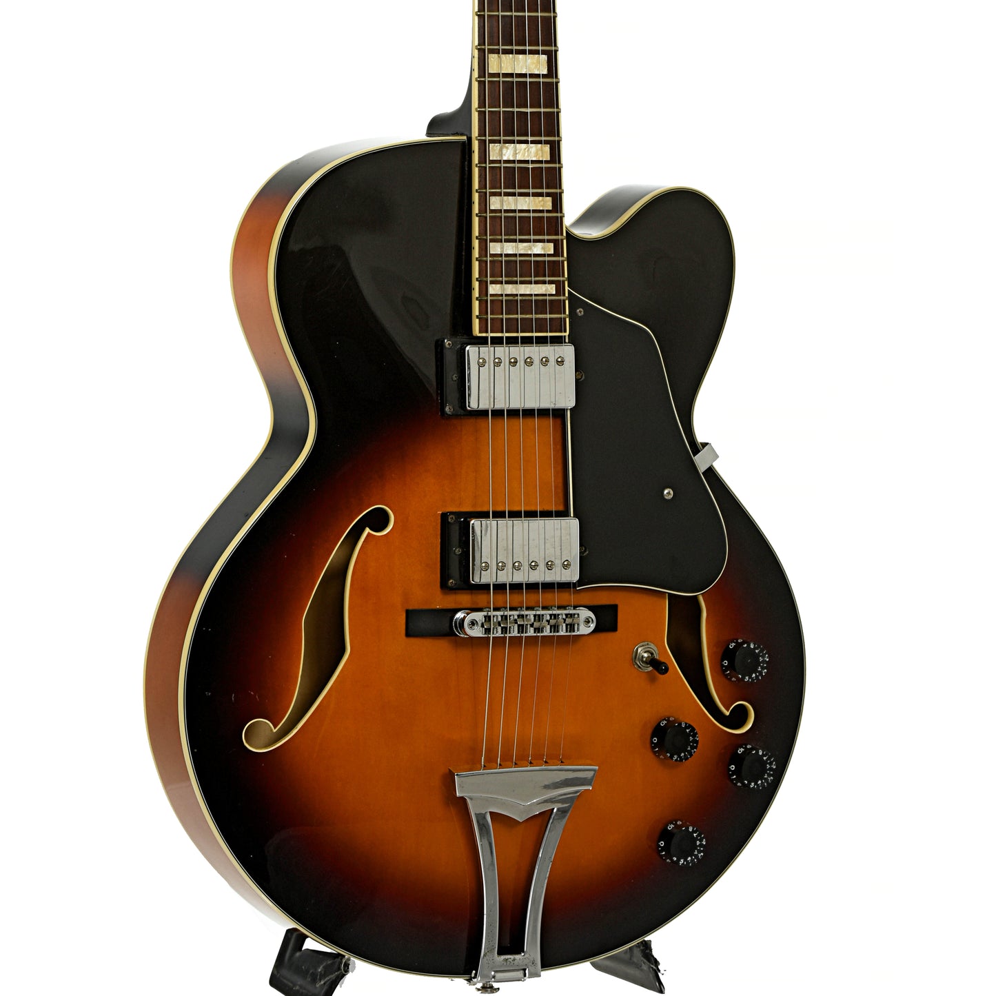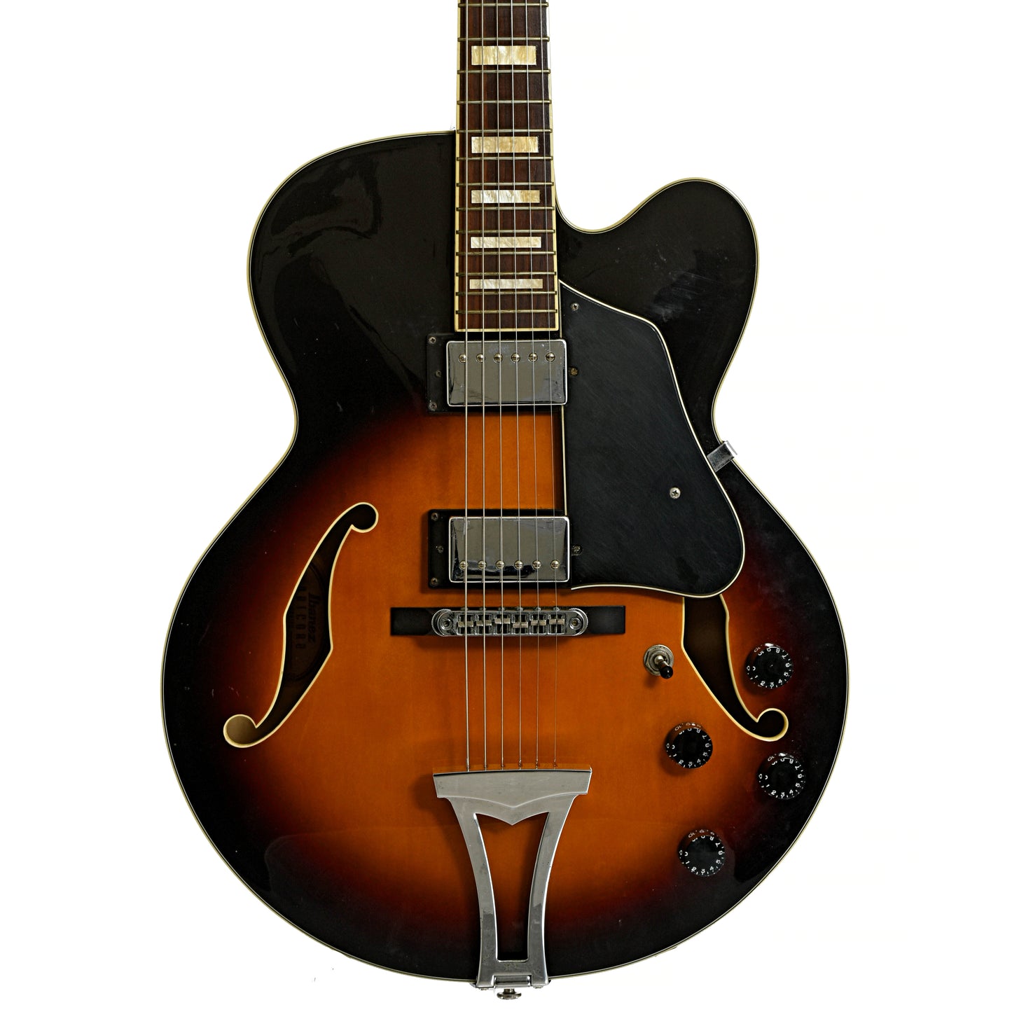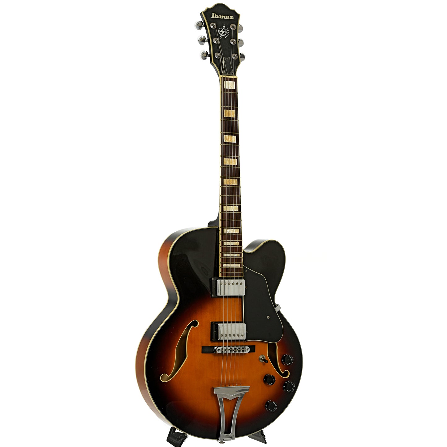 A bargain hollow body electric, this Ibanez Artcore Series AF75 features include gloss n sunburst finish, white-bound body, f-holes, headstock and fingerboard, maple top, back, and sides, 22 fret rosewood fingerboard with pearloid block inlays, 2 humbucking pickups. Includes flat lid wooden TKL hard shell case (gray lining).