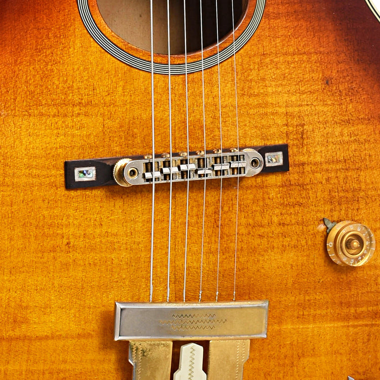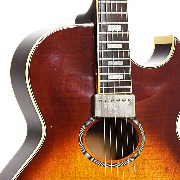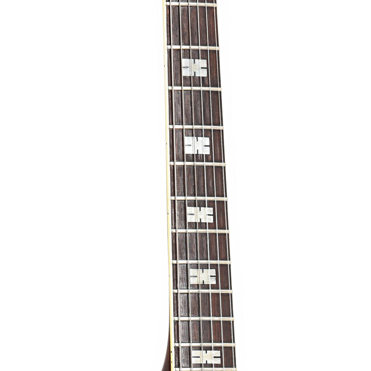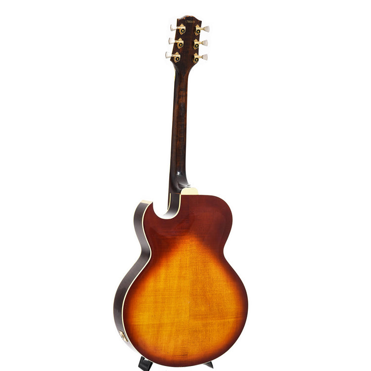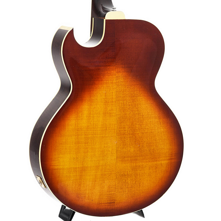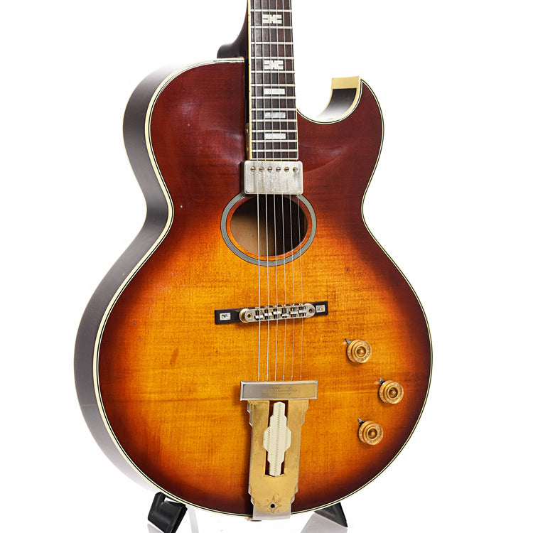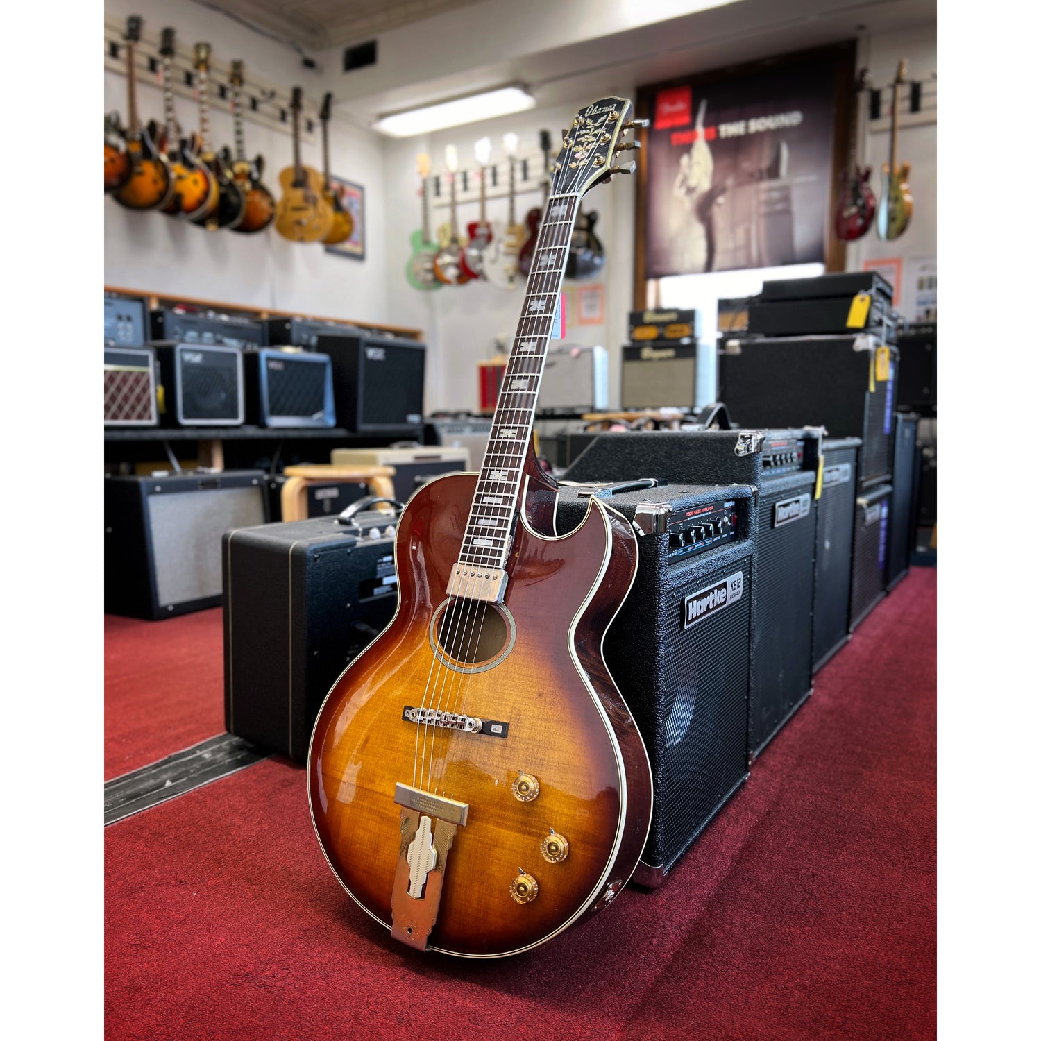 This 70's hollowbody by Ibanez features a flame maple body, humbucking pickup, and rosewood fingerboard. It also has a distinctive oval soundhole and a trapeze tailpiece. Humbucking pickup. Quick playing, fat sounding! Hard shell case (orange lining). Made in Japan. On consignment.