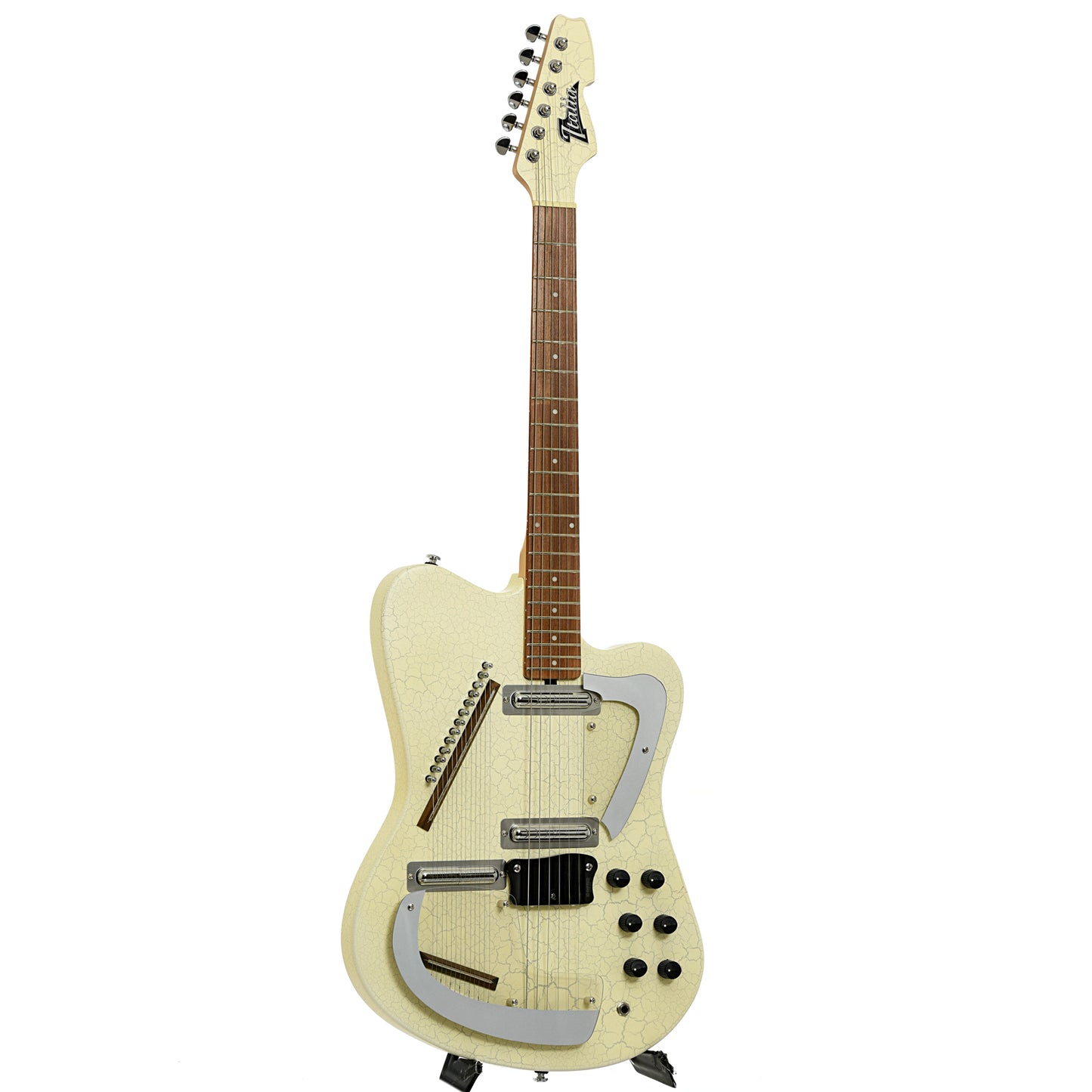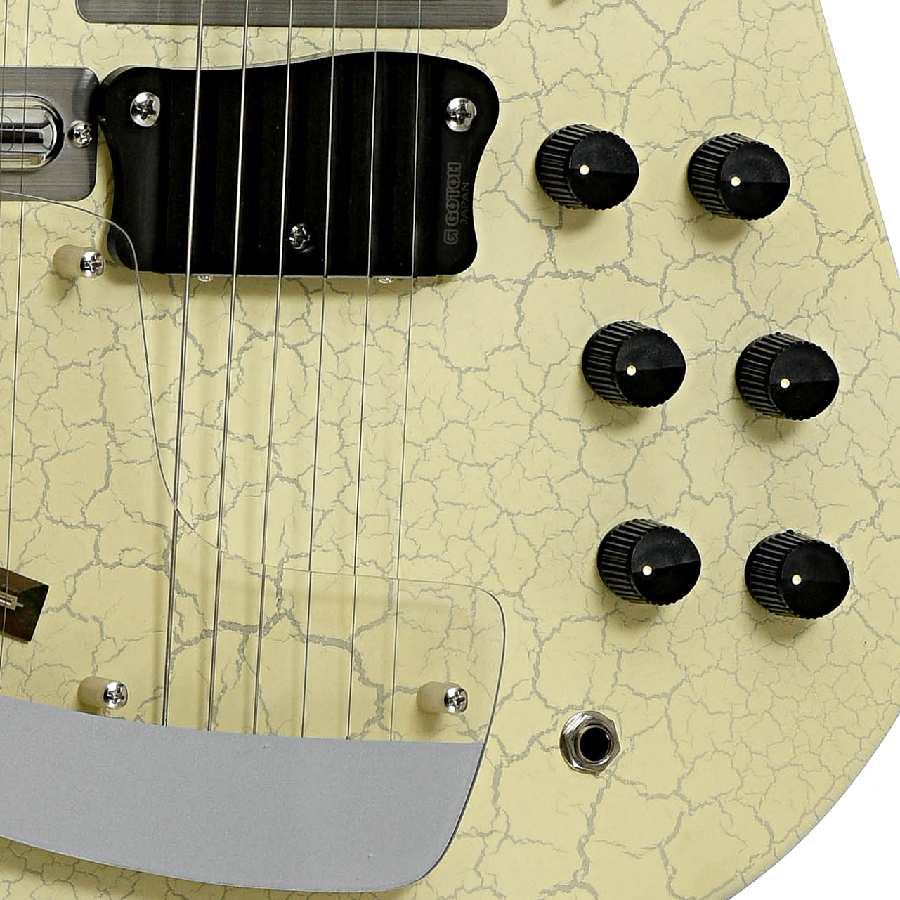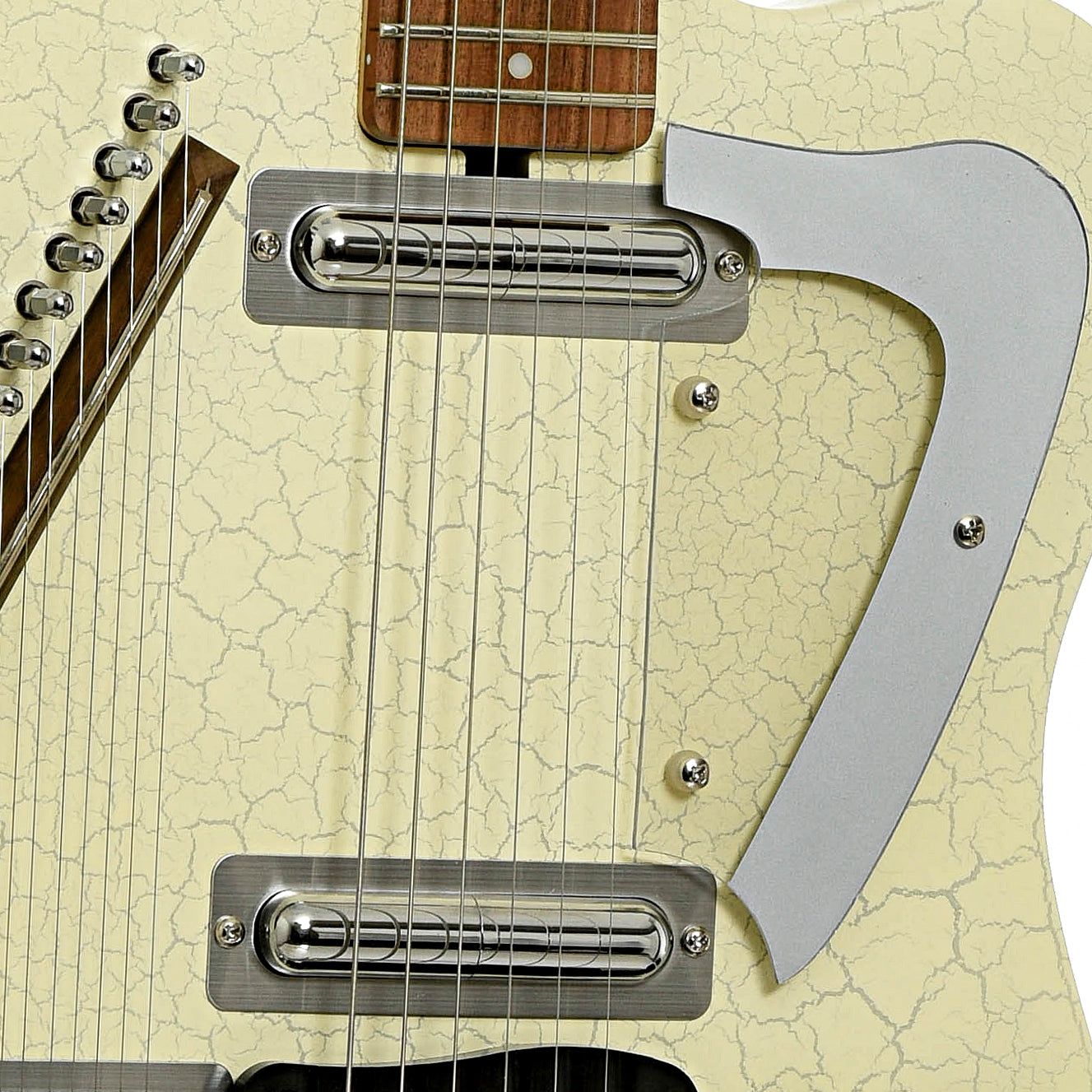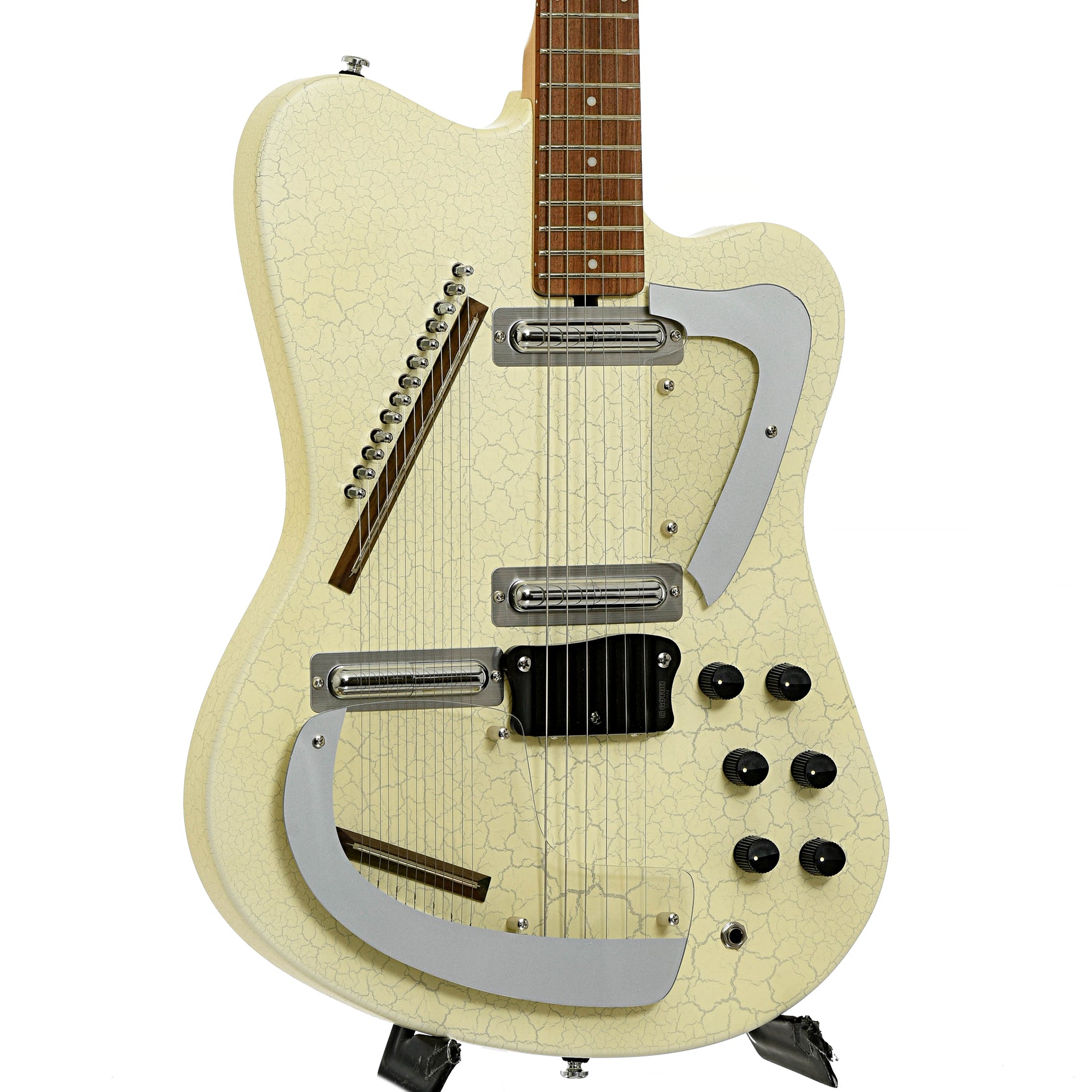 This super cool electric sitar combines a guitar with a Gotoh buzz bridge, and a 13-string mini-harp. Equipped with three lipstick pickups (one for the mini-harp), individual volume and tone controls, separate tailpieces and pickguards, modern tuners and tuning pins. Lots of fun! Access gigbag. Import. On consignment.