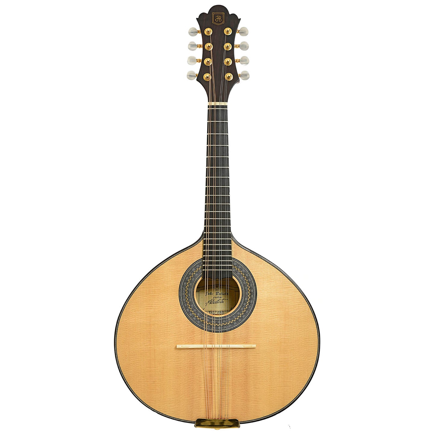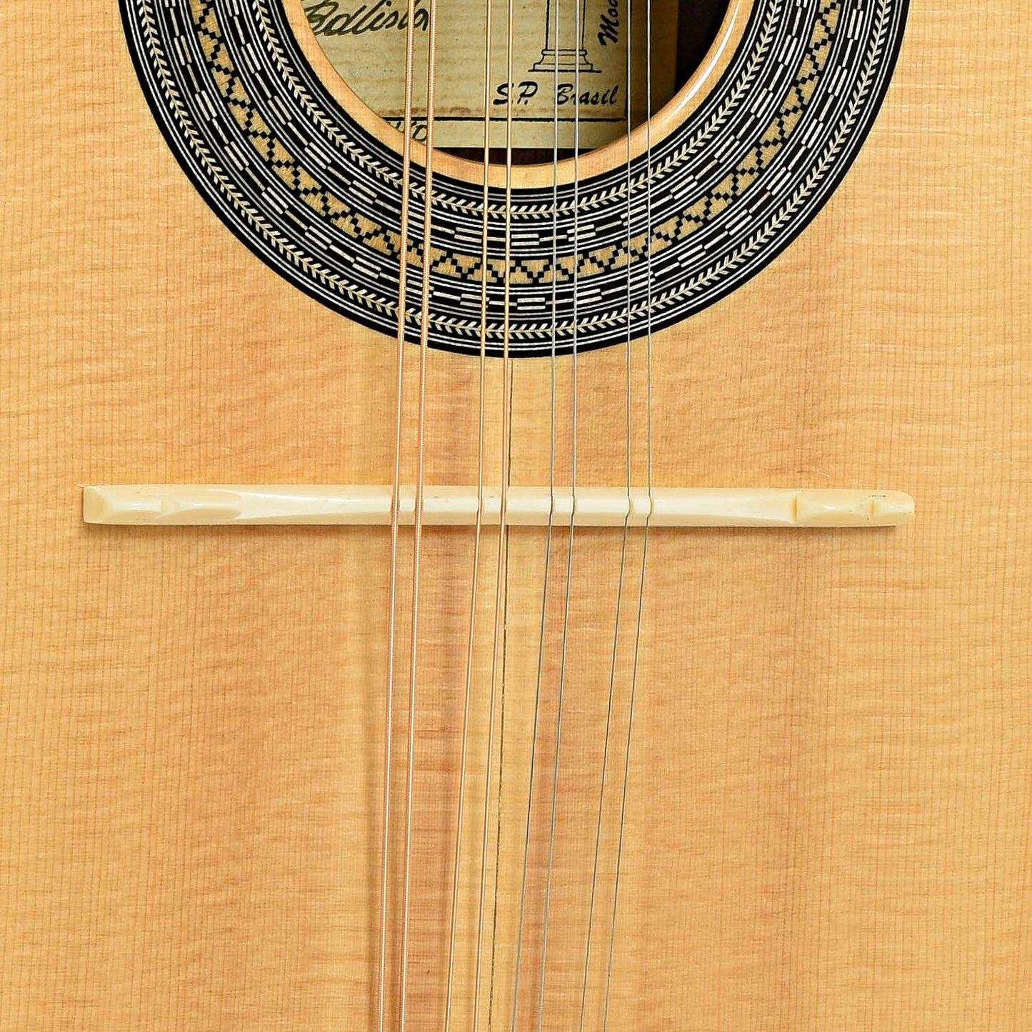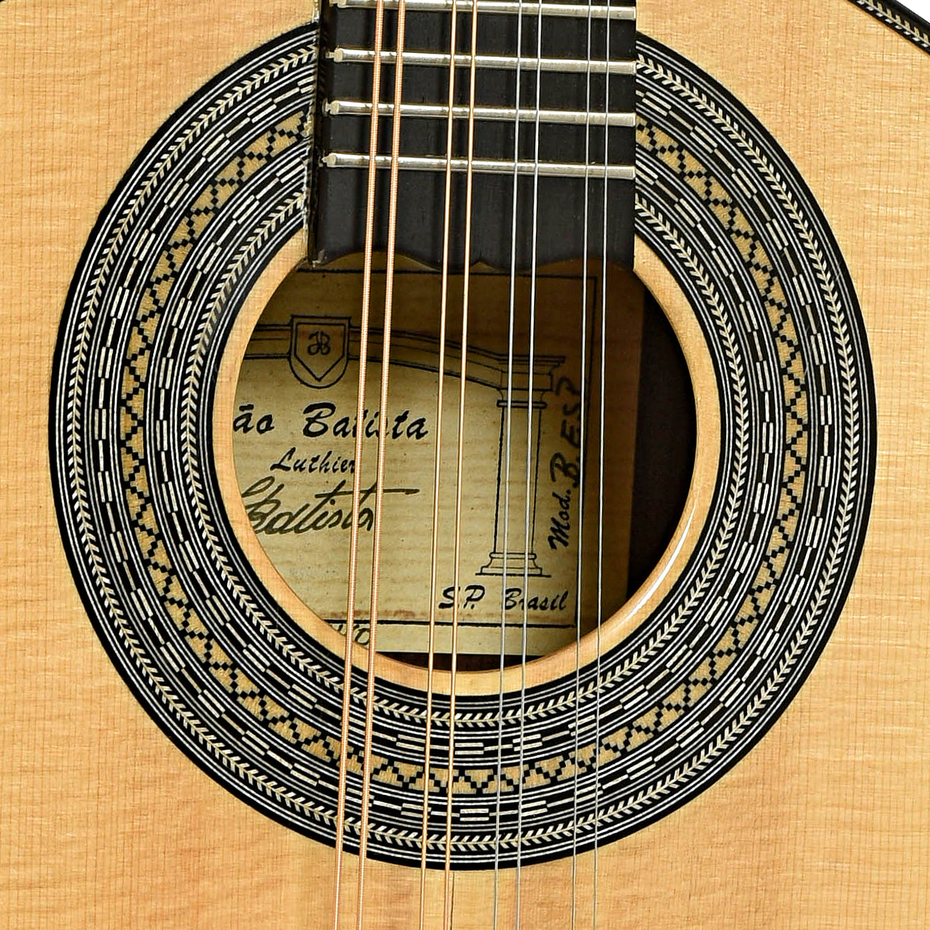 Built in Brazil, this bandolim by Joao Batista is a mandolin-family instrument in standard GDAE tuning. Features include a solid wood body of spruce top and Brazilian rosewood back and sides. It has a mahogany neck, ebony fingerboard, and solid bone bridge. Appointments include a fancy rosette and herringbone purflings. Metal-reinforced hard shell case. Handcrafted in Brazil.