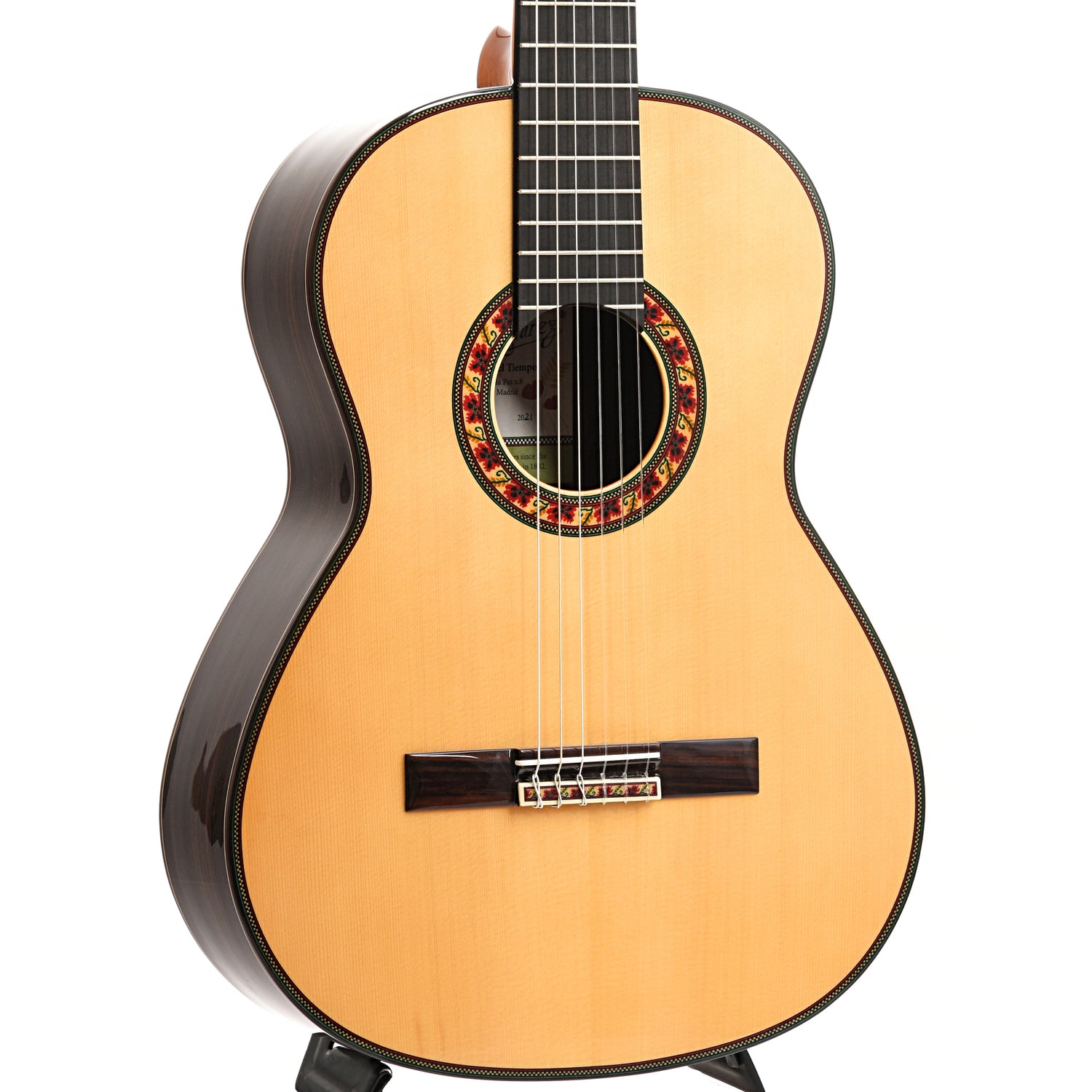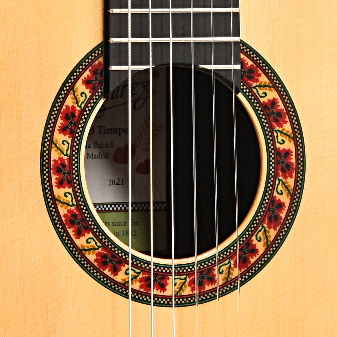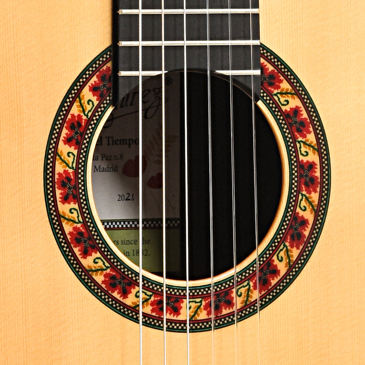 A continuation of the Ramirez Anniversary models -- and direct followup to the popular 130 Anos -- and another stunning example of Spanish craftsmanship at its finest. Created to commemorate 140 years of Ramirez design and construction, this classical guitar features an enhanced top-brace system that delivers better articulated noting and full-bodied tone. Unlike previous anniversary models, the Guitarra del Tiempo will be a permanent addition to the Ramirez line, with rotating changes to the distinctive soundhole rosette.
