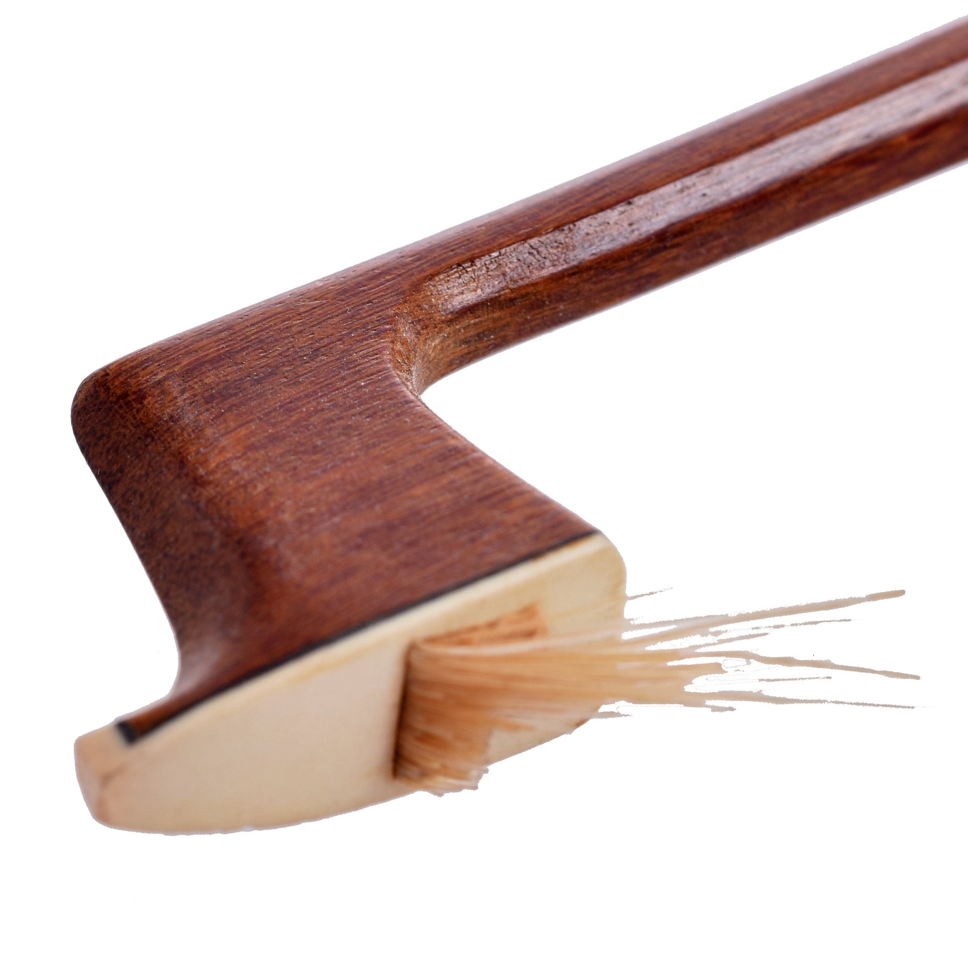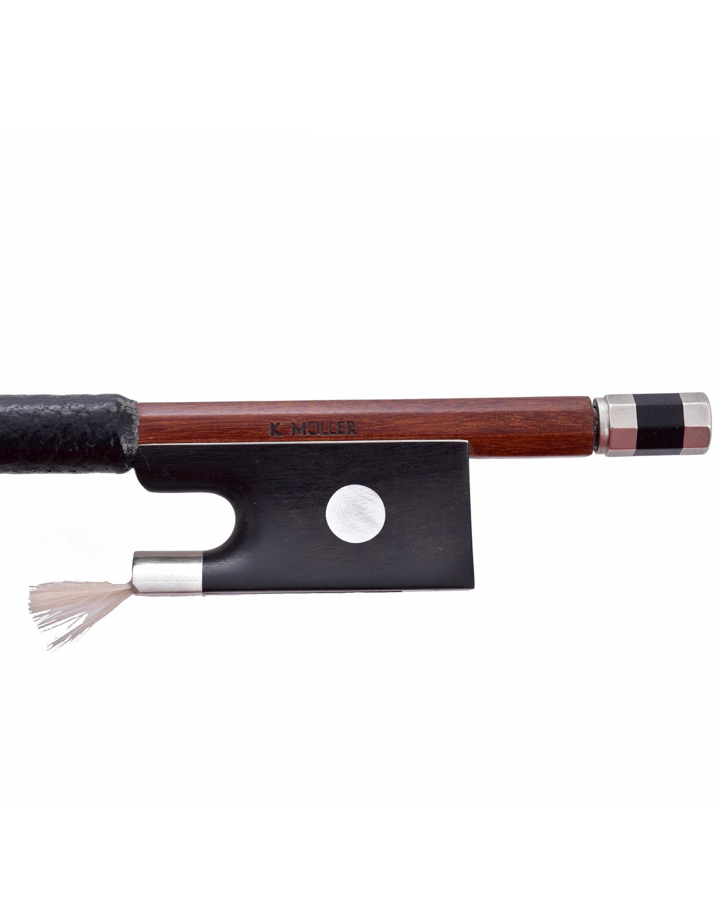 Made in Germany, recent, octagonal pernambuco stick, nickel mounts, ebony frog with pearl dot, stamped K.MOLLER, VGC except needs work (stick cracked/broken 4" down the stick from the head, etc.), sold in AS-IS condition, sold along with another K. Moller bow that the head has broken off , along with 10 other bows all needing lots of work, most but not all are 4/4