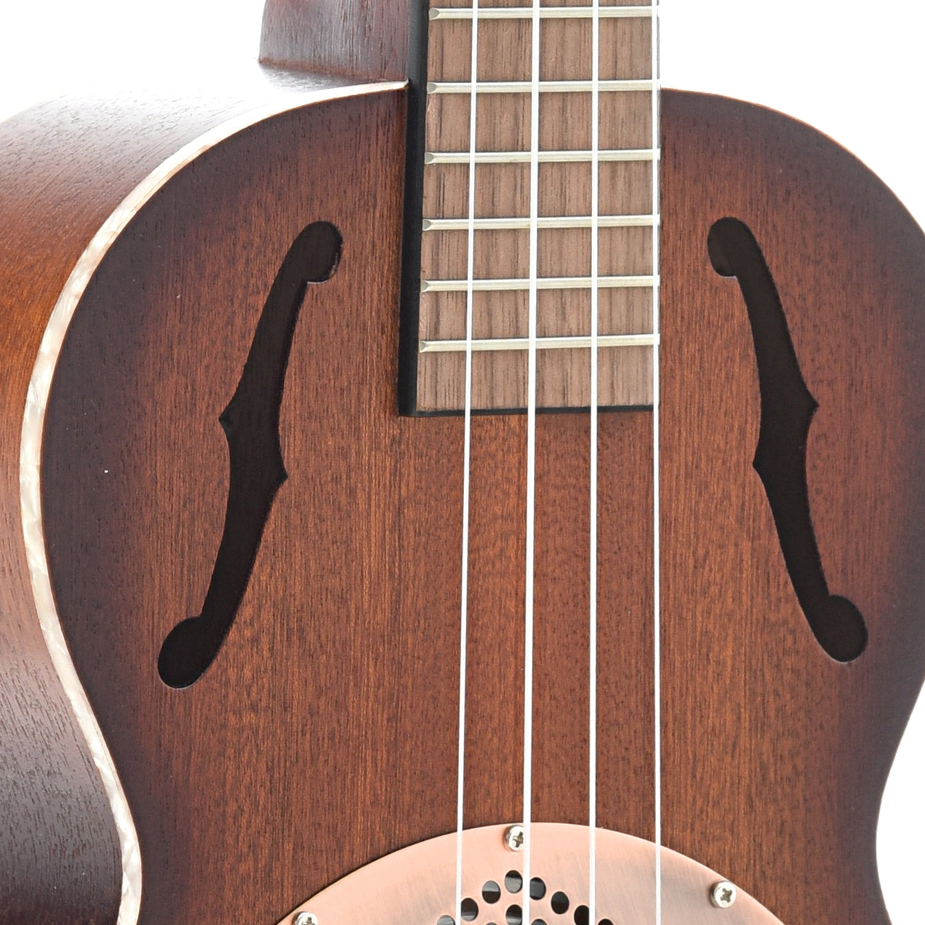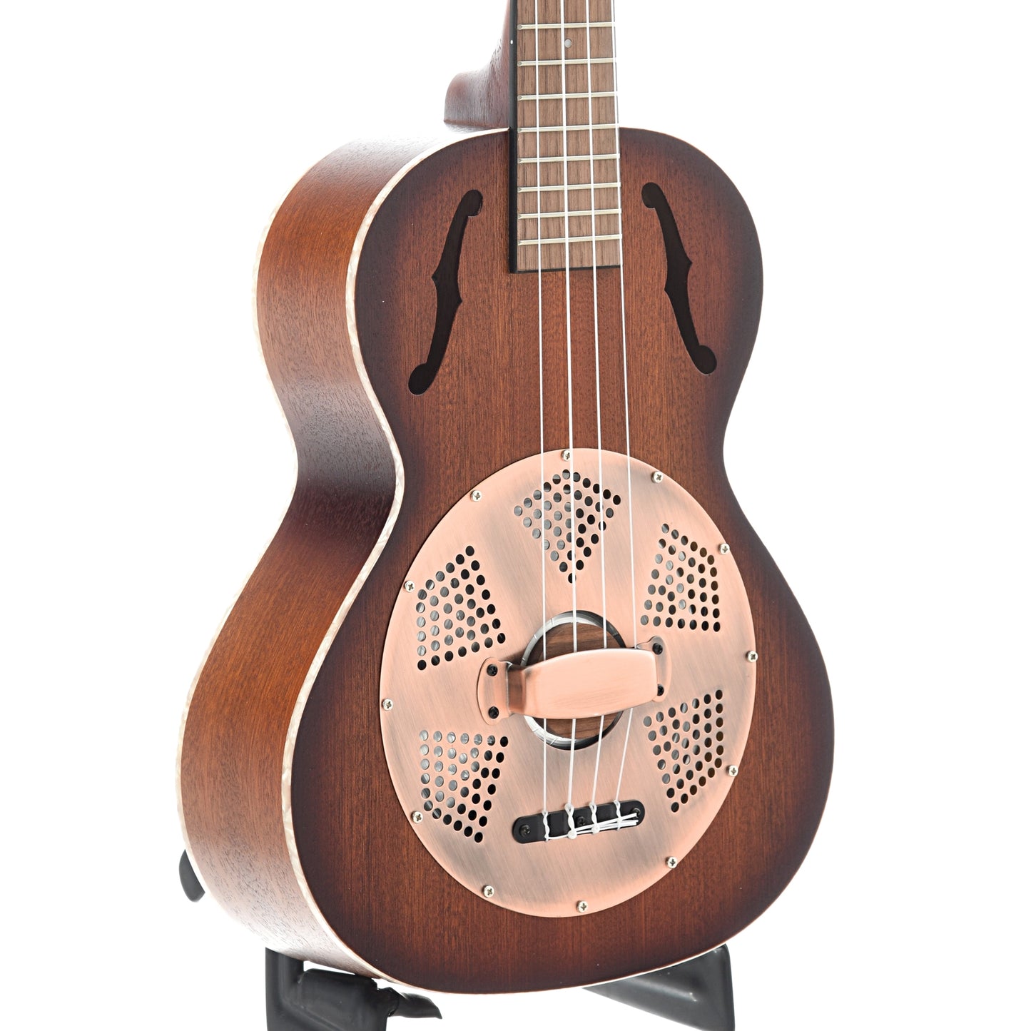 The Kala Tenor Mahogany Burst Resonator Ukulele is fitted with a lightweight aluminum resonator directly into the mahogany body. The rcone gets a "vintage brass" coverplate and the body has elegant F-holes to give this model its distinct appearance. The sound is classic.