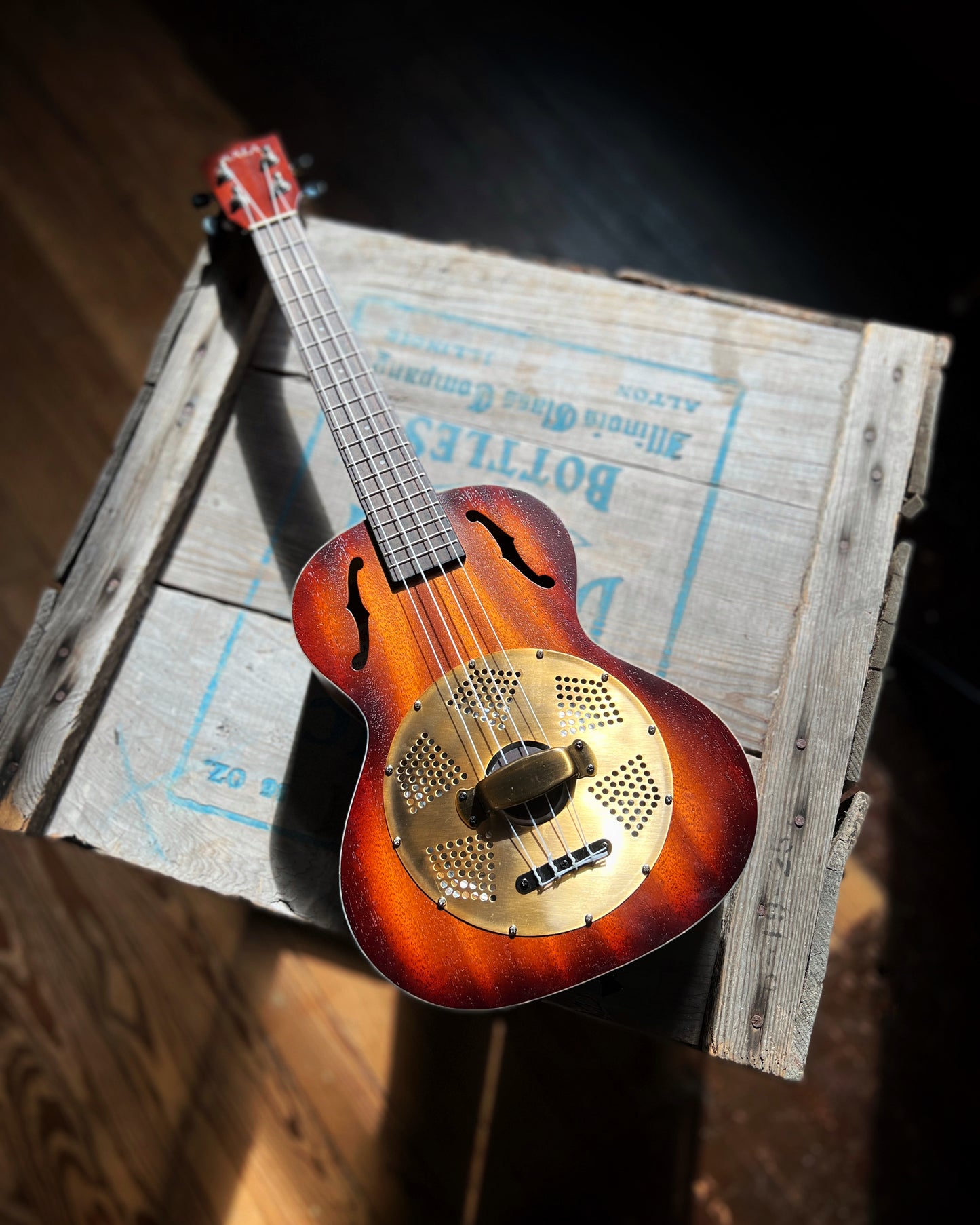 Kala Tenor Mahogany Burst Resonator Ukulele with Vintage Brass Coverplate