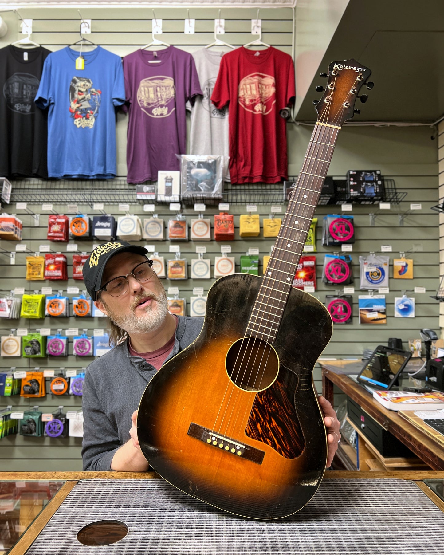 Originally built as a Hawaiian-style lap guitar, this Kalamazoo KHG-11 has been converted for standard play. It features a sunburst finish on a bound spruce top, with mahogany back, sides, and a 12-fret mahogany neck. Additional details include a Brazilian rosewood fingerboard and bridge, and Kluson 3-on-a-plate tuners. Includes a Martin hard shell case. Made in Kalamazoo, USA.