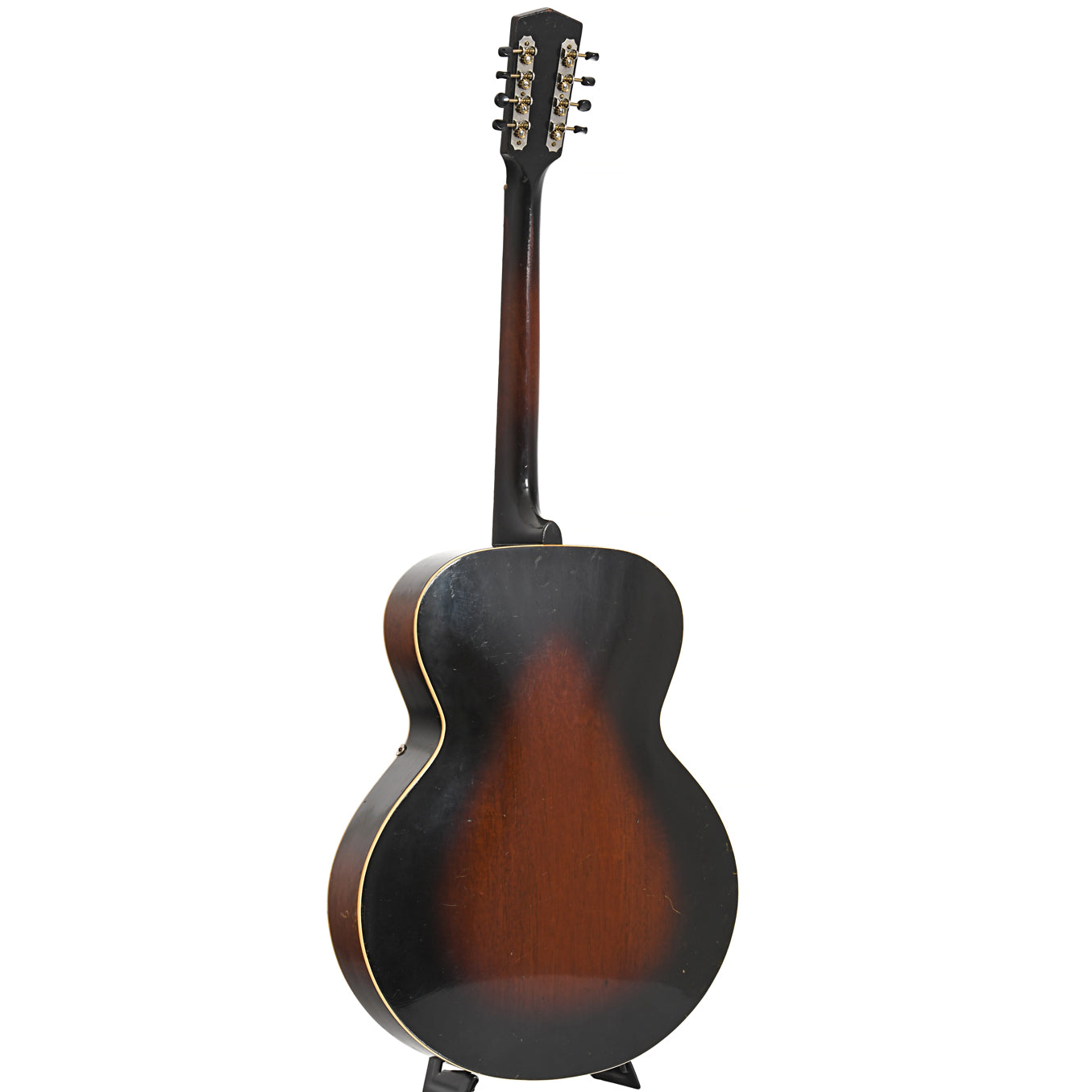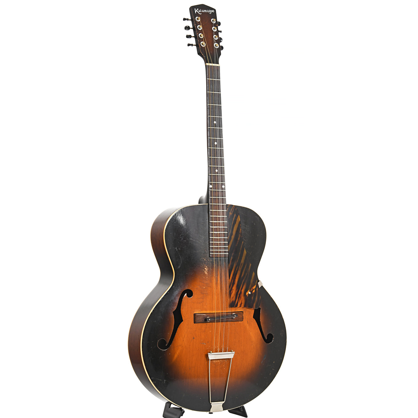 A rare mandocello, this Kalamazoo KK-31 made by Gibson features gloss sunburst finish, double bound archtop body, arched spruce top, F-holes, solid mahogany back, sides and neck, 24 fret Brazilian rosewood fingerboard, 4-on-a-plate tuners with black buttons, adjustable Brazilian rosewood bridge, trapeze tailpiece (needs work: fret level, possible refret and heat press to straighten bowed neck, new nut, strings, low string tension – sold AS-IS)