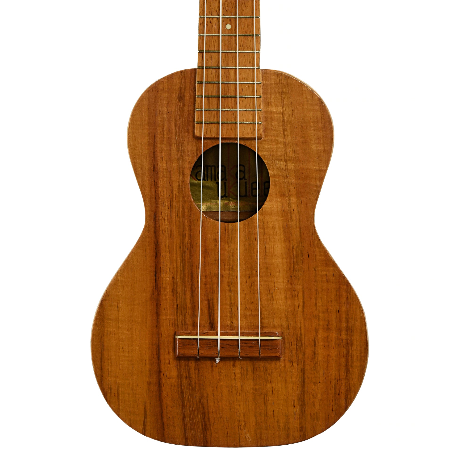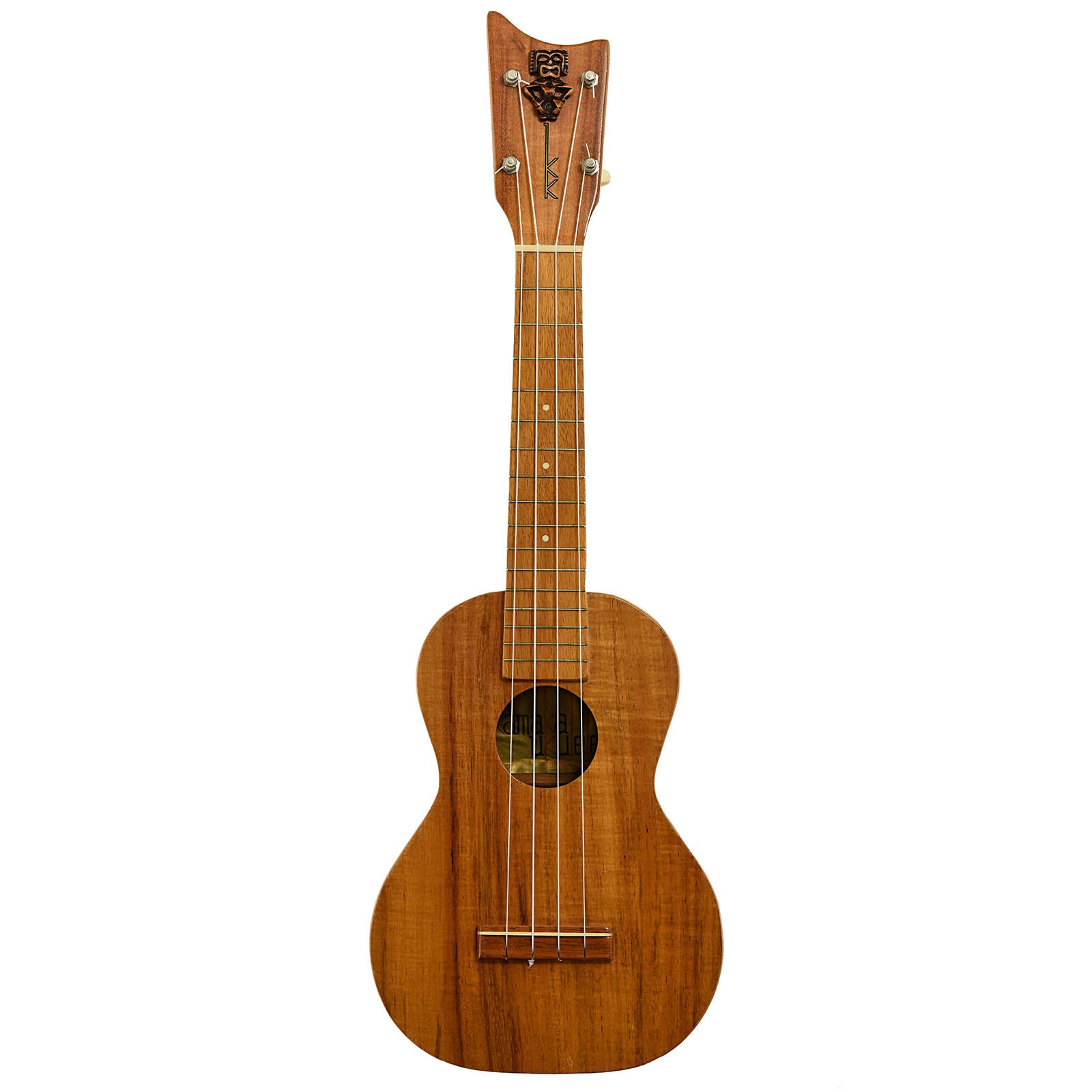 A rare bird, this all-koa Kamaka Tiki Concert is ready to strum. Features include a gold label in the soundhole, the peghead tiki, and friction tuners with white buttons. Newer Kamaka hard shell case. Made in Hawaii, USA. On consignment.