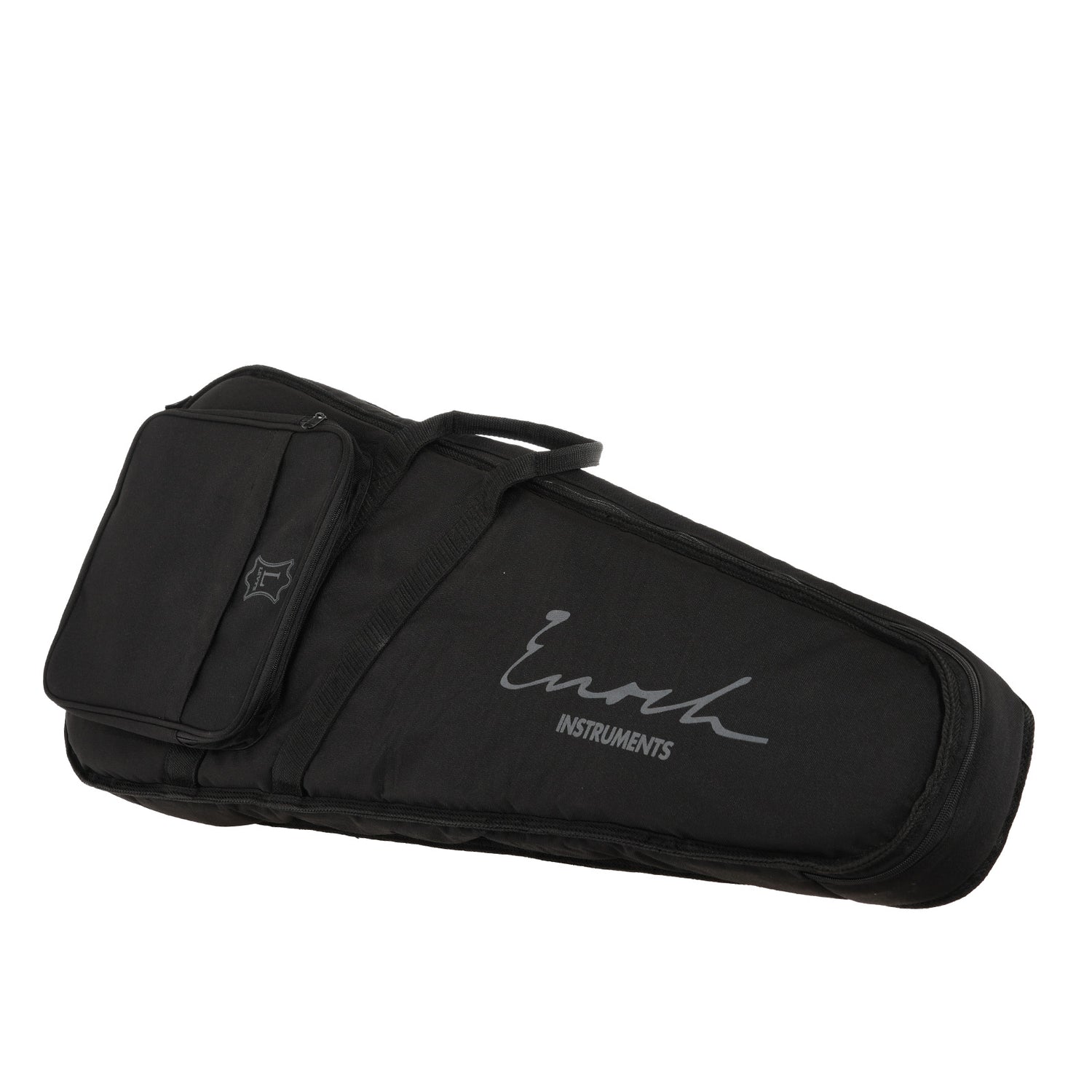 - Black triangle-shaped padded gigbag with backpack straps and exterior accessory pocket