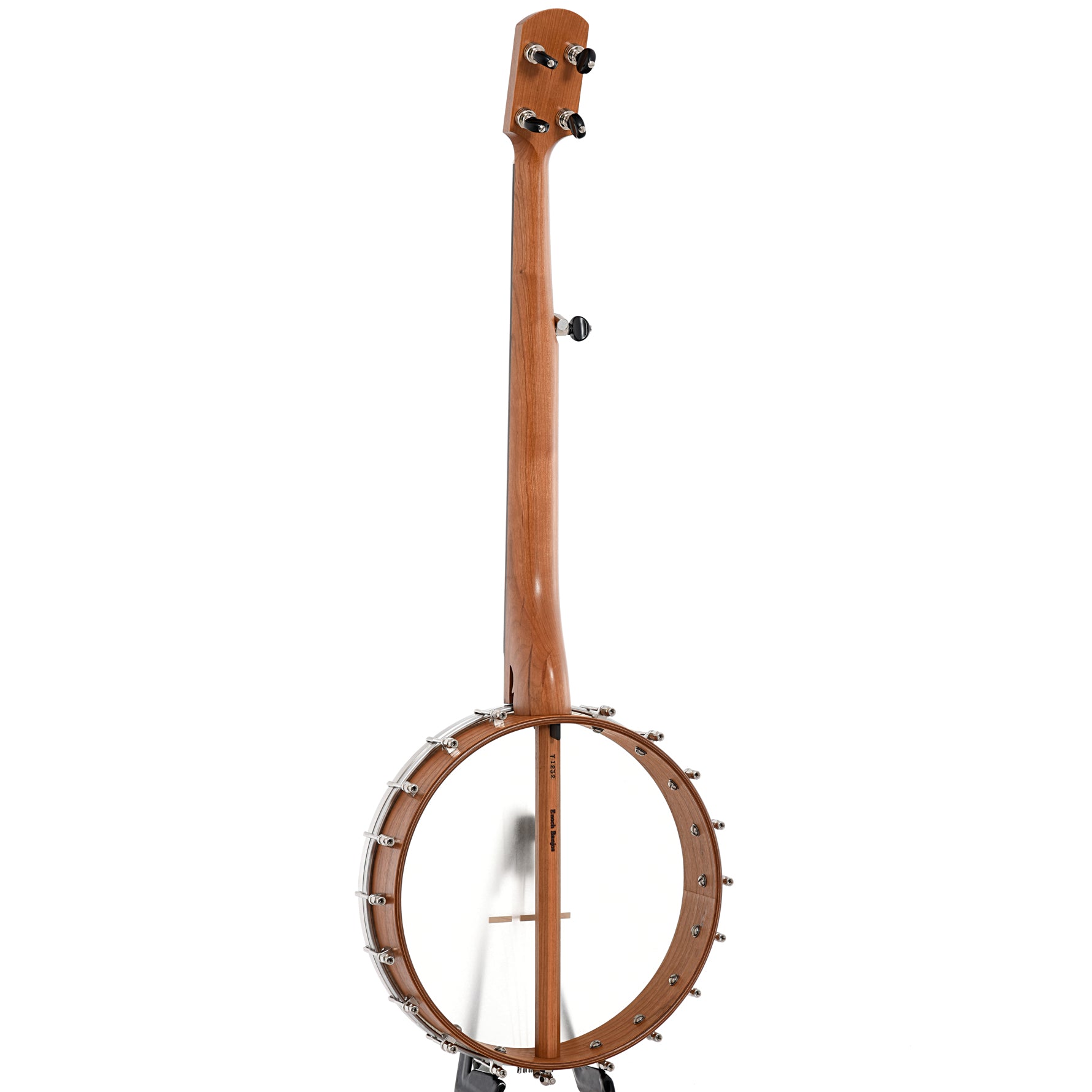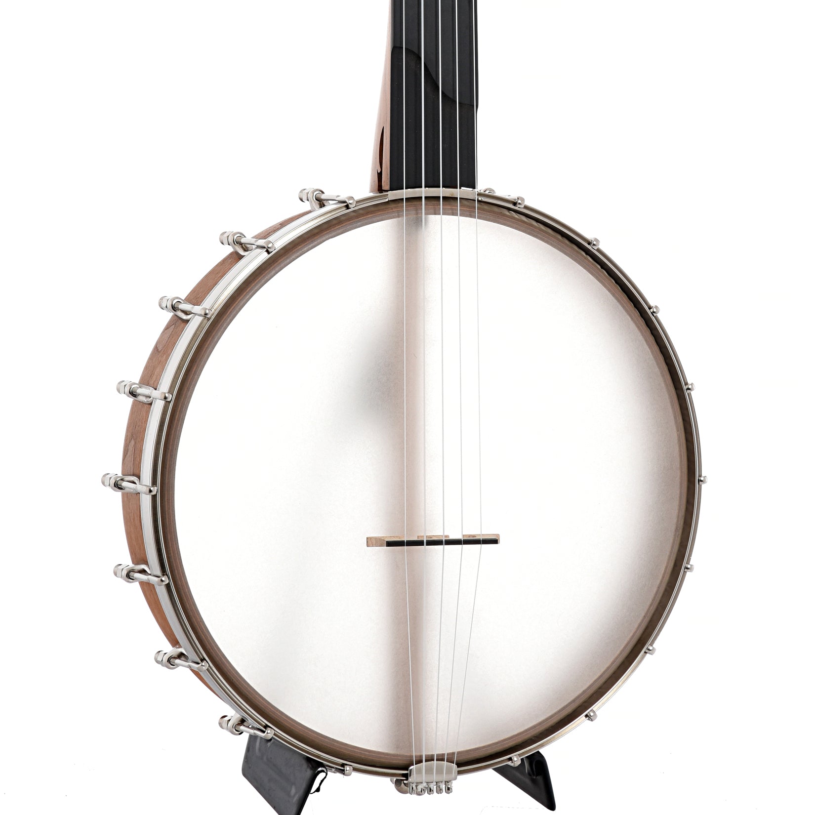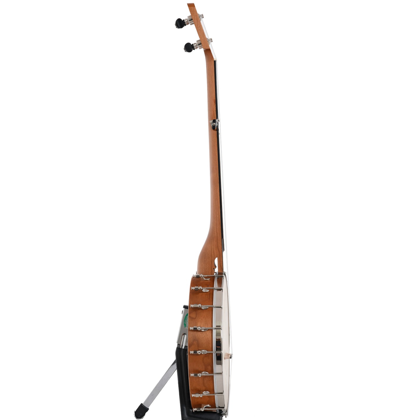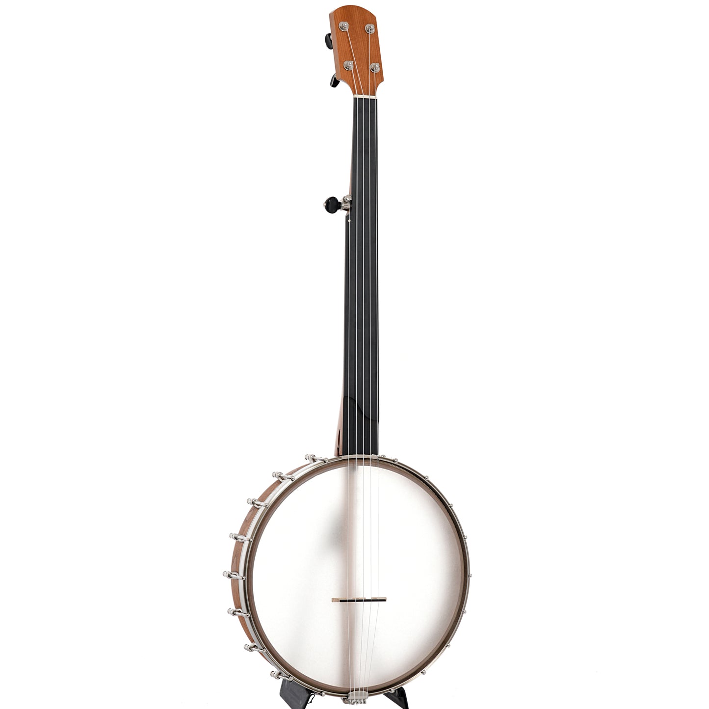 Bent 12" rim (multi-ply cherry, no tone ring), Dobson style cherry neck with 2-way adjustable truss rod, fretless black Richlite fingerboard (1-1/4" nut, 25.5" scale), Remo Renaissance head, no-knot tailpiece, 18 brackets, 5 geared tuners, octagonal dowel stick. S-shaped scoop in fretboard for extra-easy playing over the neck. Aquila Nylgut strings. Black triangle-shaped padded gigbag with backpack straps, exterior accessory pocket.