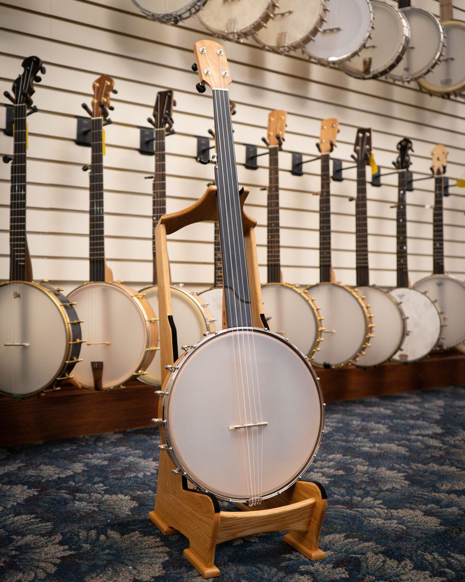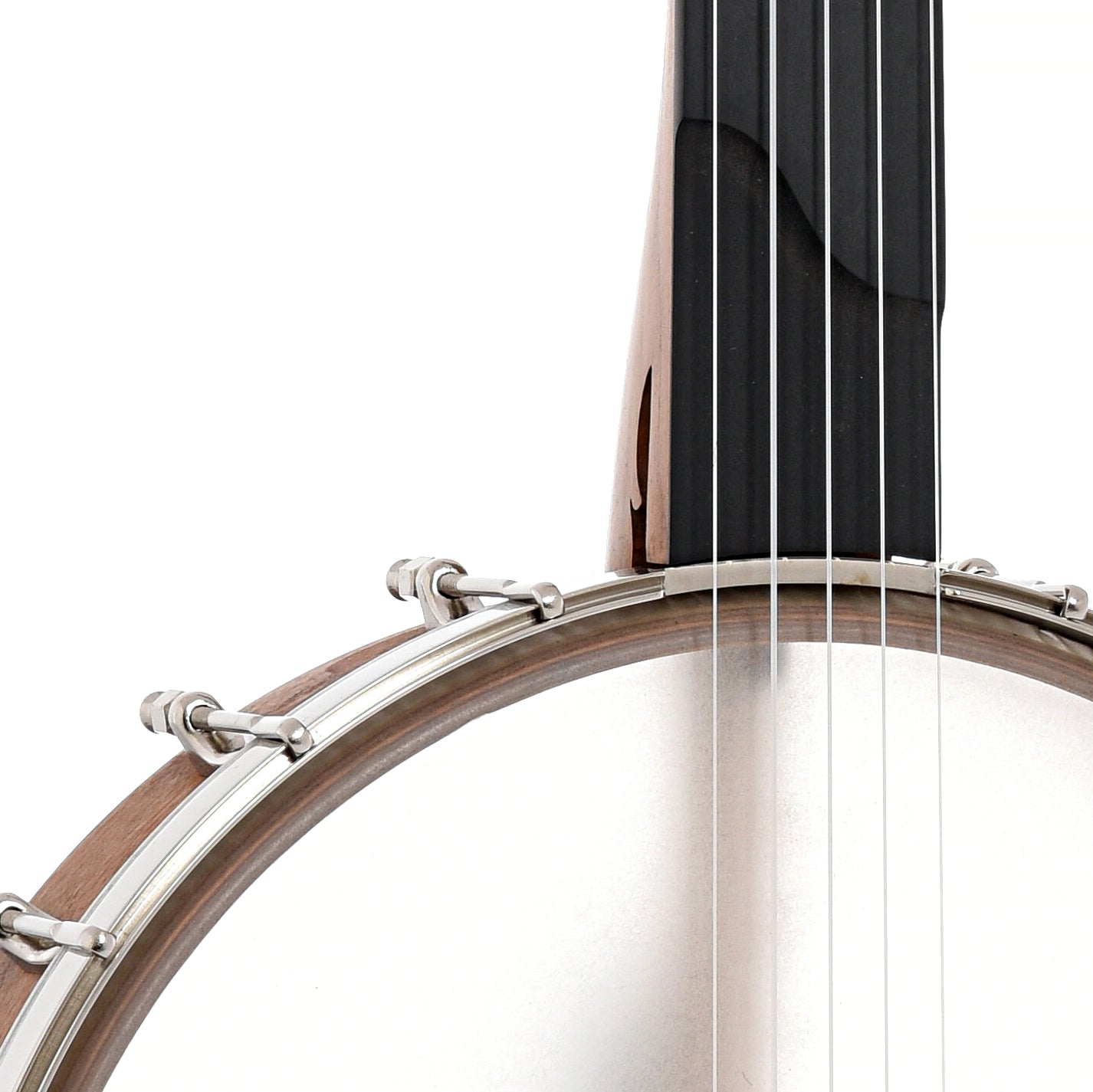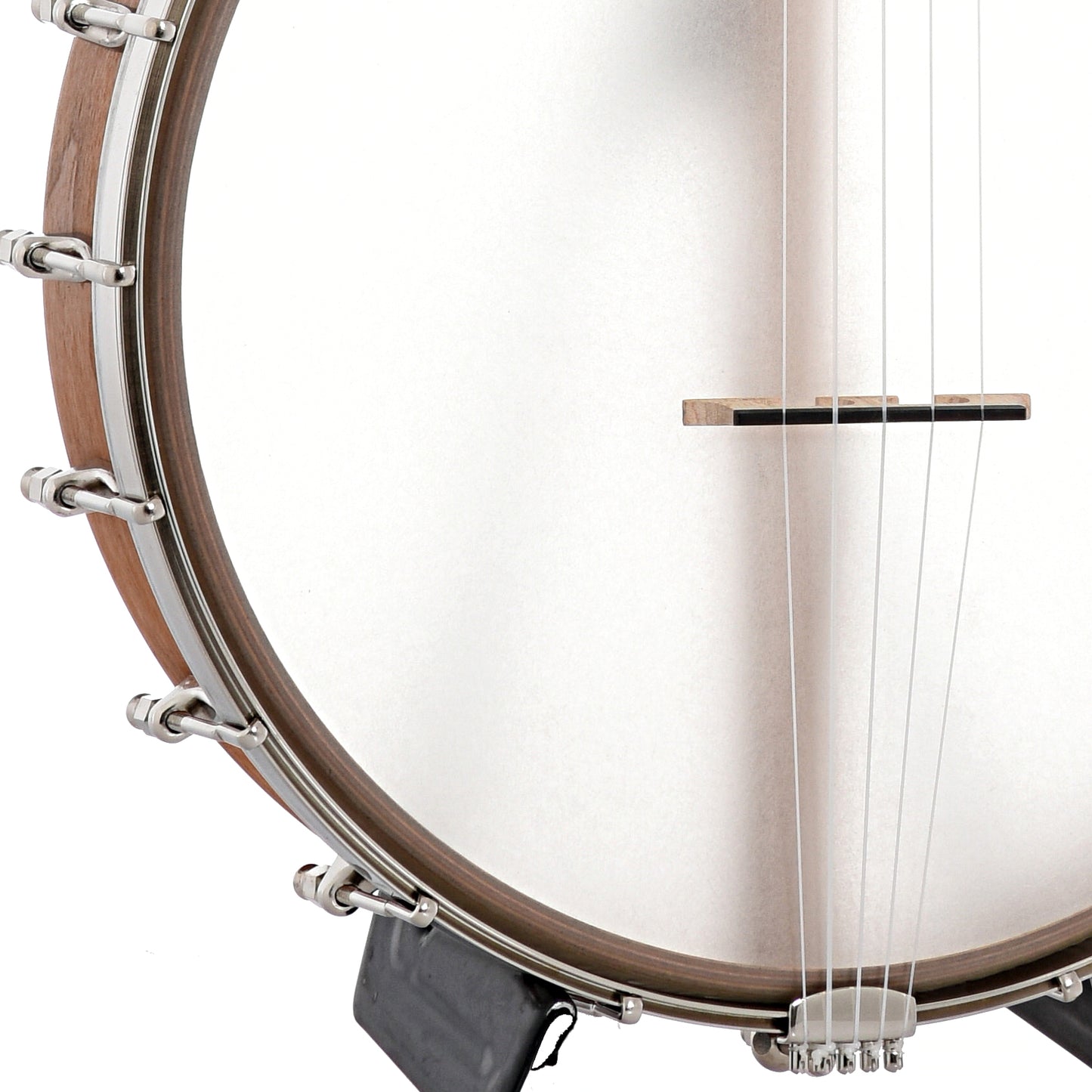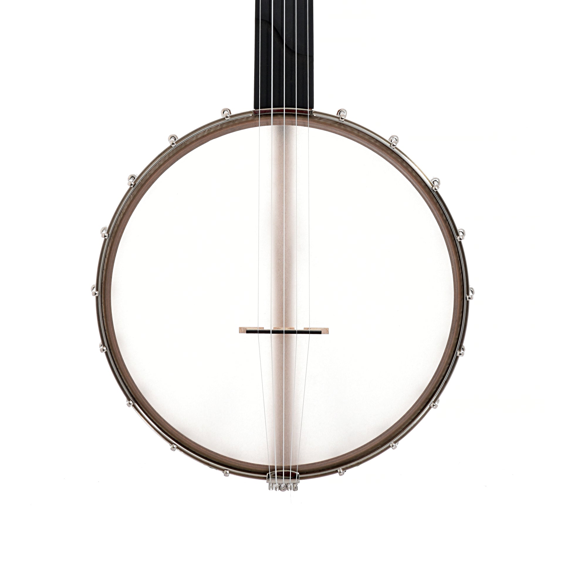 Bent 12" rim (multi-ply cherry, no tone ring), Dobson style cherry neck with 2-way adjustable truss rod, fretless black Richlite fingerboard (1-1/4" nut, 25.5" scale), Remo Renaissance head, no-knot tailpiece, 18 brackets, 5 geared tuners, octagonal dowel stick. S-shaped scoop in fretboard for extra-easy playing over the neck. Aquila Nylgut strings. Black triangle-shaped padded gigbag with backpack straps, exterior accessory pocket.