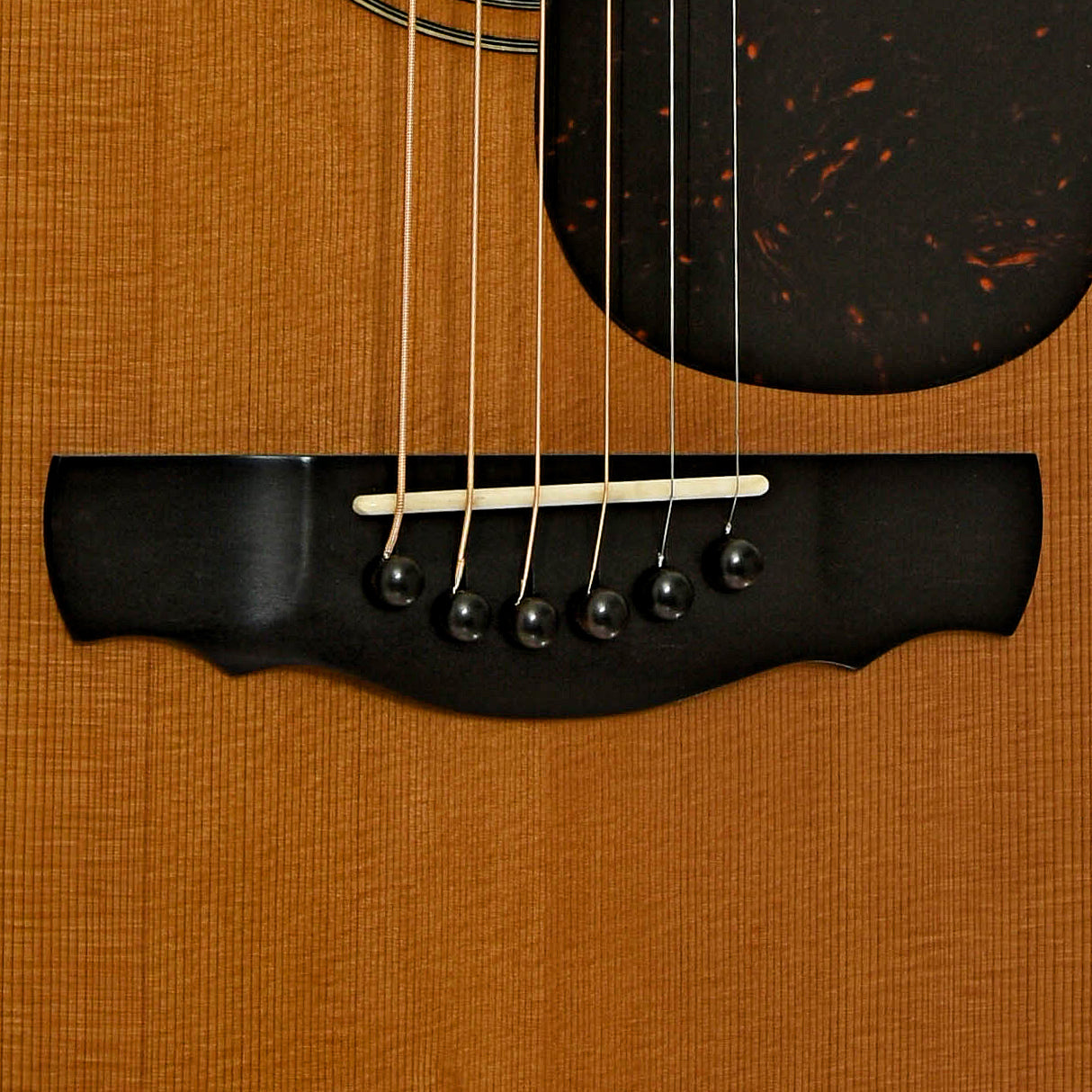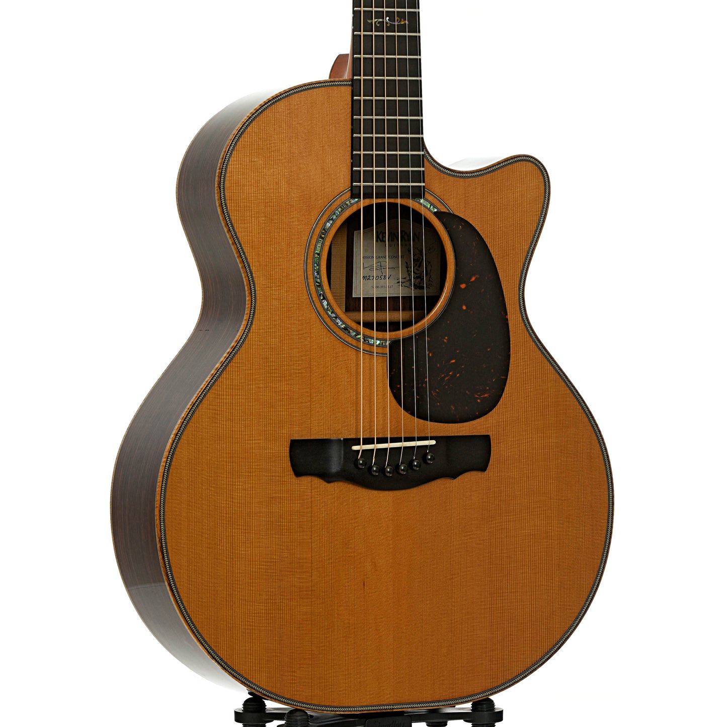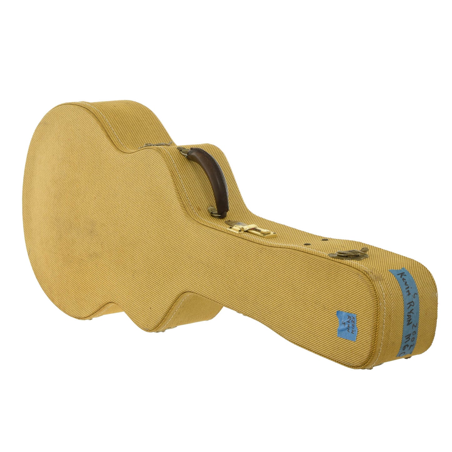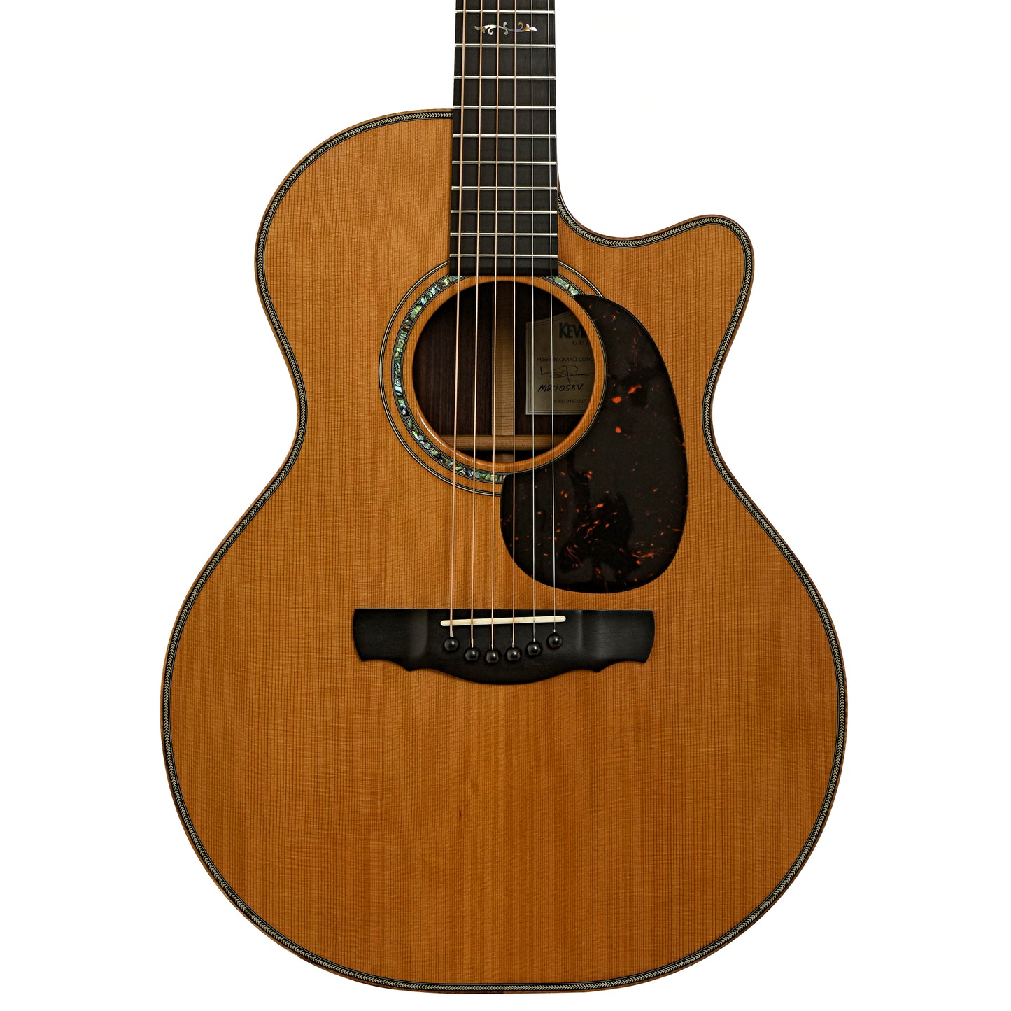 A favorite among fingerstyle guitarists, this Kevin Ryan gleams like a jewel, and features a Grand Concert body of cedar top and rosewood back and sides. It has an ebony fingerboard and bridge. Fine appointments of koa binding, herringbone purflings and abalone rosette. Equipped with Gotoh 510 tuners, and an LR Baggs transducer pickup installed. AVS tweed hard shell case. Made in USA. On consignment.