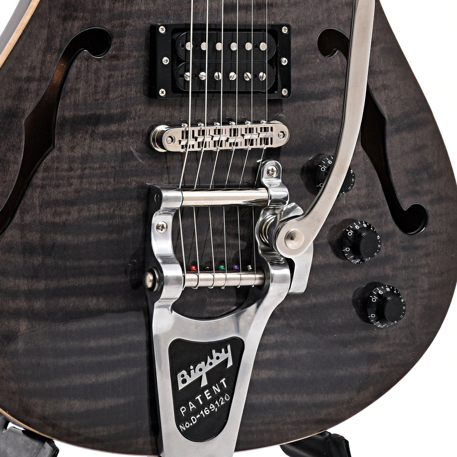 Great hollowbody electric guitar from Joe Knaggs. Faded Onyx finish on carved maple top. Carved mahogany body. Set mahogany neck. 2 humbucking pickups. Bigsby tremolo. Handcrafted in the U.S.A. With OHSC (black lining). On consignment.