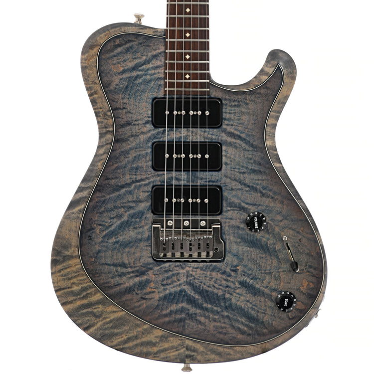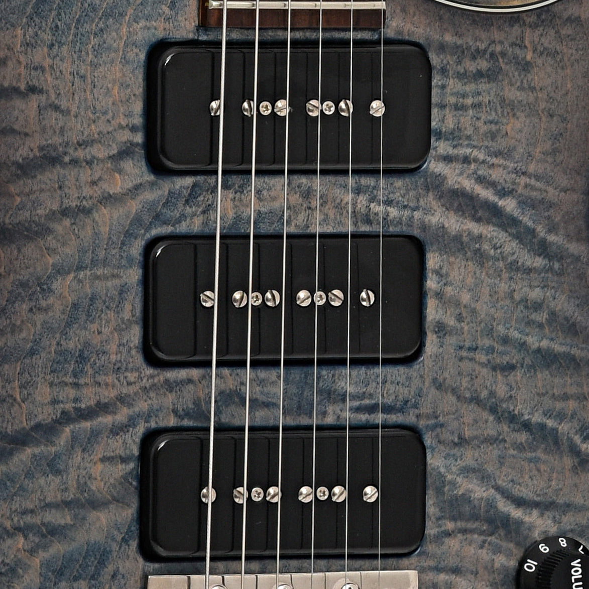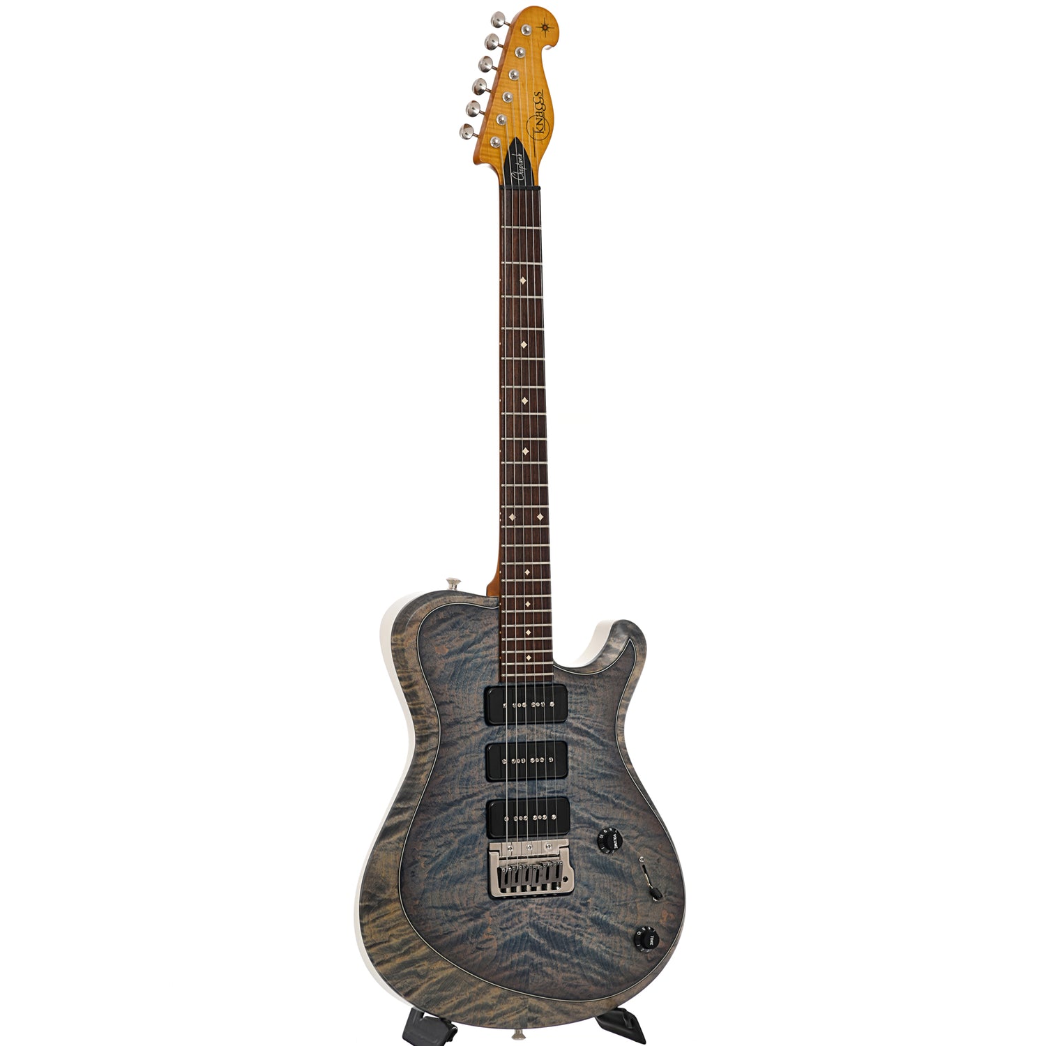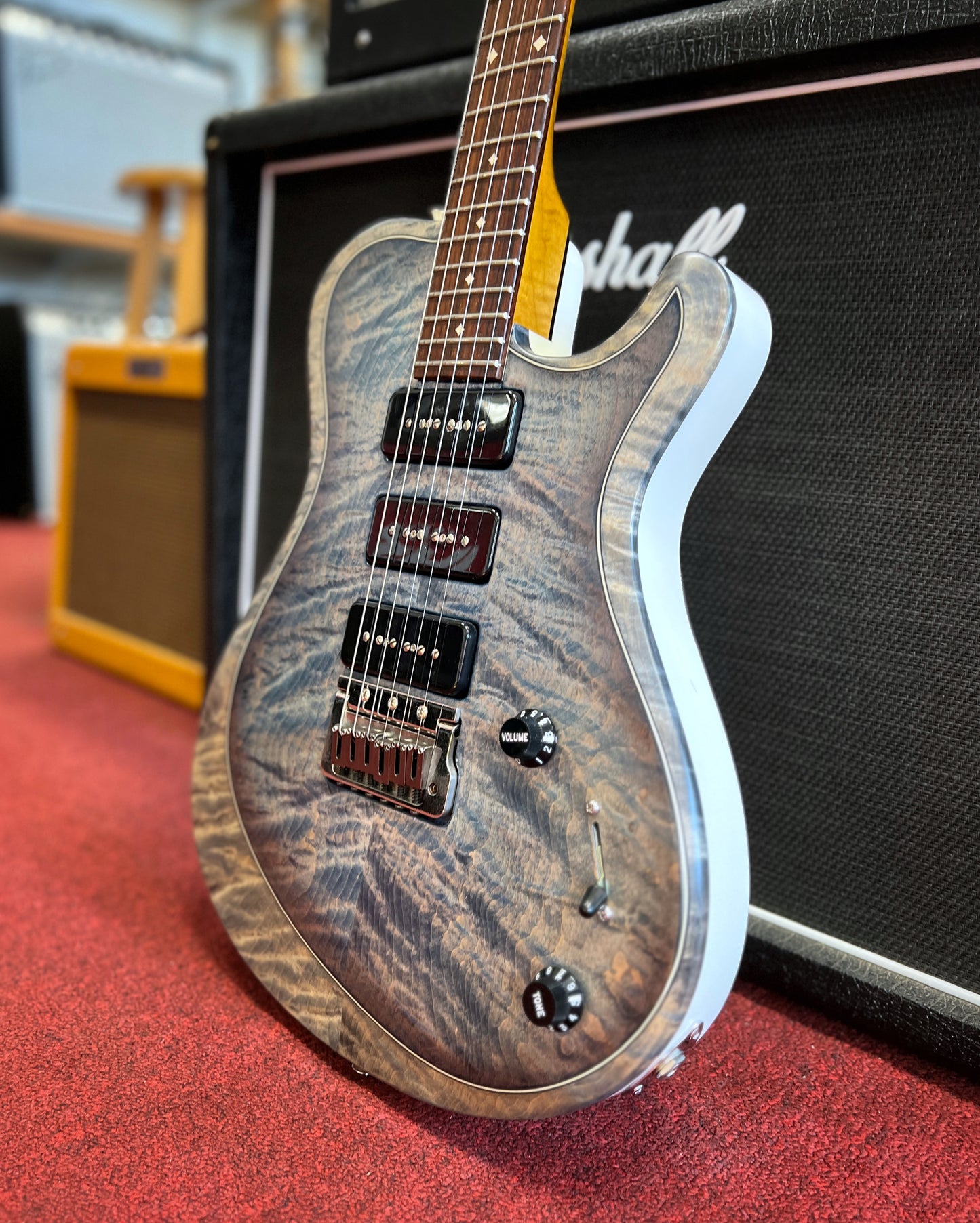 Named after the river that flows through its hometown, premium features on this Choptank Trem include Winter Solstice/Winter Snow finish on curly maple top, alder body, curly maple neck, easy playing rosewood fingerboard, 3 Lollar P90 pickups for a BIG sound, and a "tremolo" bridge. Original hard shell case. Built in Maryland, USA. On consignment.