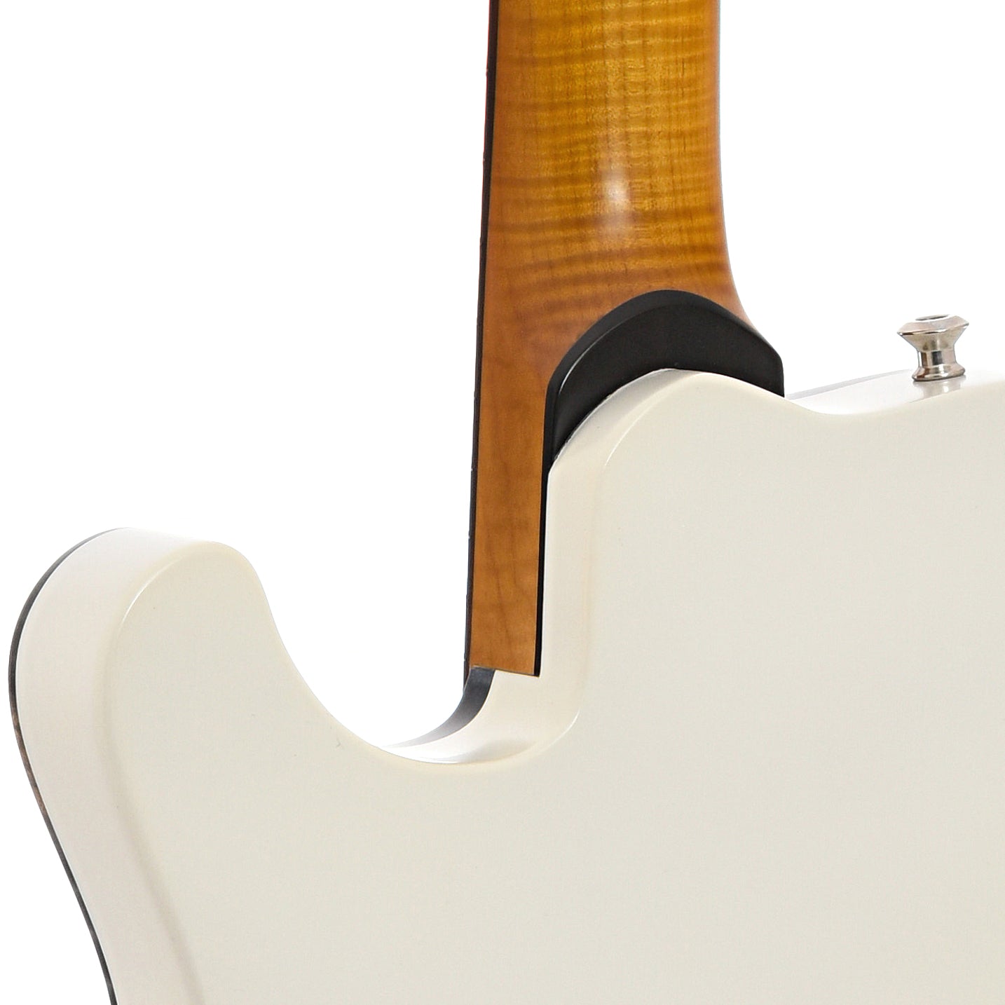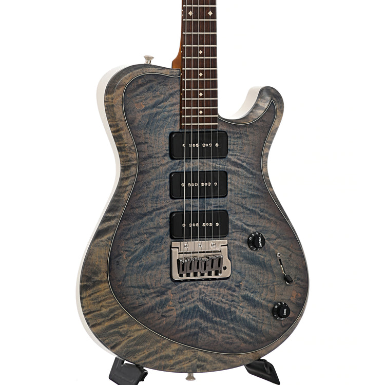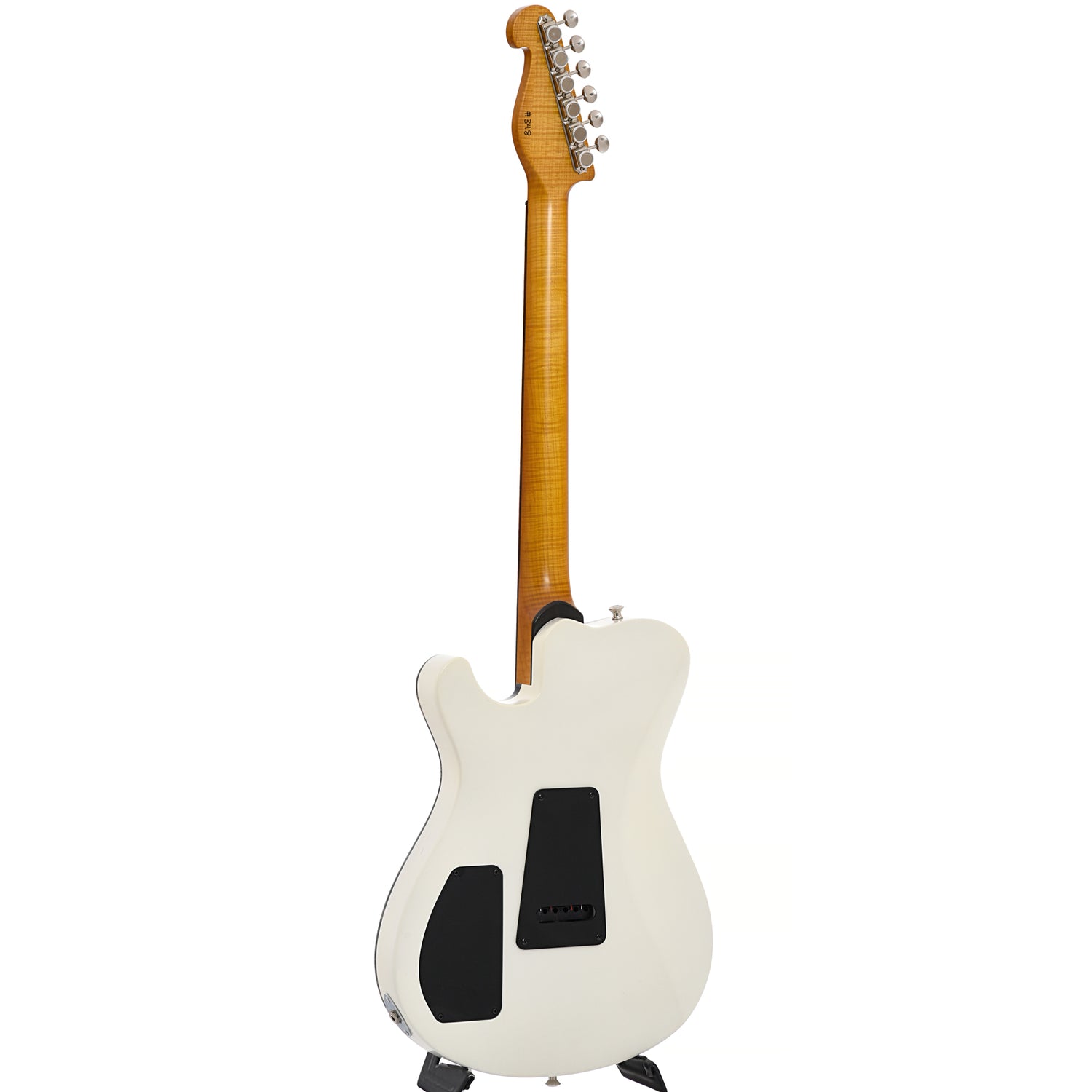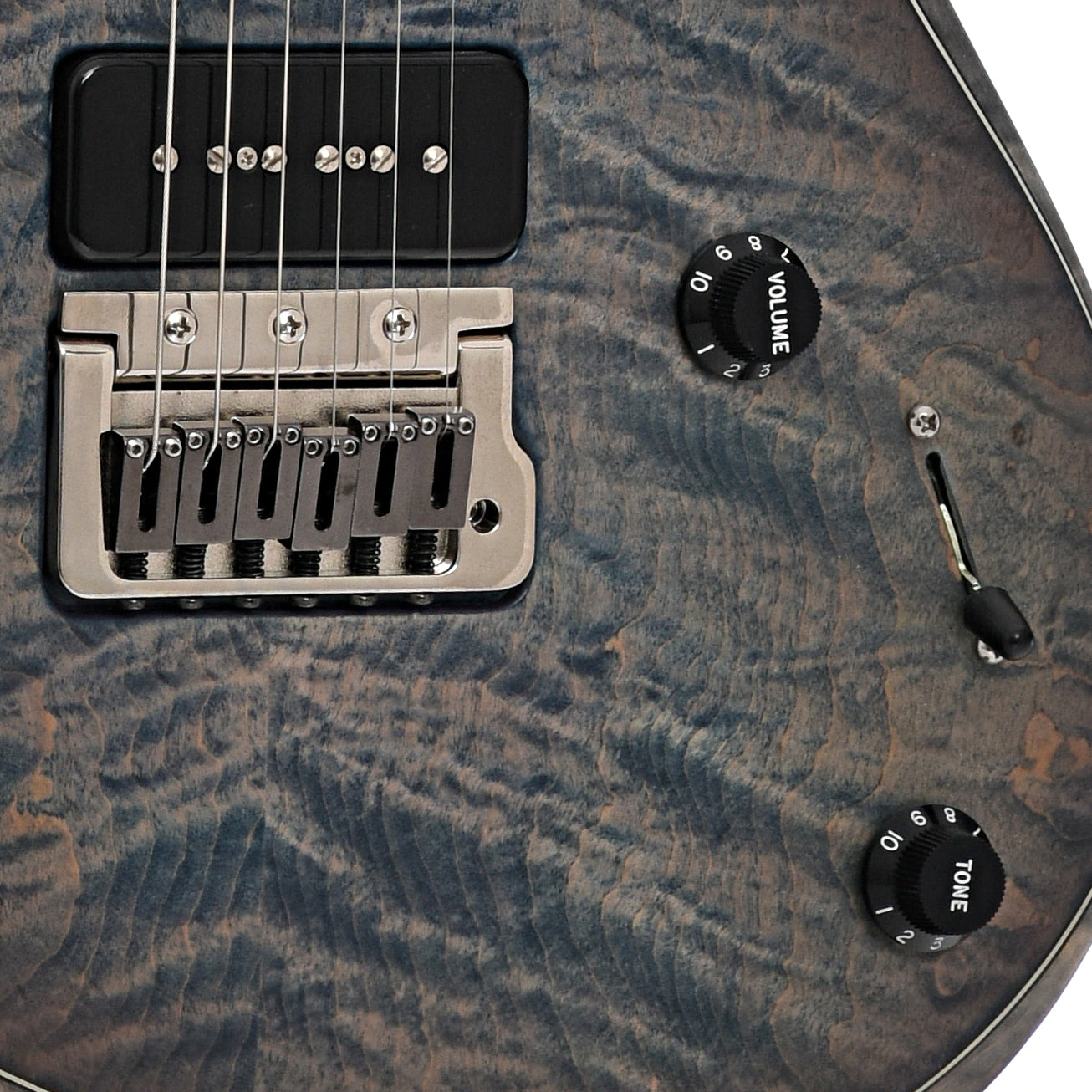 Named after the river that flows through its hometown, premium features on this Choptank Trem include Winter Solstice/Winter Snow finish on curly maple top, alder body, curly maple neck, easy playing rosewood fingerboard, 3 Lollar P90 pickups for a BIG sound, and a "tremolo" bridge. Original hard shell case. Built in Maryland, USA. On consignment.