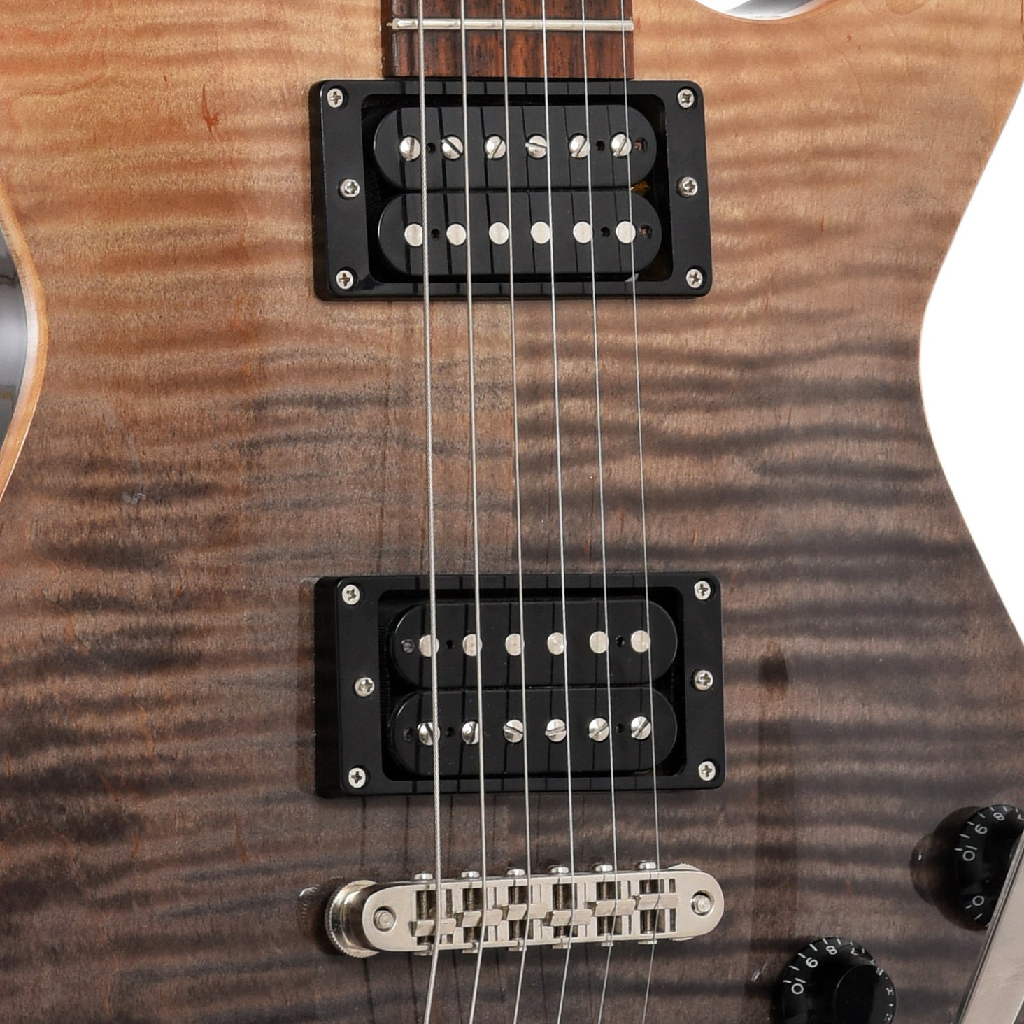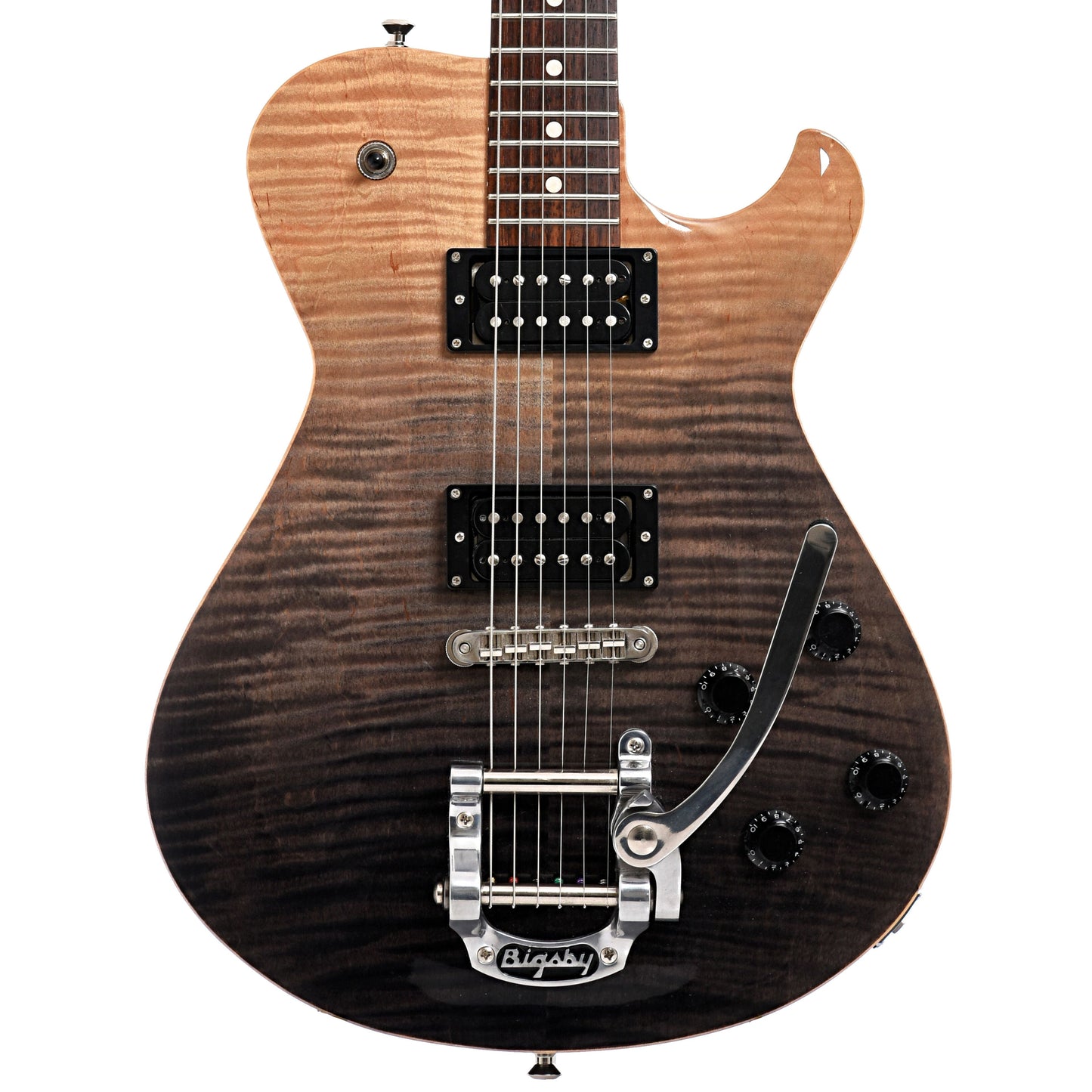 Nicely carved curly maple top and mahogany body on this Knaggs Kenai. Features include Faded Black gloss finish, two humbucking pickups, Bigsby vibrato, T-O-M-style bridge. Big meaty sound! Original hard shell case. Made in USA. On consignment.