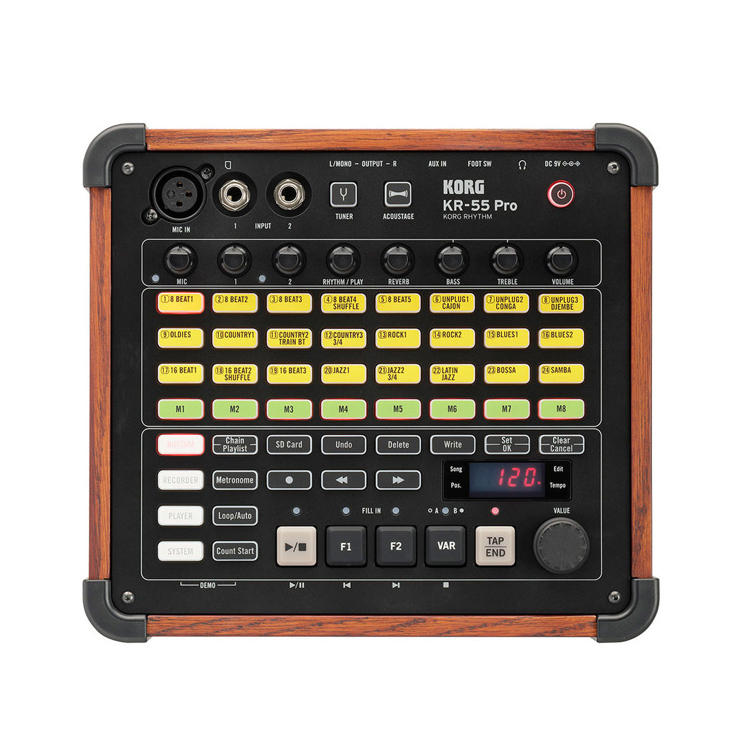 The Korg KR-55 Pro drum machine makes it easy to enjoy the backing of real drum/percussion sounds. It provides a rich variety of input jacks, mixer functionality, effects, an equalizer, and it can record to an SD card. The intuitive interface means that there is no need for complex programming. Battery-powered operation allows complete mobility from desktop to street performances to live events.