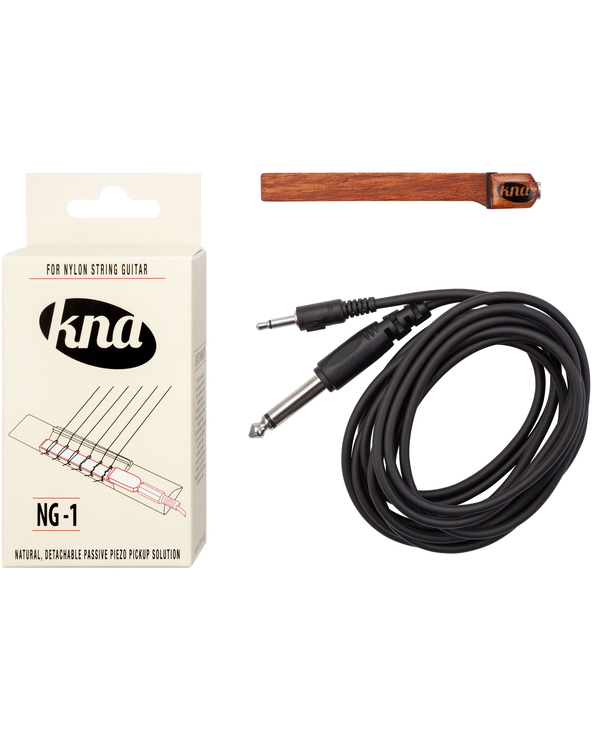 Natural, detachable passive piezo pickup for nylon-string guitar. Encased in lightweight tone wood the NG-1 ensures the natural sound of your guitar without modification. When not in use, the NG-1 may be left in place with no detriment to the instrument's acoustic sound. The NG-1 comes complete with a detachable, easily replaceable 1/8" to 1/4" cable.