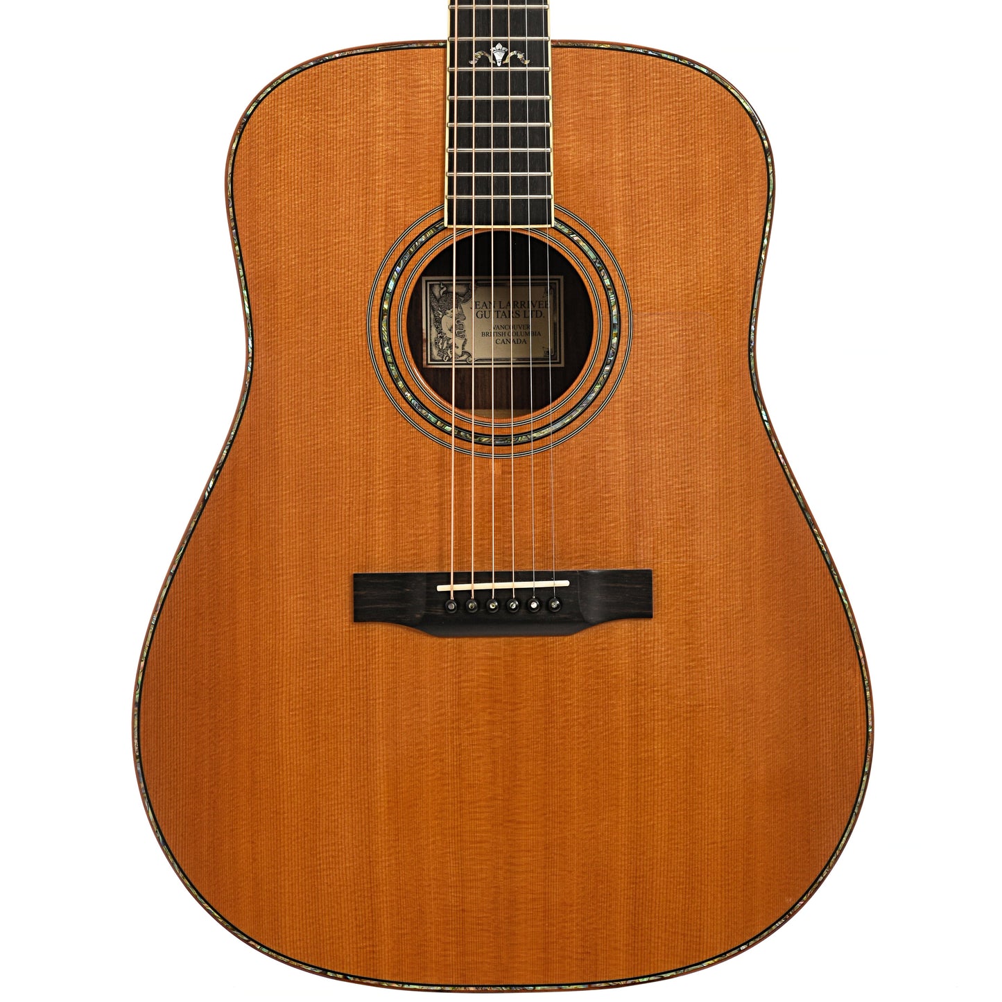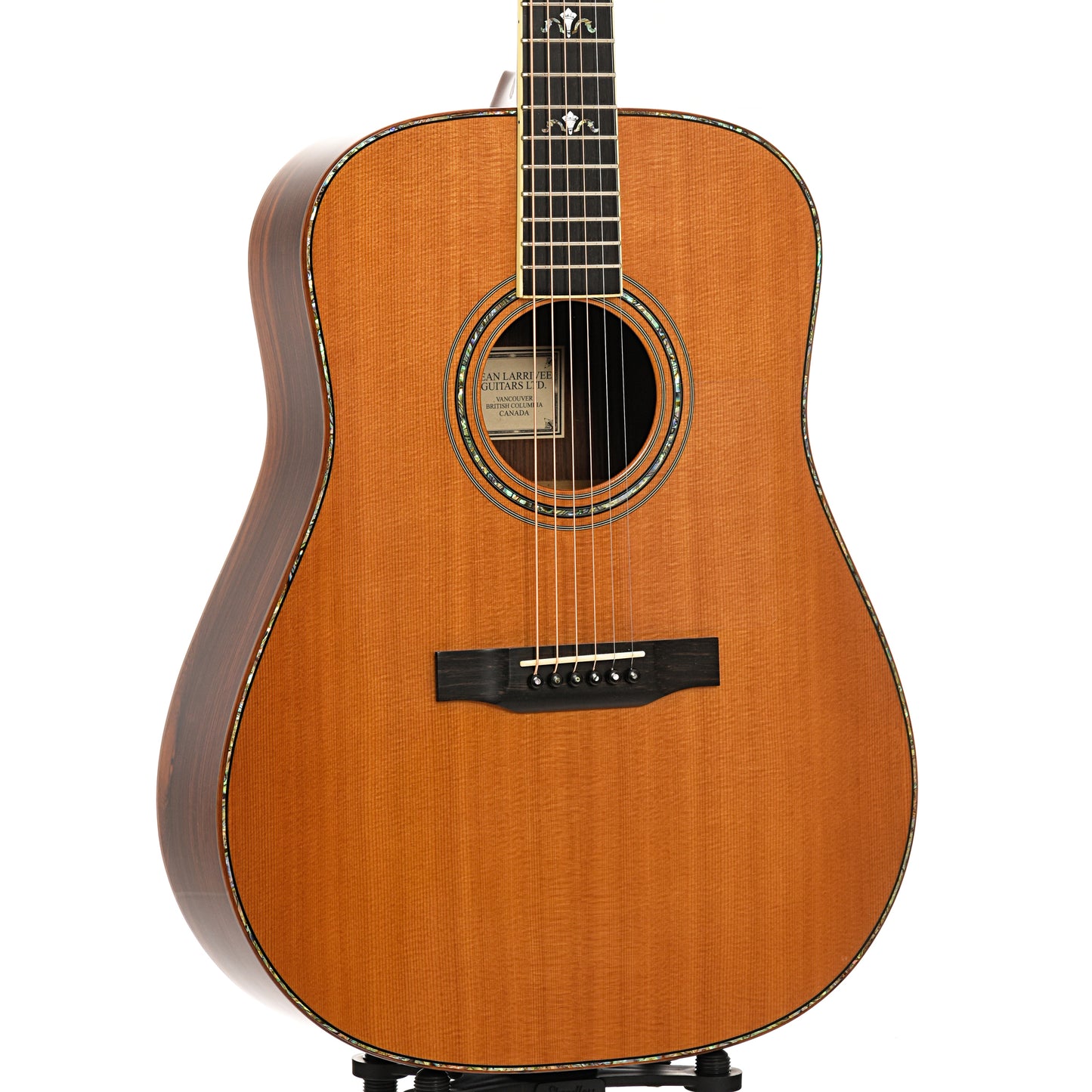 This fine Larrivee dreadnought plays easy and dazzles with Brazilian rosewood back and sides and abalone top purfling and rosette. Premium features include a spruce top, bound ebony fingerboard and torch inlays. Original hard shell case. Built in Canada. On consignment.