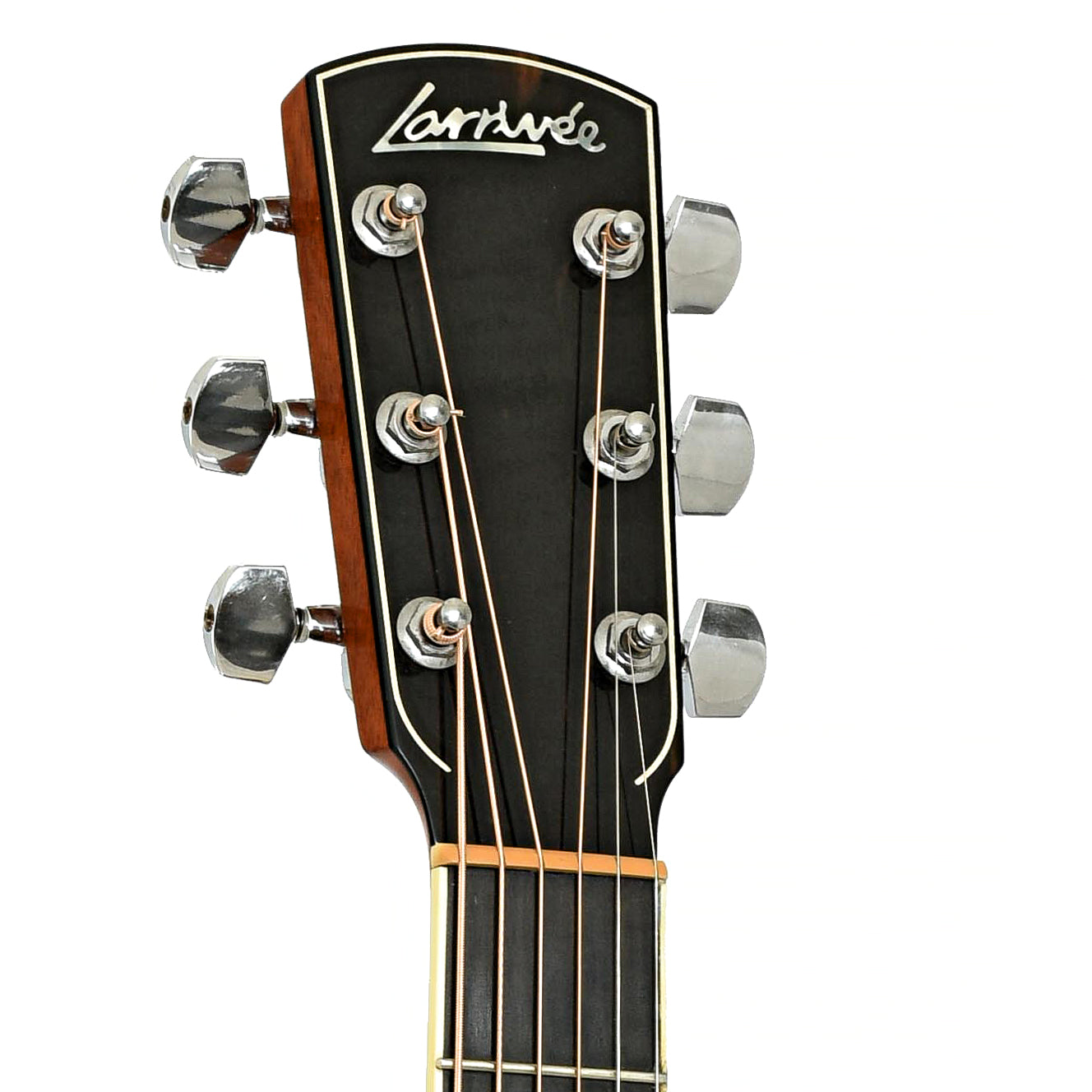 - Ebony peghead overlay, pearl log and purfling inlays