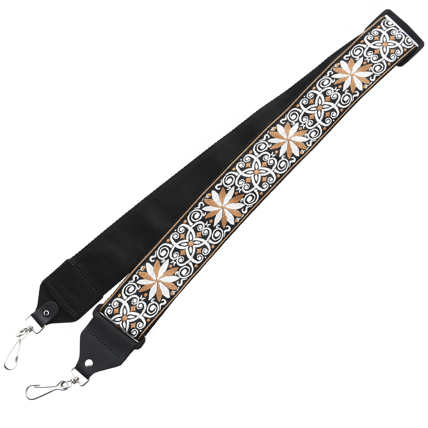 Polypropylene backing, leather ends, metal clips, and tri-glide adjustment; adjustable to 60". Yellow flower pattern.