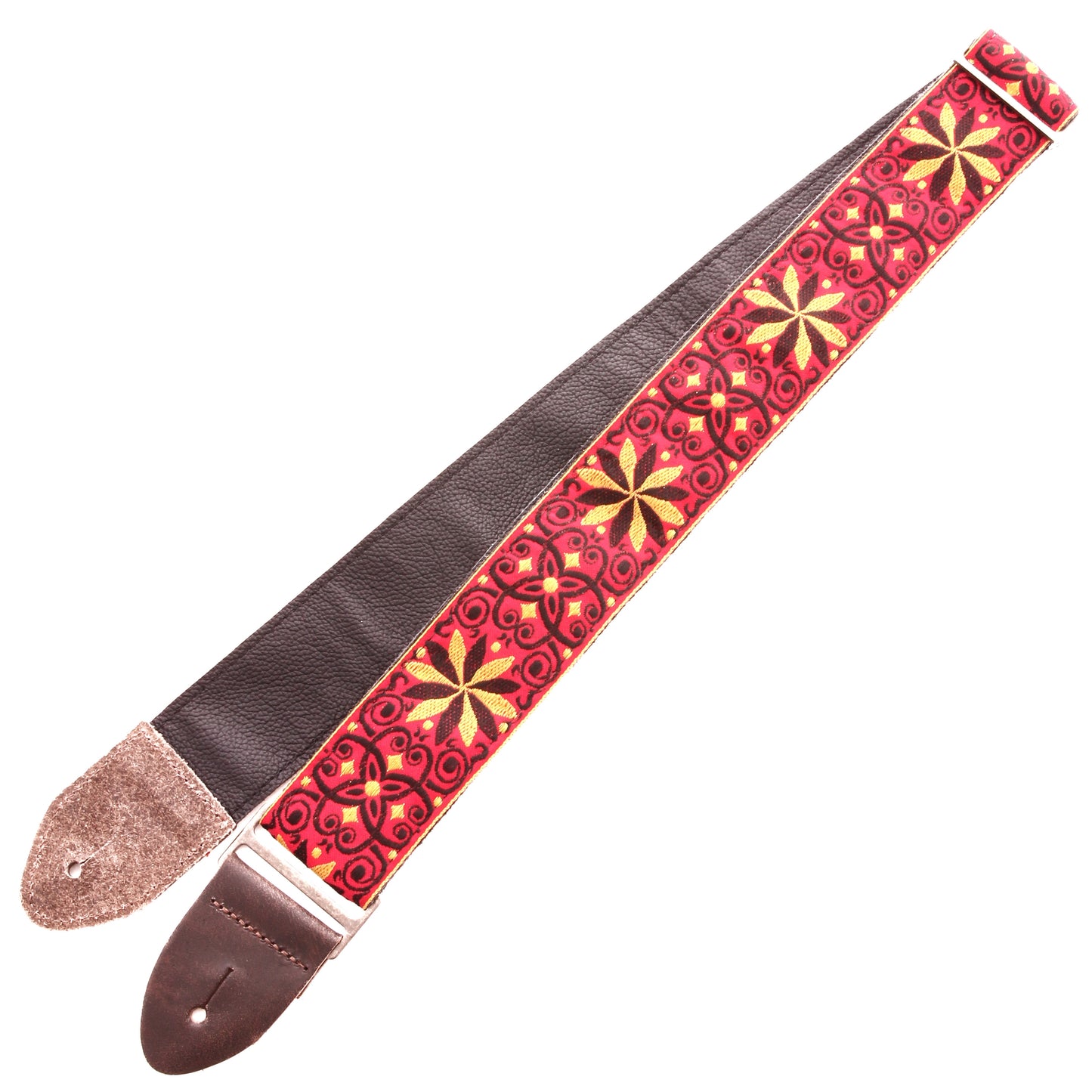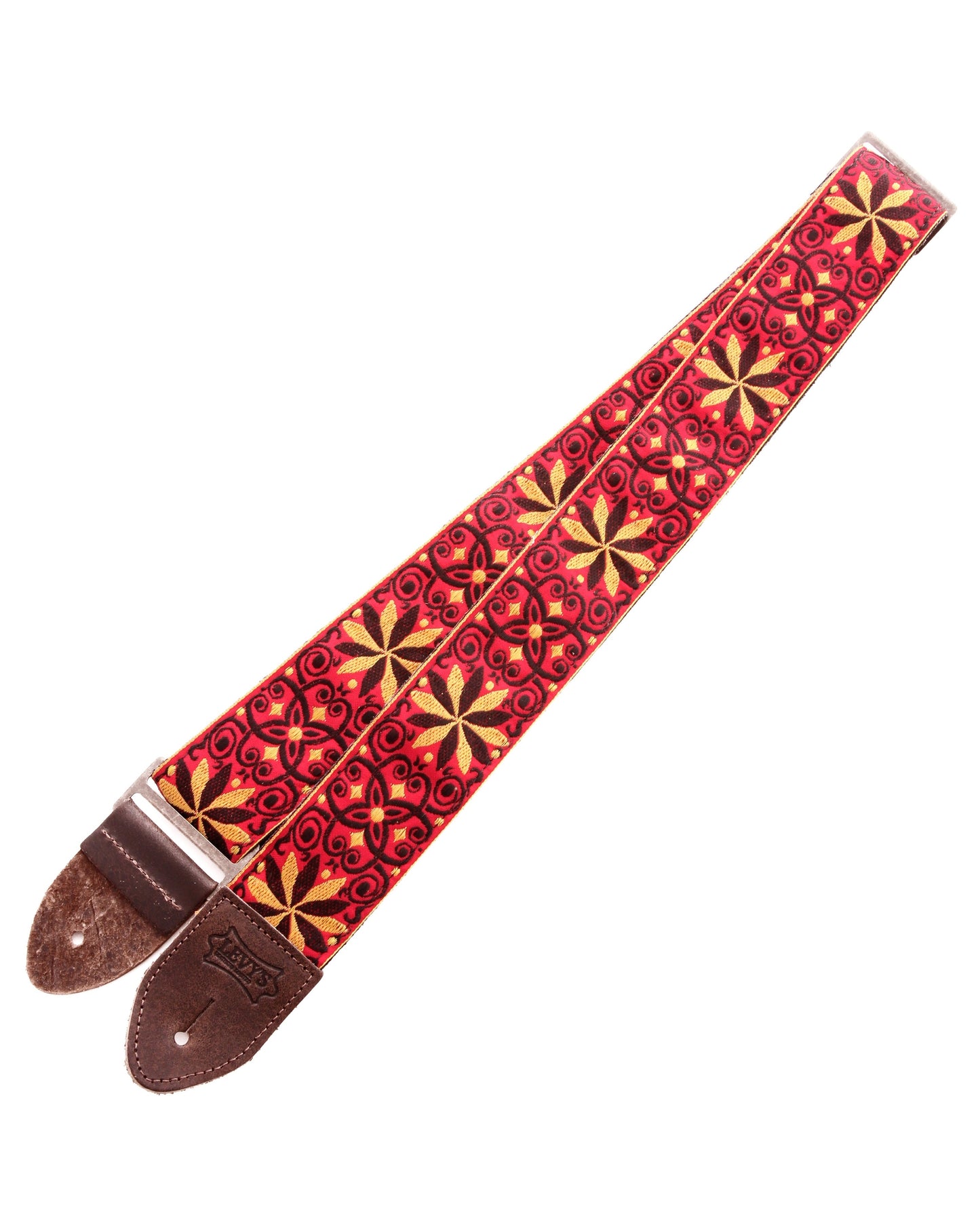 2" jacquard weave guitar strap with vintage Hootenanny design, soft leather backing, distressed leather ends with vintage Levy logo, and antique brass tri-glide adjustment. Red, yellow & black design.