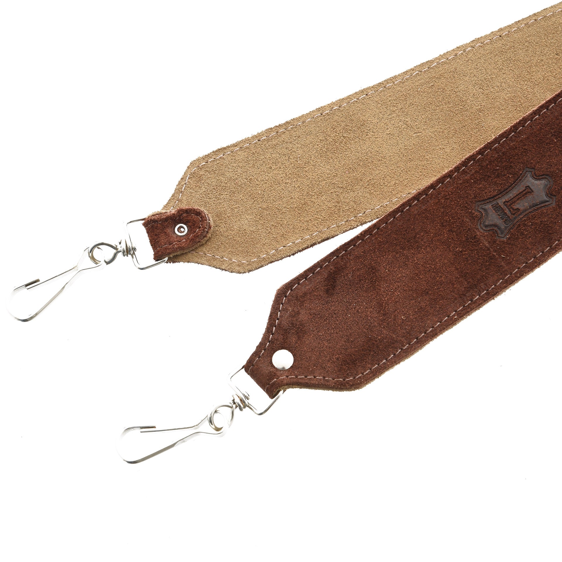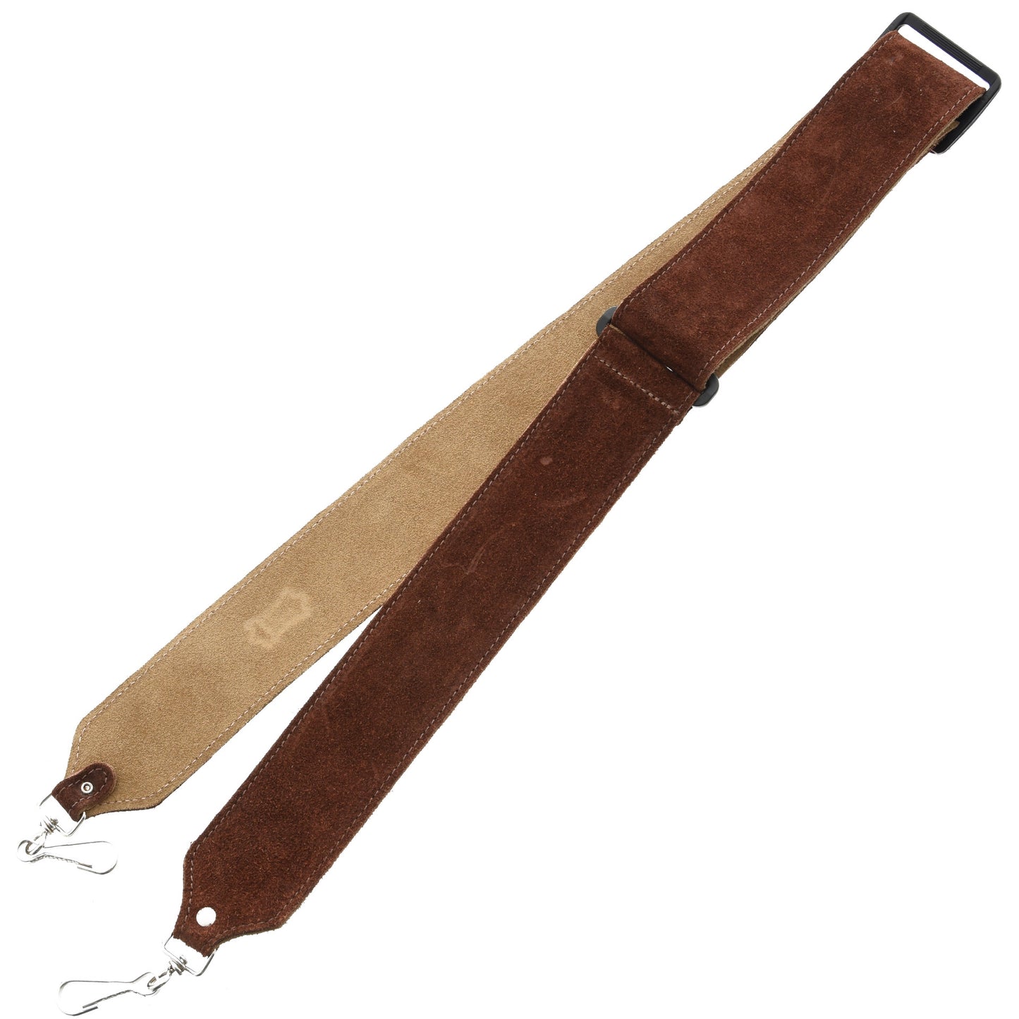 2" suede banjo strap with suede backing, metal clips, and tri-glide adjustment. Adjustable to 50", brown.