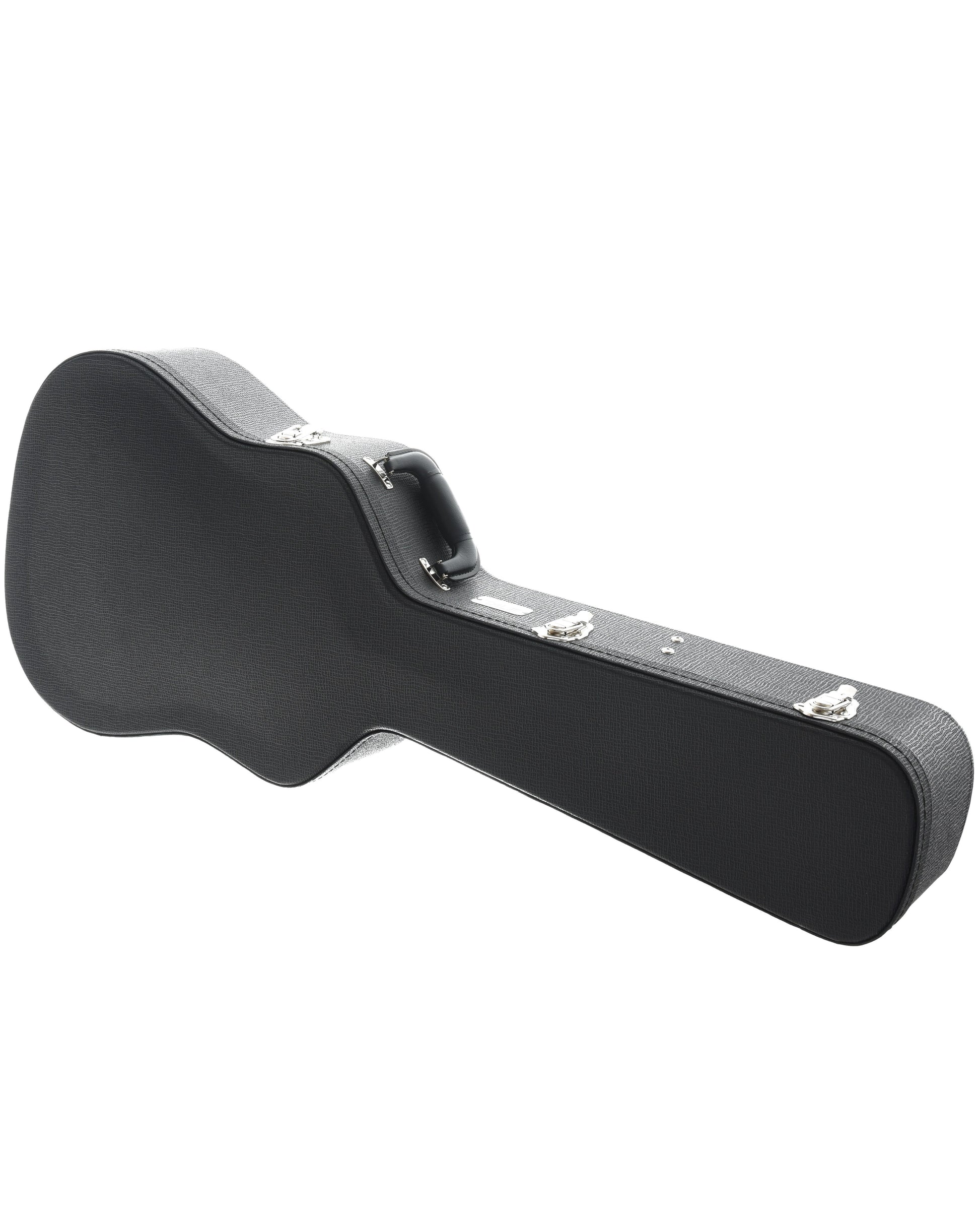 Canadian-made case with shaped wooden shell, arched lid, plush padded interior, rugged textured black covering. Body area contoured to fit 14-fret dreadnoughts, square-shoulder or slope-shoulder types.