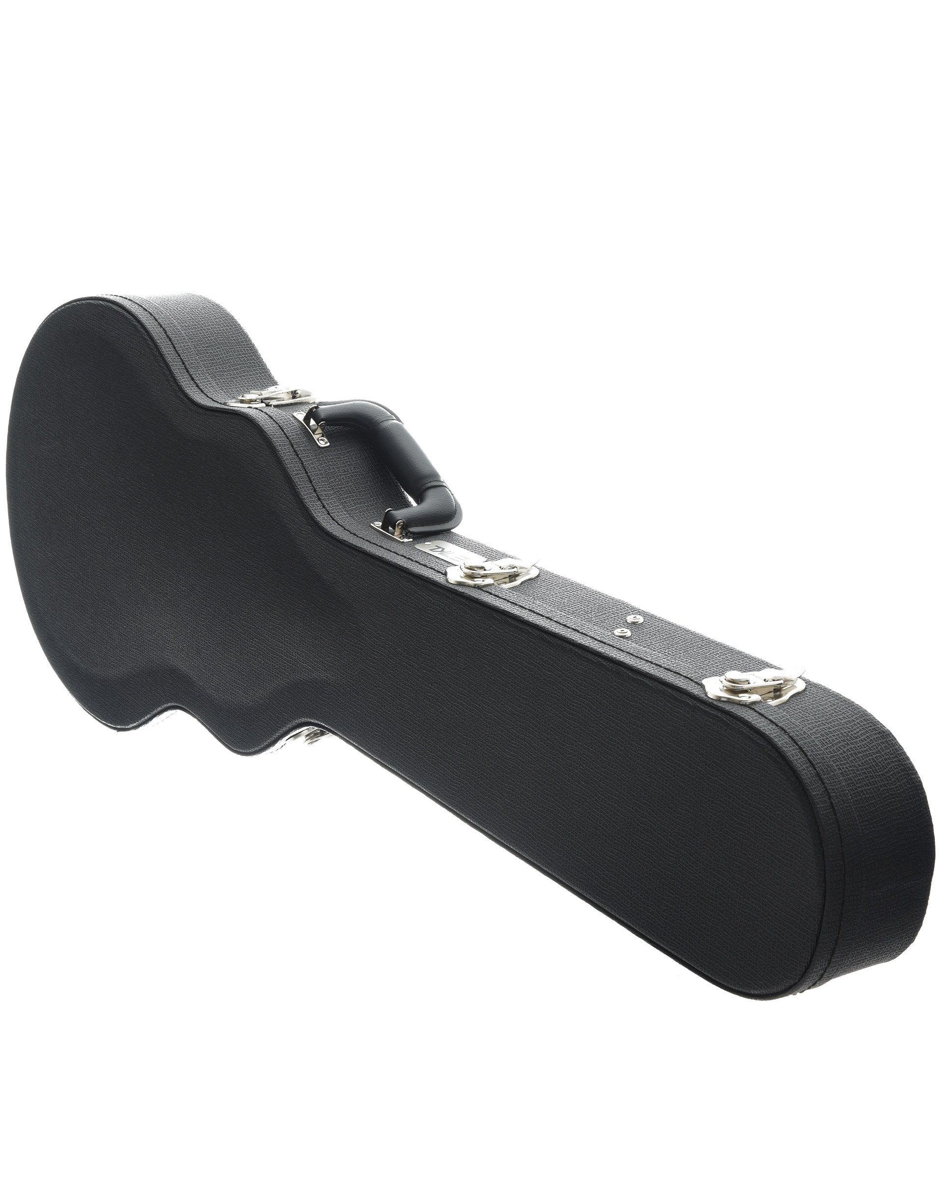 LTD Series case with shaped wooden shell, arched lid, plush padded interior, rugged textured black covering. Fits Les Paul Junior and similarly styled guitars with flatter neck angles.