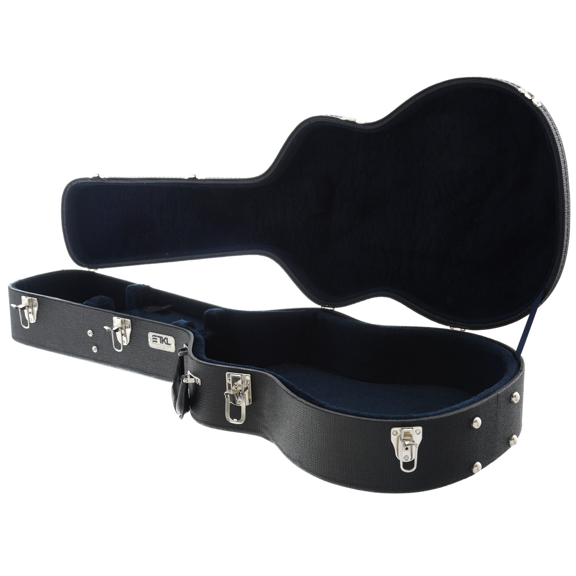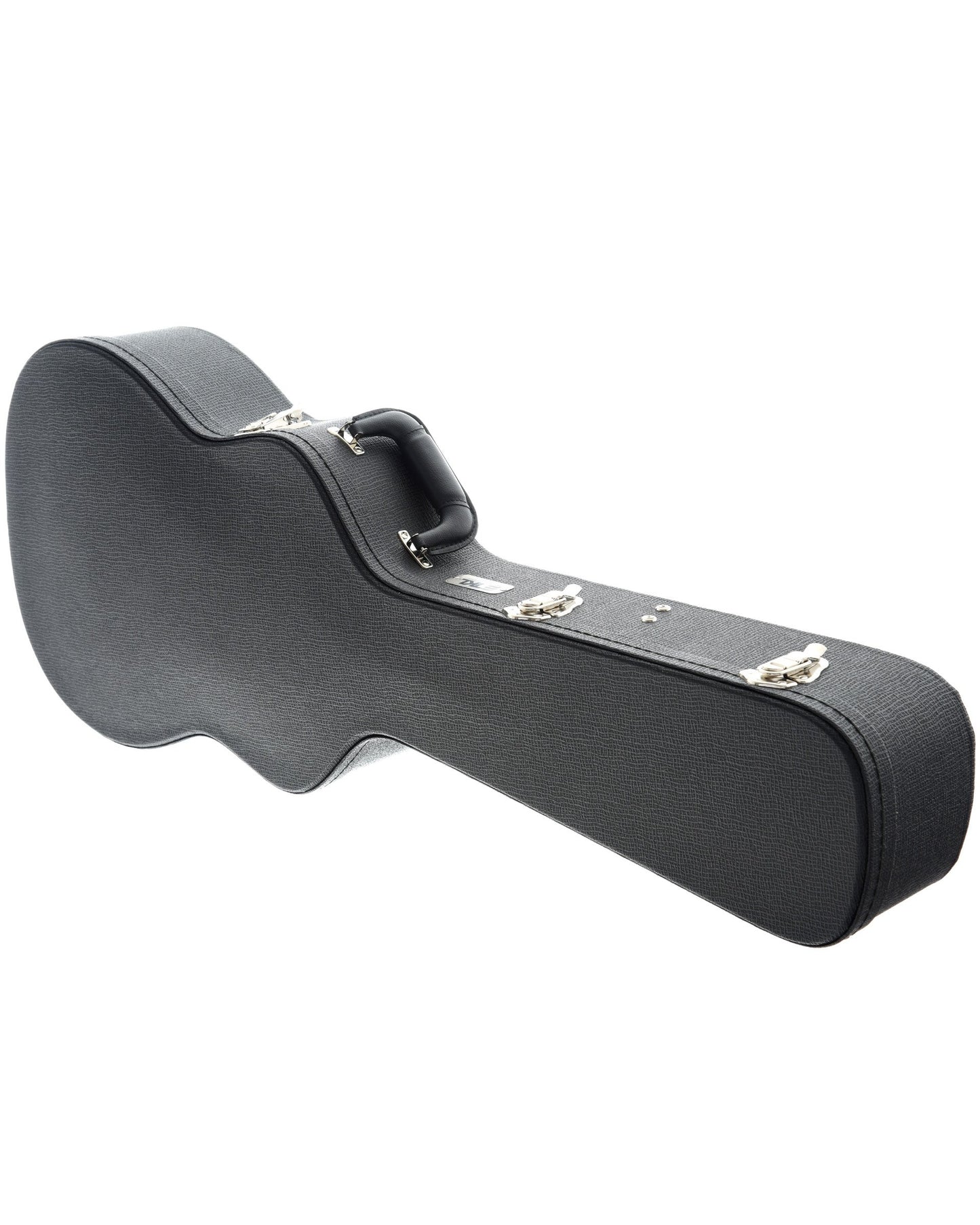 Canadian-made case with shaped wooden shell, arched lid, plush padded interior, rugged textured black covering. Fits squareneck or roundneck resonator guitars.