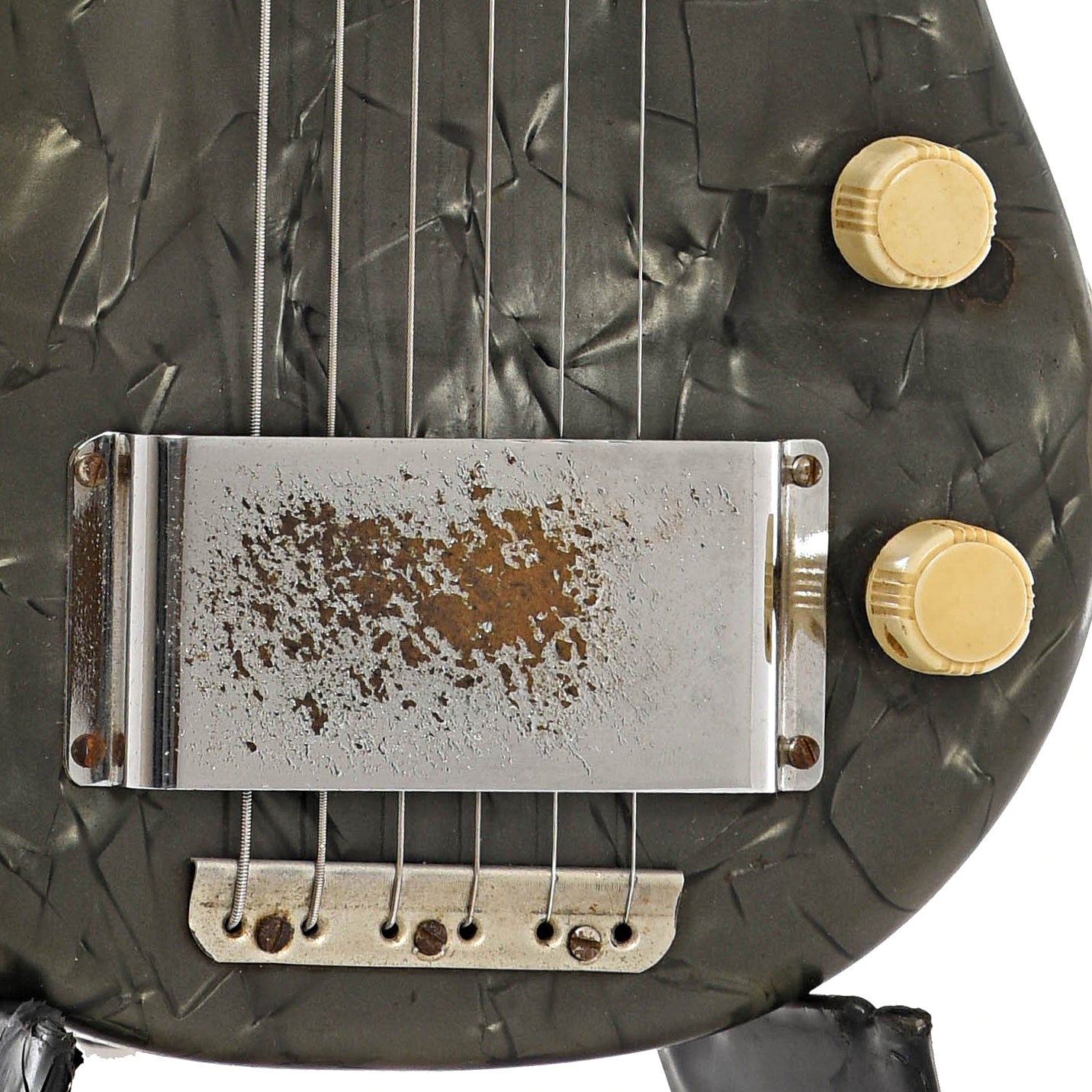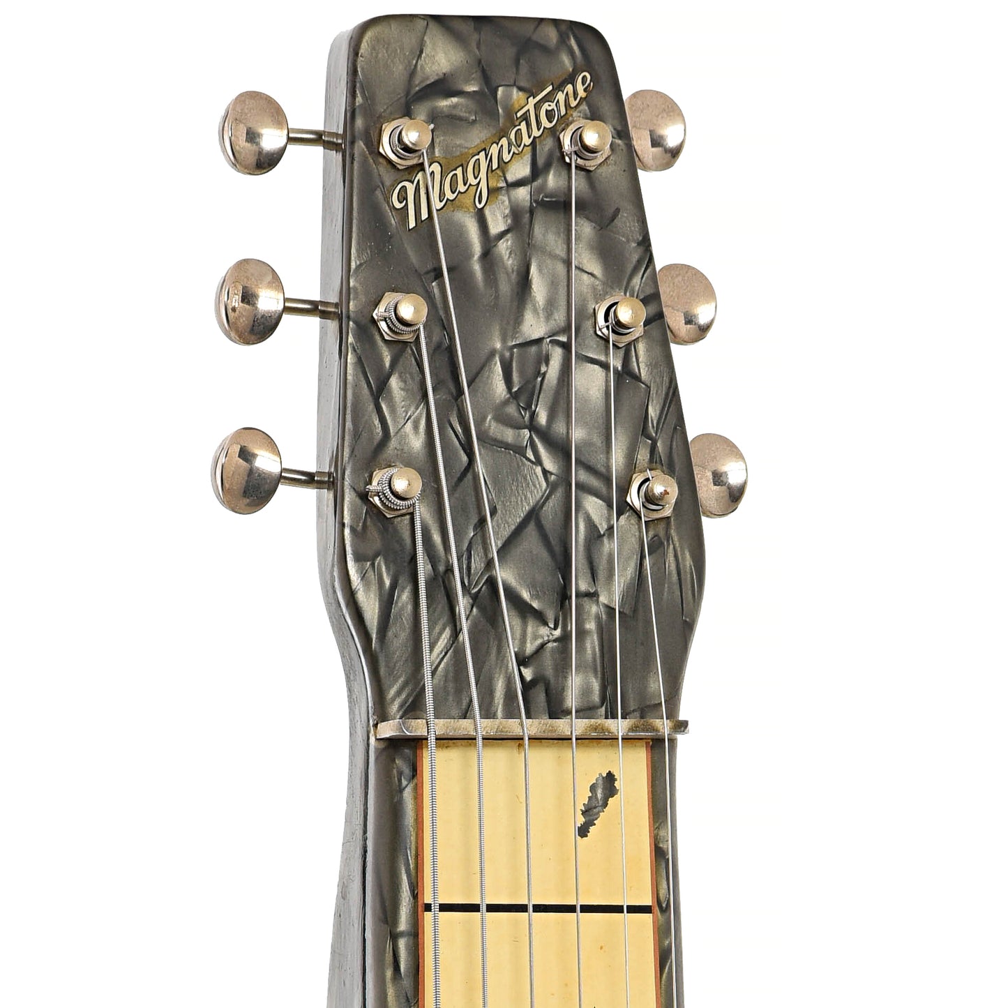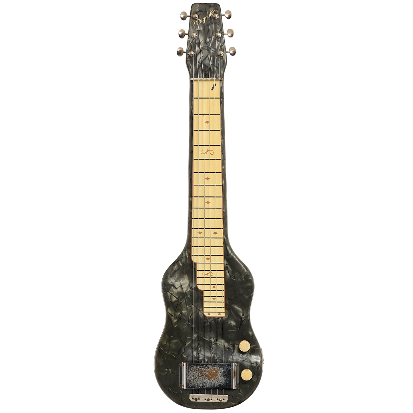 Play your favorite Hawaiian and steel guitar tunes now with this matching Magnatone guitar and amp set! The lap steel is equipped with single-coil pickup, a 22-1/4" scale (great for bar slants), with an adjustable tripod stand for stand-up playing. The amp kicks out around 5 watts of tube power thru a 6" Jensen speaker. Both have matching gray pearloid covering. Made in USA. On consignment.