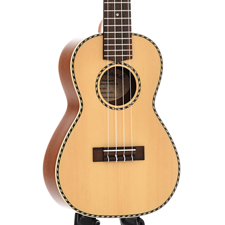 The Mainland Ukulele Classic Spruce Top Concert combines all-solid spruce and mahogany for good sound. With "rope" binding and lightweight geared tuners designed for ukes, it's an attractive, good sounding choice for the discerning player.