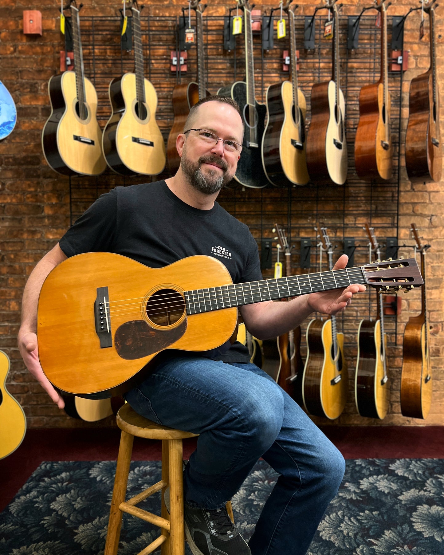 This 1931 Martin 00-18 is a well-played 12-fret acoustic that’s ready for more. It features an X-braced spruce top, mahogany back, sides, and neck, and rosewood body binding. It has an ebony fingerboard, a replaced ebony bridge, and 3-on-a-plate tuners on a slotted peghead with a hot-stamped logo. Beautiful tone, easy playing. Includes a hard shell case. Made in the USA. On consignment.