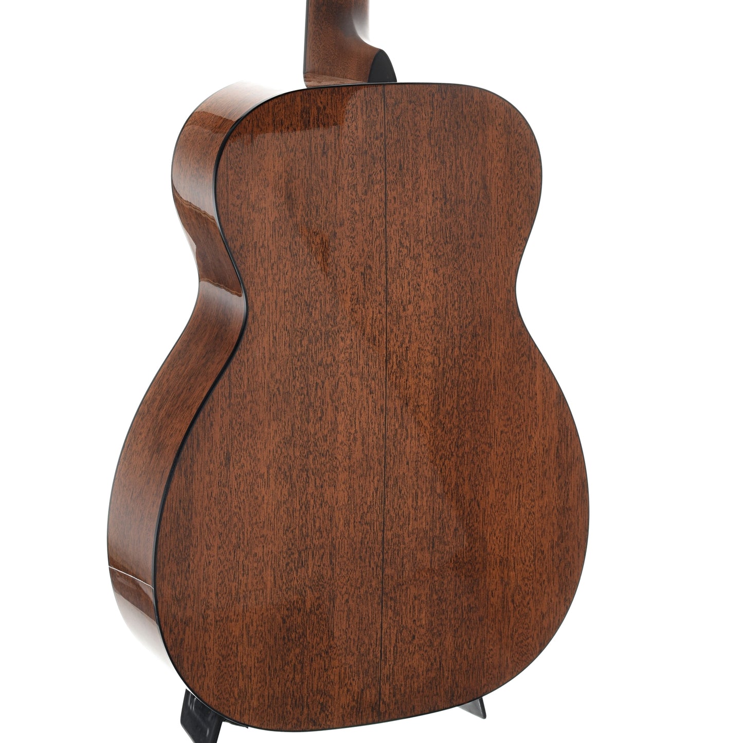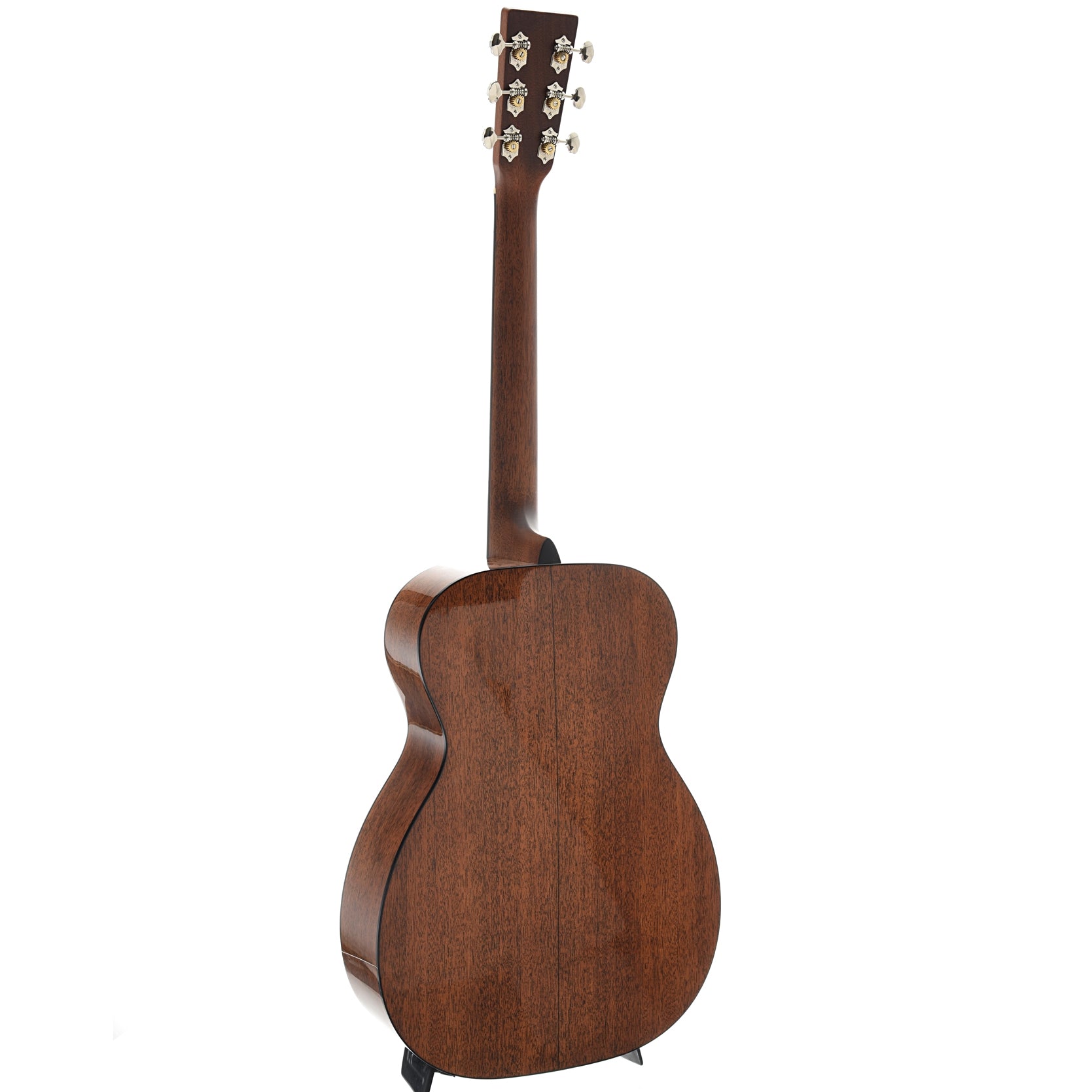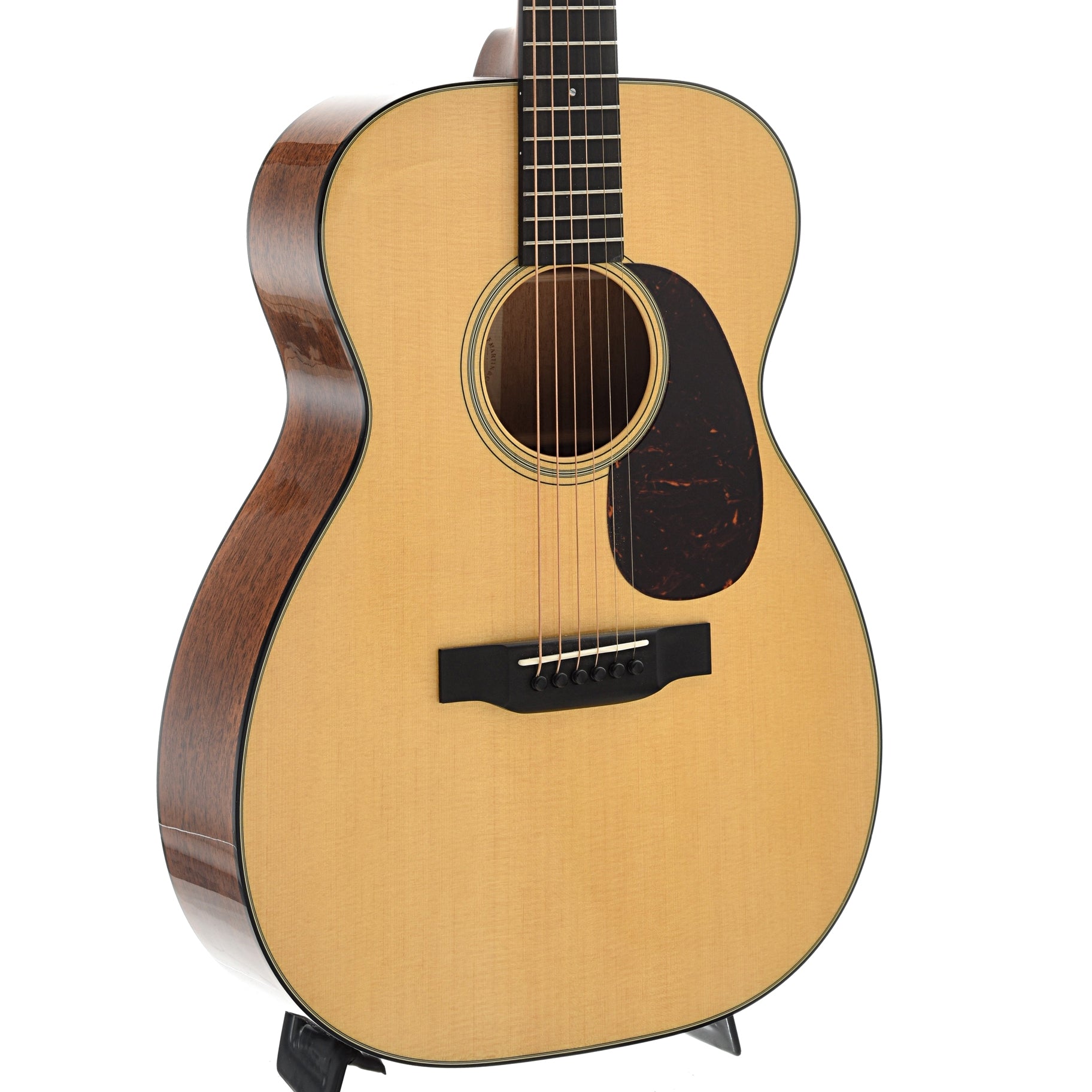 00-size body of solid mahogany & Sitka spruce, scalloped 1/4" top bracing, tortoise binding, layered black/white top trim, old Style 18 rosette, delmar tortoise pickguard. Modified Low Oval neck profile with Performing Artist taper (1-3/4" wide at nut, 2-1/8" at 12th fret, 2-3/16" string spacing at saddle), ebony fretboard (24.9" scale), old Style 18 abalone dots, nickel butterbean tuners. Full gloss body finish, aging toner on top. Martin wooden archtop hardshell case (#434), MSP7100 light gauge strings.