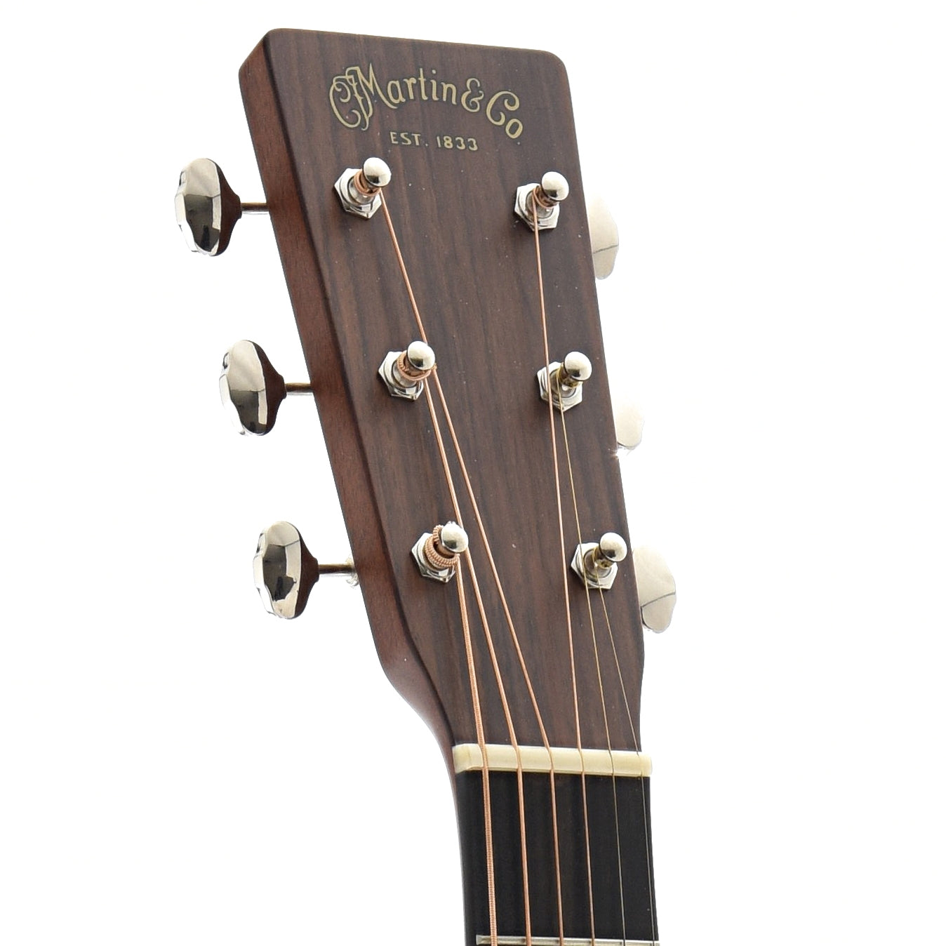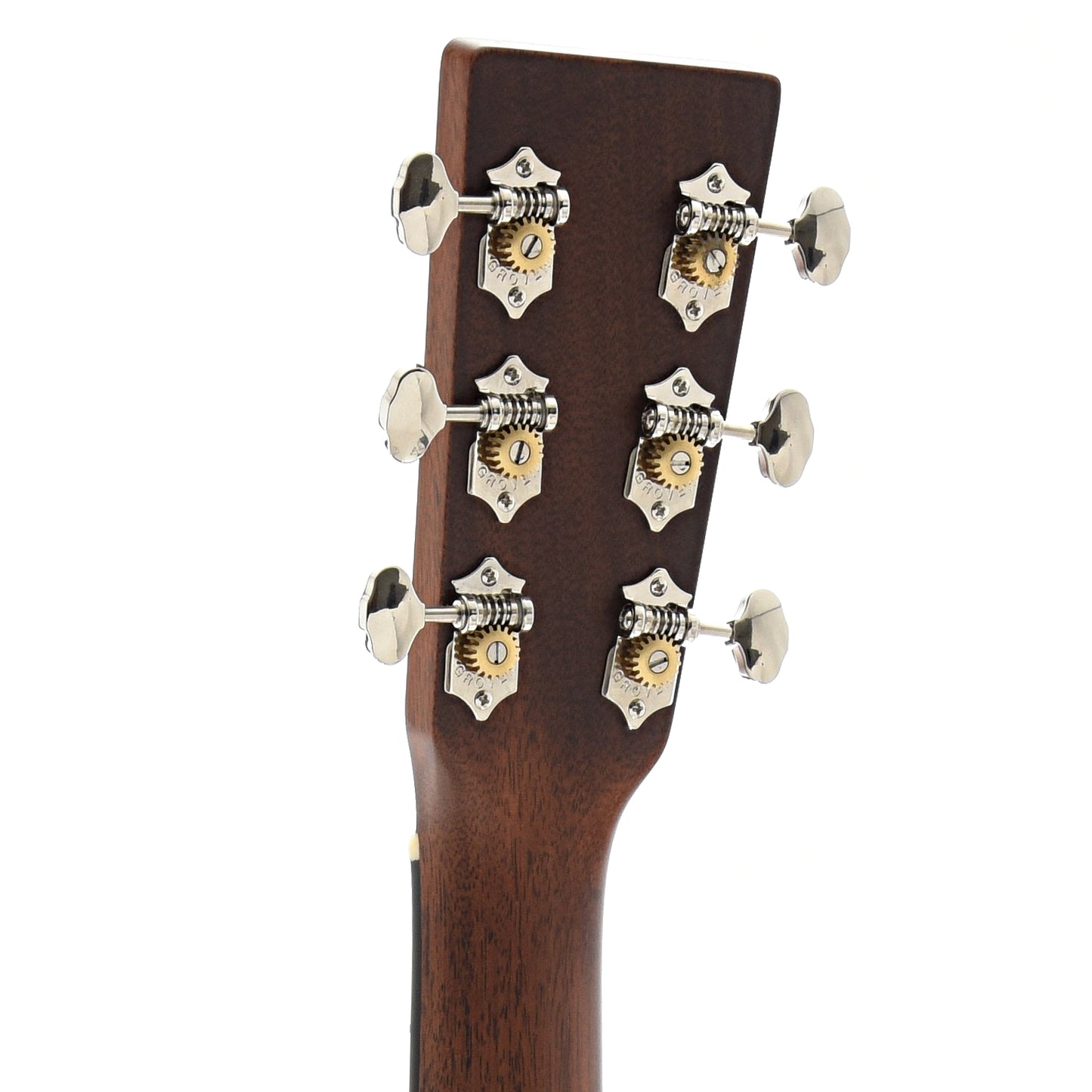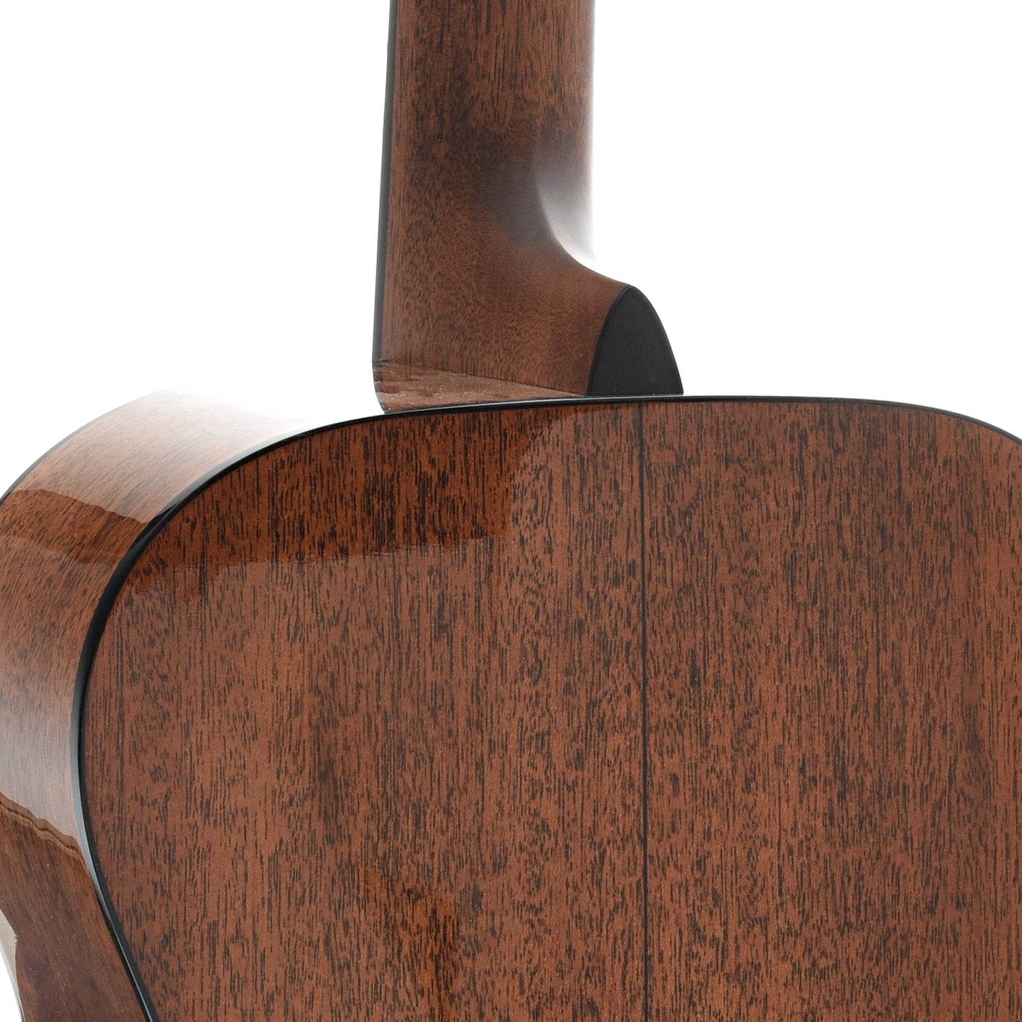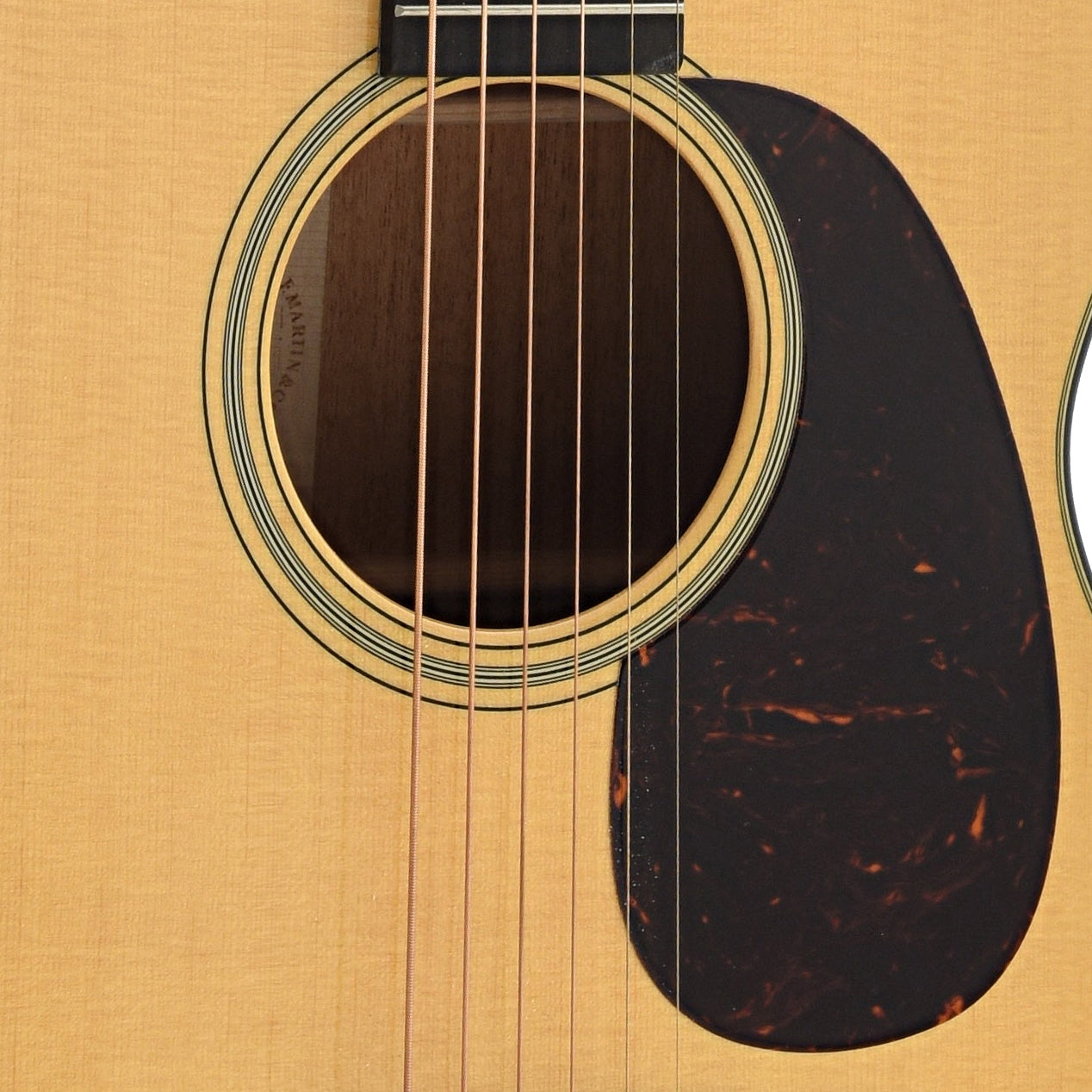 00-size body of solid mahogany & Sitka spruce, scalloped 1/4" top bracing, tortoise binding, layered black/white top trim, old Style 18 rosette, delmar tortoise pickguard. Modified Low Oval neck profile with Performing Artist taper (1-3/4" wide at nut, 2-1/8" at 12th fret, 2-3/16" string spacing at saddle), ebony fretboard (24.9" scale), old Style 18 abalone dots, nickel butterbean tuners. Full gloss body finish, aging toner on top. Martin wooden archtop hardshell case (#434), MSP7100 light gauge strings.