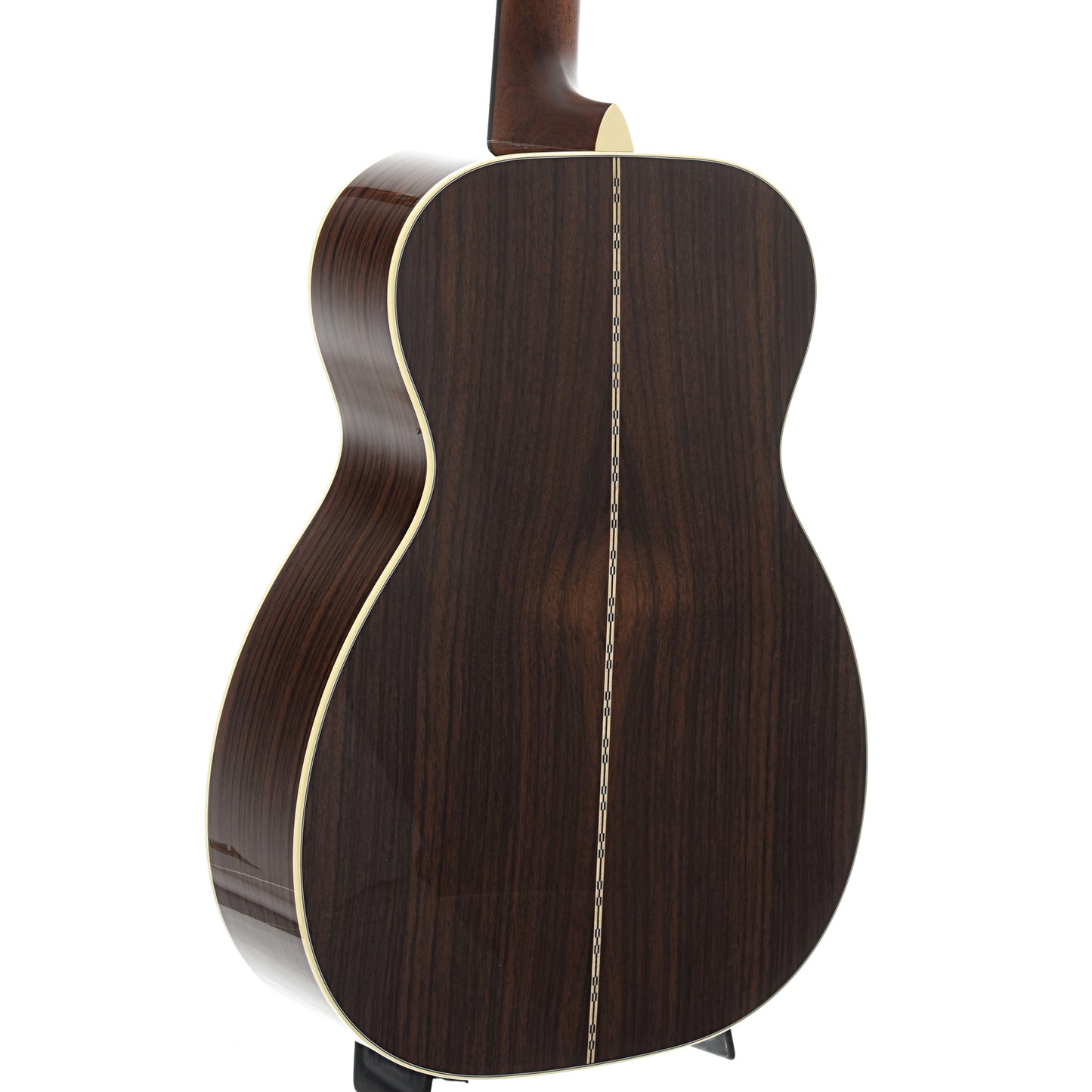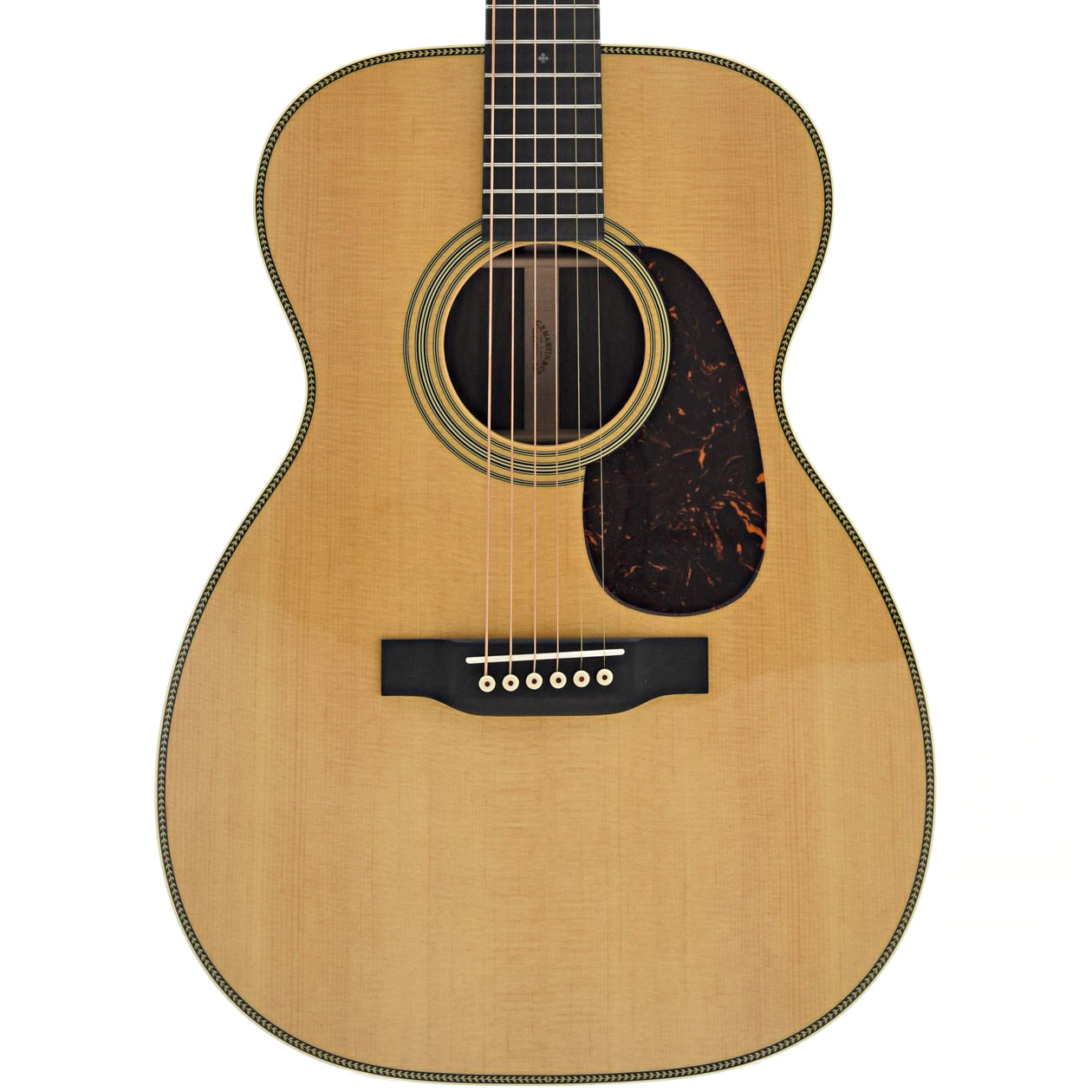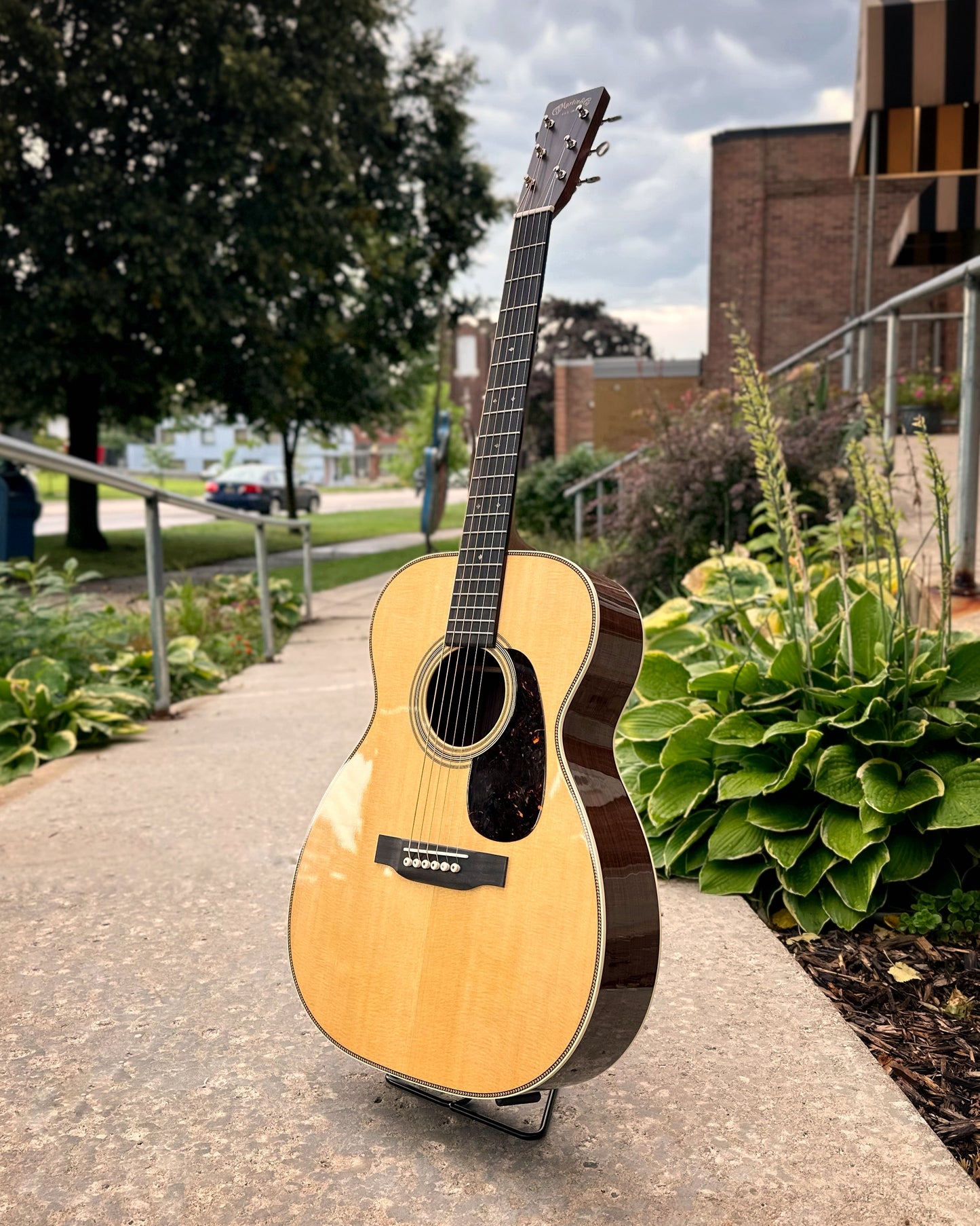 A classic small body guitar, the Martin 00-28 features a solid Sitka spruce top with aging toner, Indian rosewood back and sides, and a 14-fret Modern Modified Low Oval mahogany neck. Vintage inspired appointments include herringbone top trim, antique white binding, a tortoise plastic pickguard, and nickel open gear tuners. The High Performance fretboard taper (1-3/4" wide at nut, 2-1/8" at the 12th fret, 2-5/32" string spacing at the saddle) and shorter 24.9" scale, combined with the small body, make this very comfortable to hold and play.