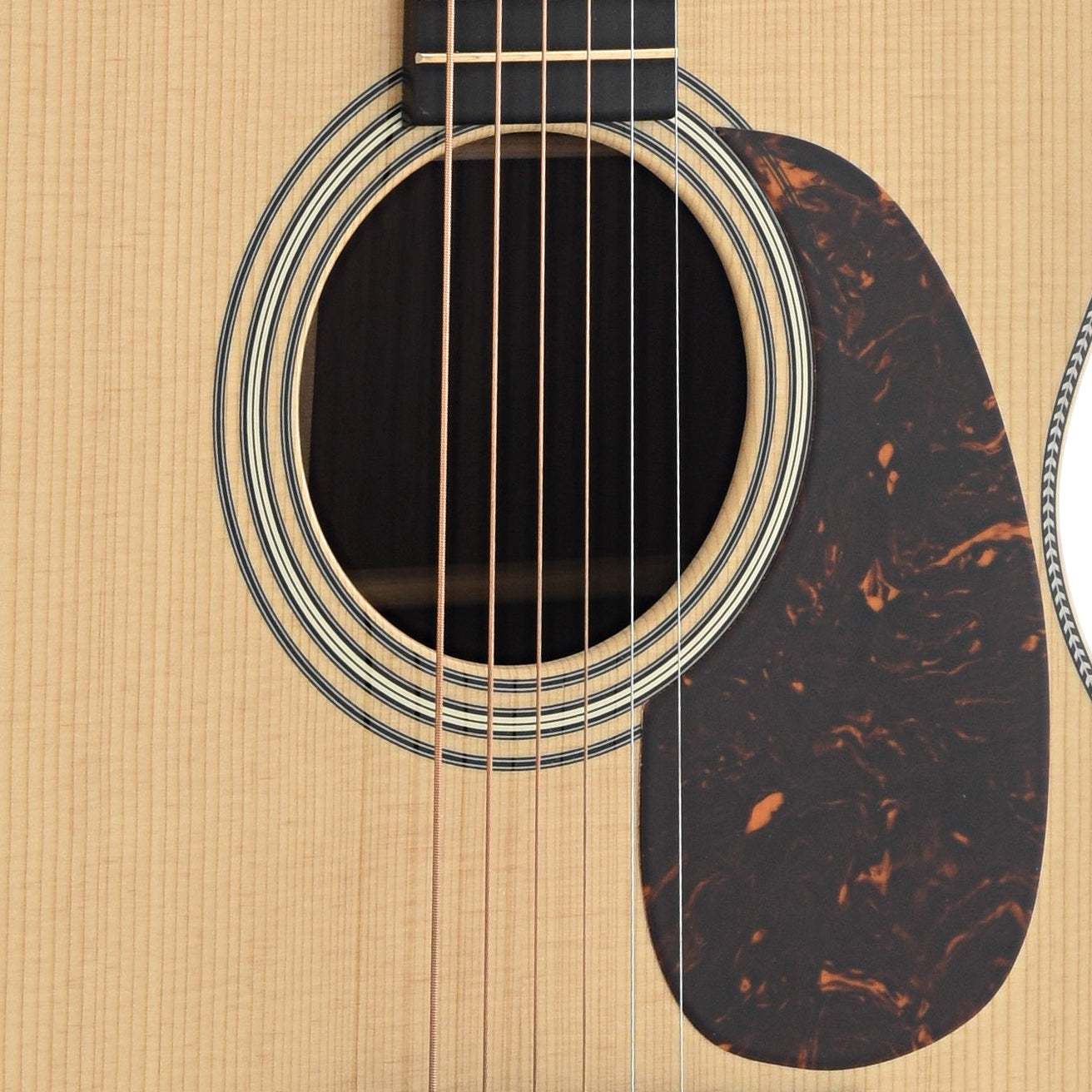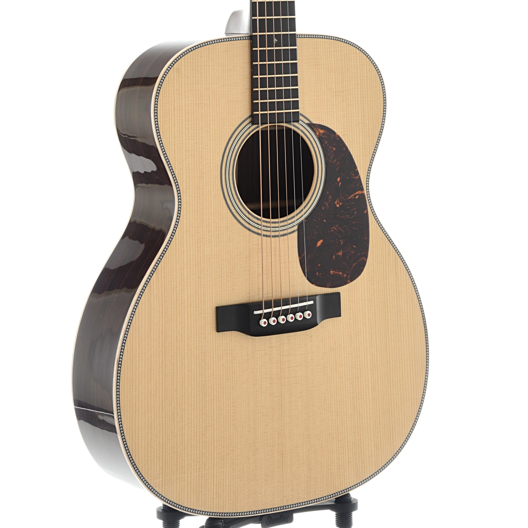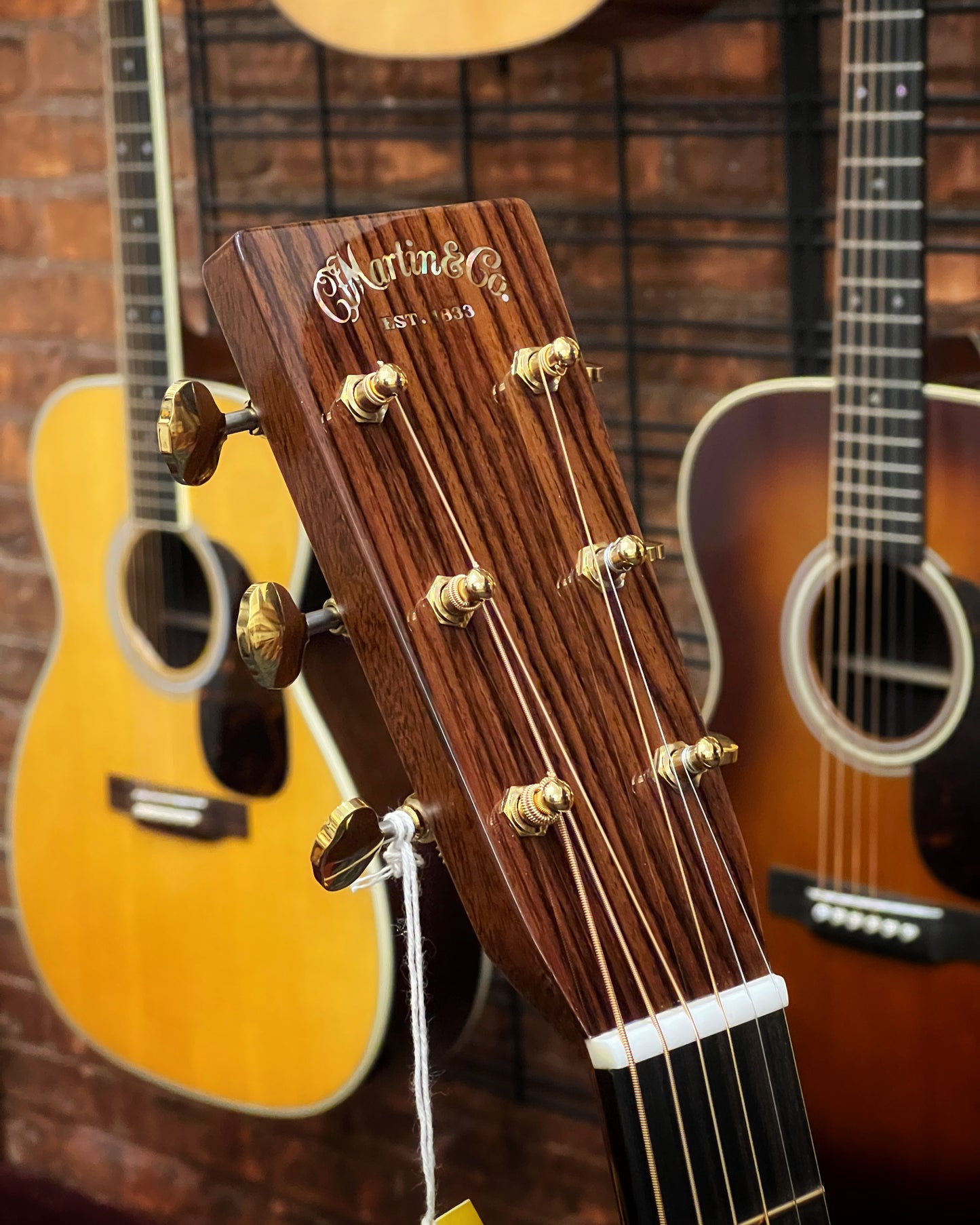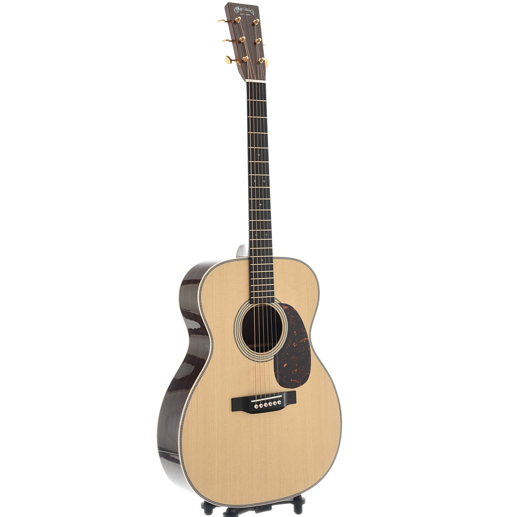 The 000‐28 Modern Deluxe is an intriguing mix of classic Martin style and modern innovations. Vintage-style features include a Sitka spruce Vintage Tone System (torrefied) top with herringbone trim, a dovetail neck joint, and natural protein glue construction. The look is unlike anything in Martin's production line to date, with European flamed maple binding, stylish gold frets, gold open‐gear tuners, and a 1930s style script logo inlaid in pearl on the headstock. Modern features include a titanium truss rod, Liquidmetal bridge pins with red dots, and a carbon fiber bridgeplate that boosts volume without adding weight. The new neck shape is designed for maximum hand comfort up and down the fretboard.