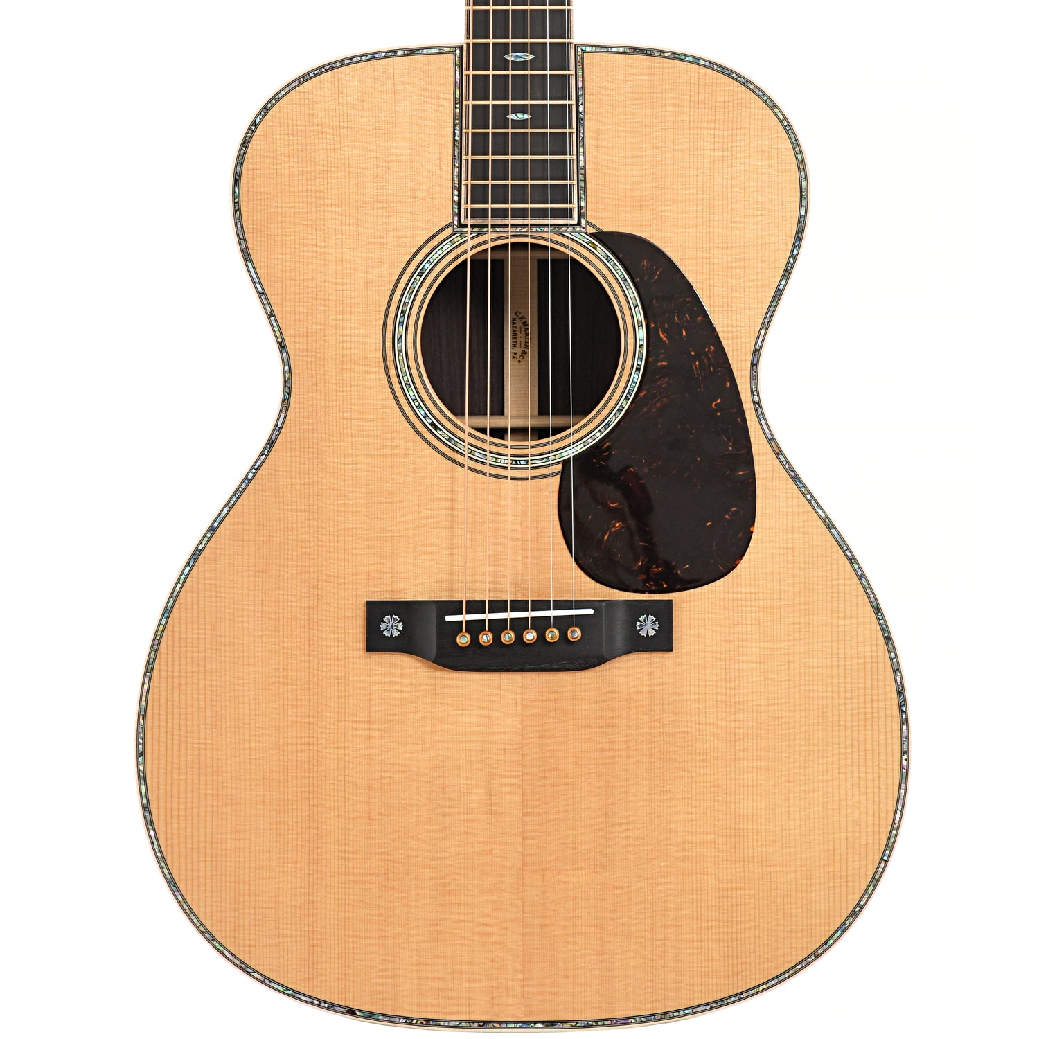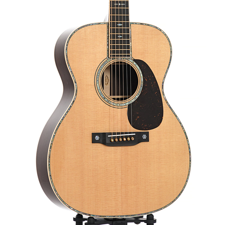 The Martin 000-42 Modern Deluxe adds 42 styling to the Modern Deluxe package. Built of East Indian rosewood with a Sitka spruce VTS (torrefied) top, and flamed maple binding, it has the traditional abalone top border, plus a torch peghead inlay in abalone bordered with white pearl. Fingerboard & bridge snowflakes are also abalone bordered with pearl.