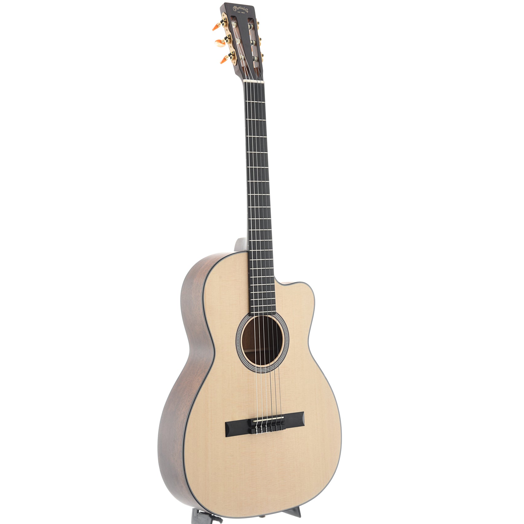 12-fret 000 cutaway body of solid mahogany & Sitka spruce. Features a gloss finish on the top and satin back and sides, herringbone rosette, and ebony fretboard with 1-7/8" nut. Fishman Matrix VT Enhance Pickup features soundhole-mounted volume and tone control. Martin softshell case included.