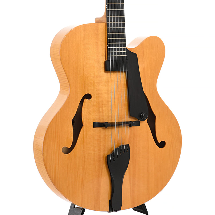 - Laminated X-braced arched spruce top