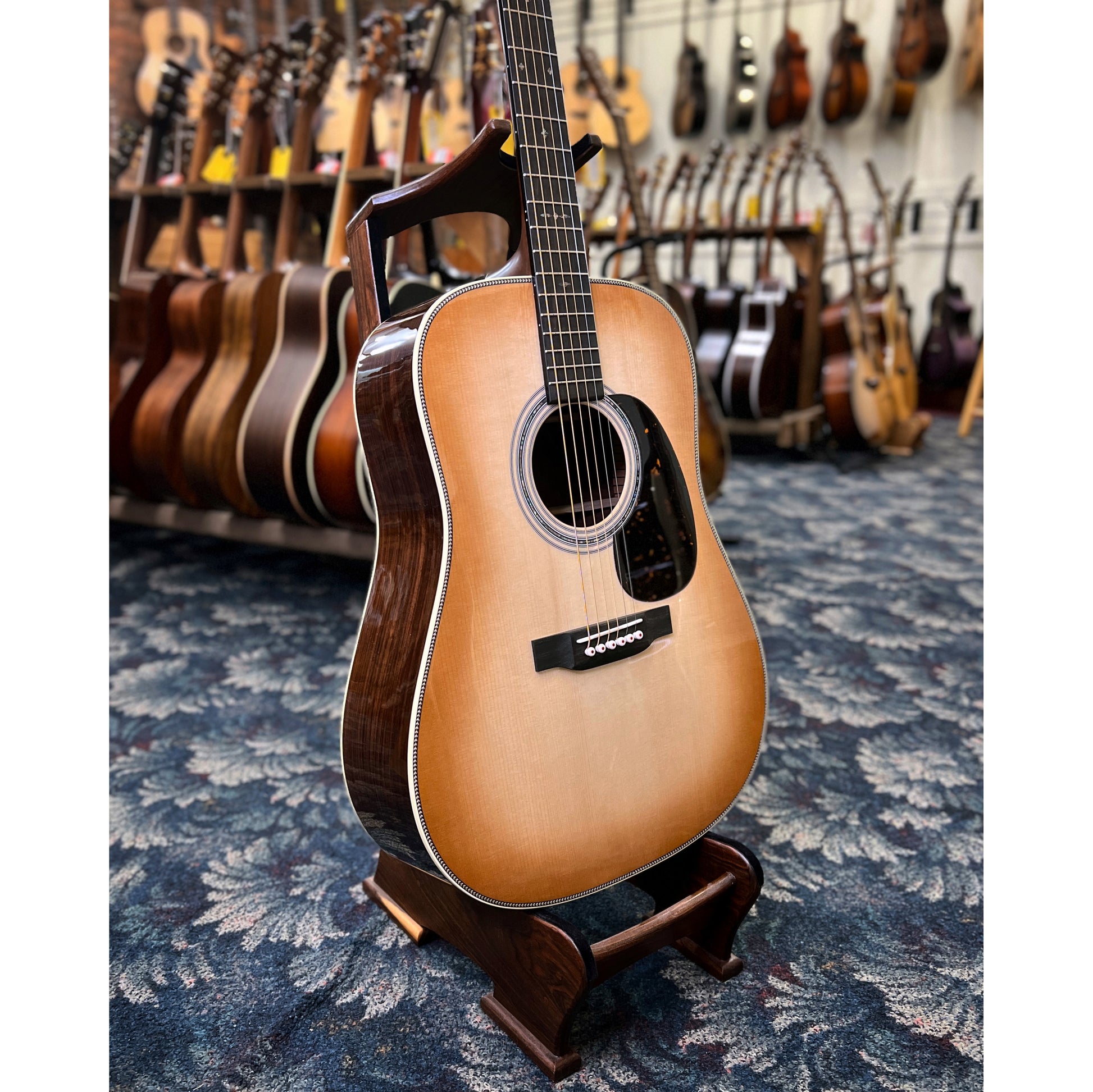 Beautiful Martin Custom Dreadnought Wild Grain East Indian rosewood and a Toast Burst Adirondack spruce top with abalone rosette and 28-style herringbone inlay. Top is thin-sanded (Authentic Thickness) and has Golden Era scalloped braces for dynamite tone!